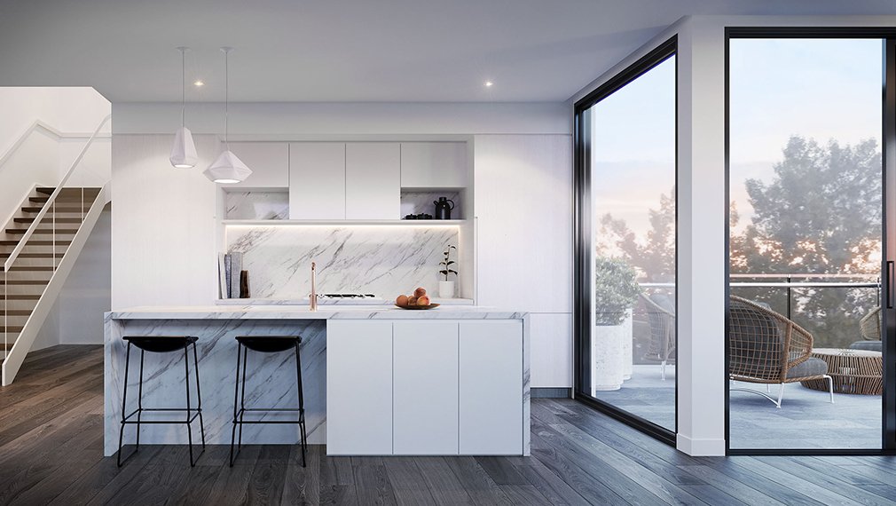 Renowned Peddle Thorp Architects’ avant-garde design and elegant styling is showcased in this boutique collective of tri-level homes in picturesque Glen Iris. The ultra- contemporary façade features a stunning textual combination of natural timbers juxtaposed with rendered and stone cladding finishes that provide a soft visual blend with the surrounding. Floor-to-ceiling aluminium windows and private terraces maximise relaxation options in this unique offering of superb craftsmanship.