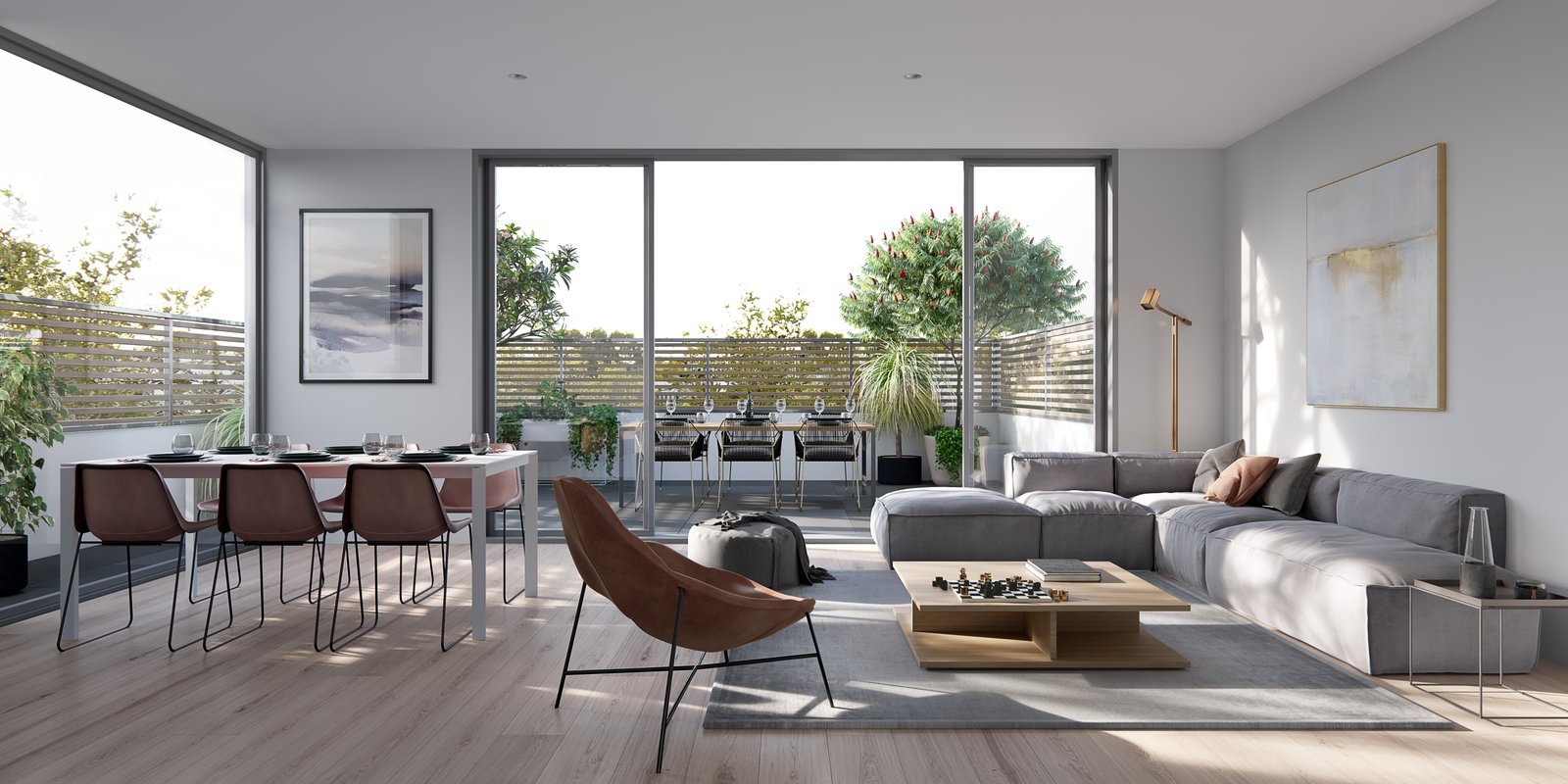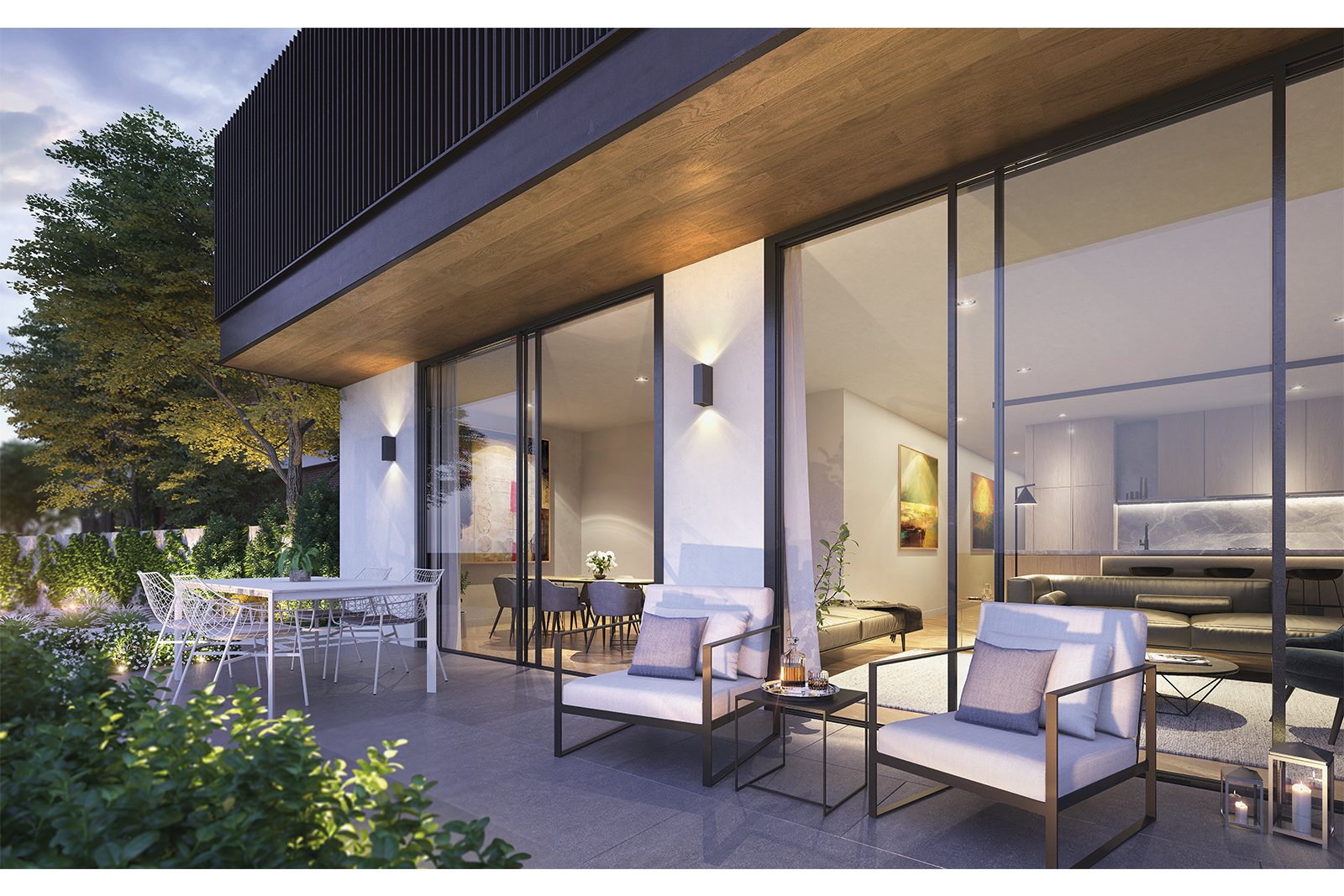 The living area is filled with natural light through full-height windows and doors, allowing a space where living and dining zones blend seamlessly for an easy transition from dining to relaxation. A warm palette of natural tones and textures paired with European oak flooring, showcases timeless style conducive to personal accentuation.