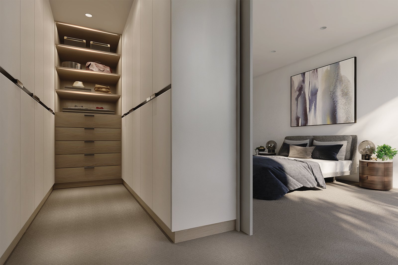 Ewert Leaf’s astute attention to quality and functionality is expressed in the elegant kitchen area. A sleek neutral palette of oak custom joinery with stylish warm-toned metal finishes complement the stunning marble stone benchtops and splashblacks illuminated by soft feature lighting. The discerning chef will appreciate the spacious walk-in pantry and fully integrated European appliances, perfect for everyday cooking and more formal occasions.