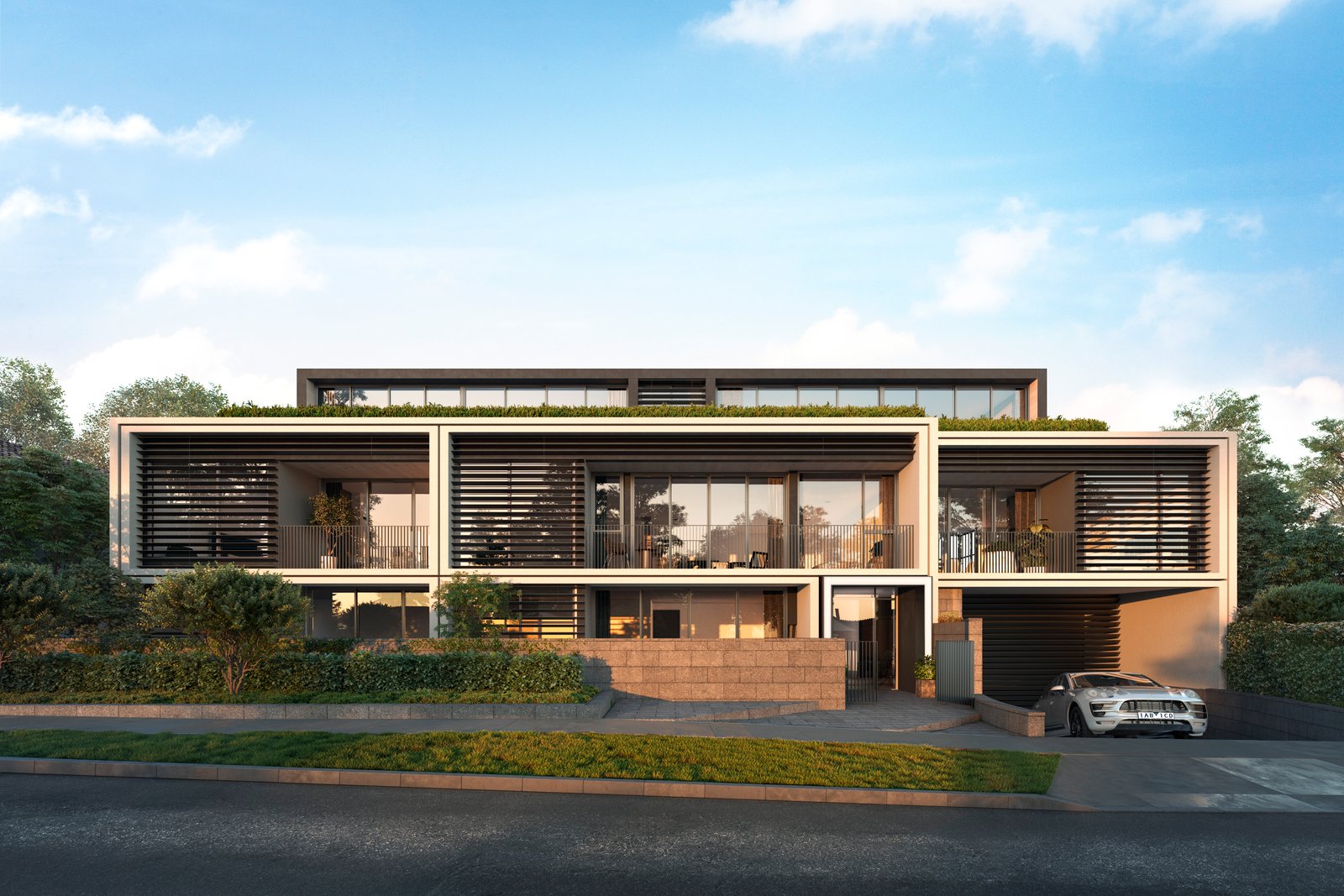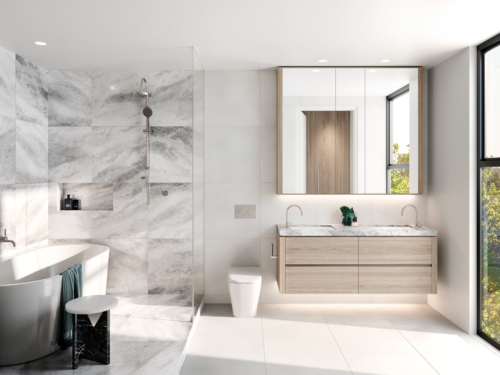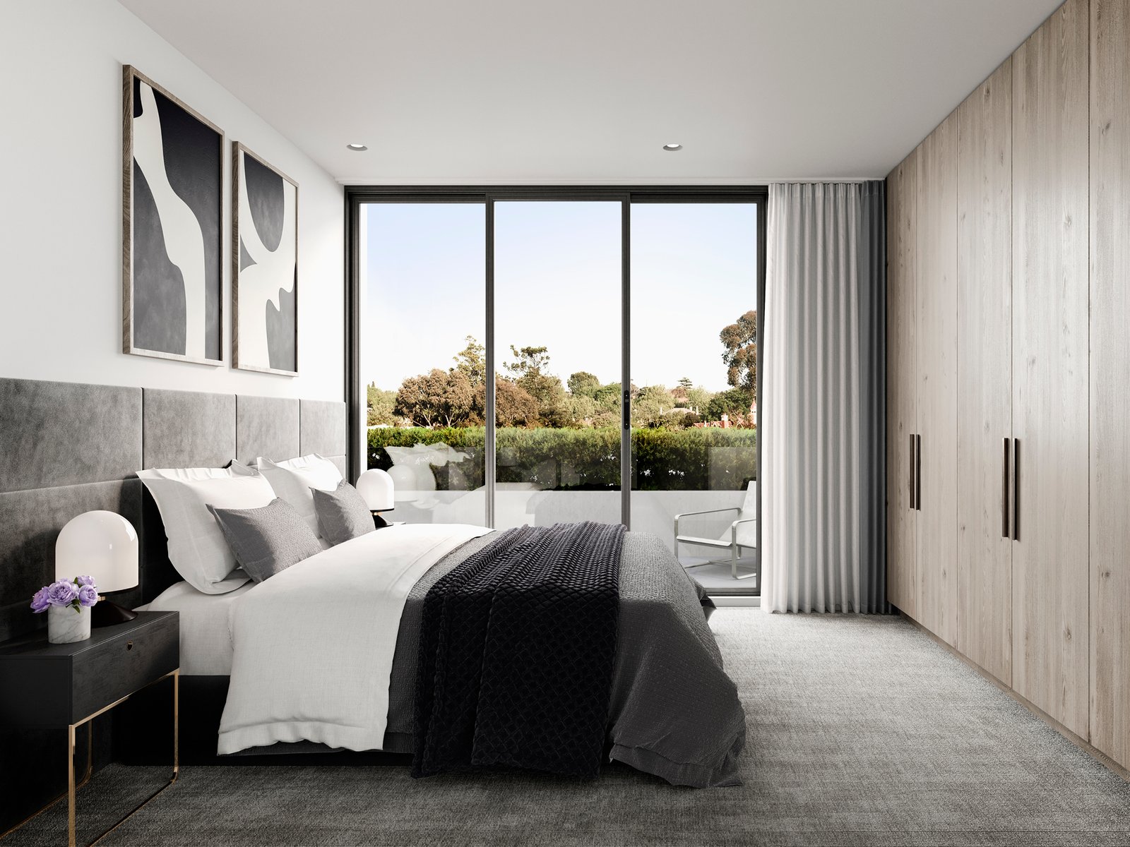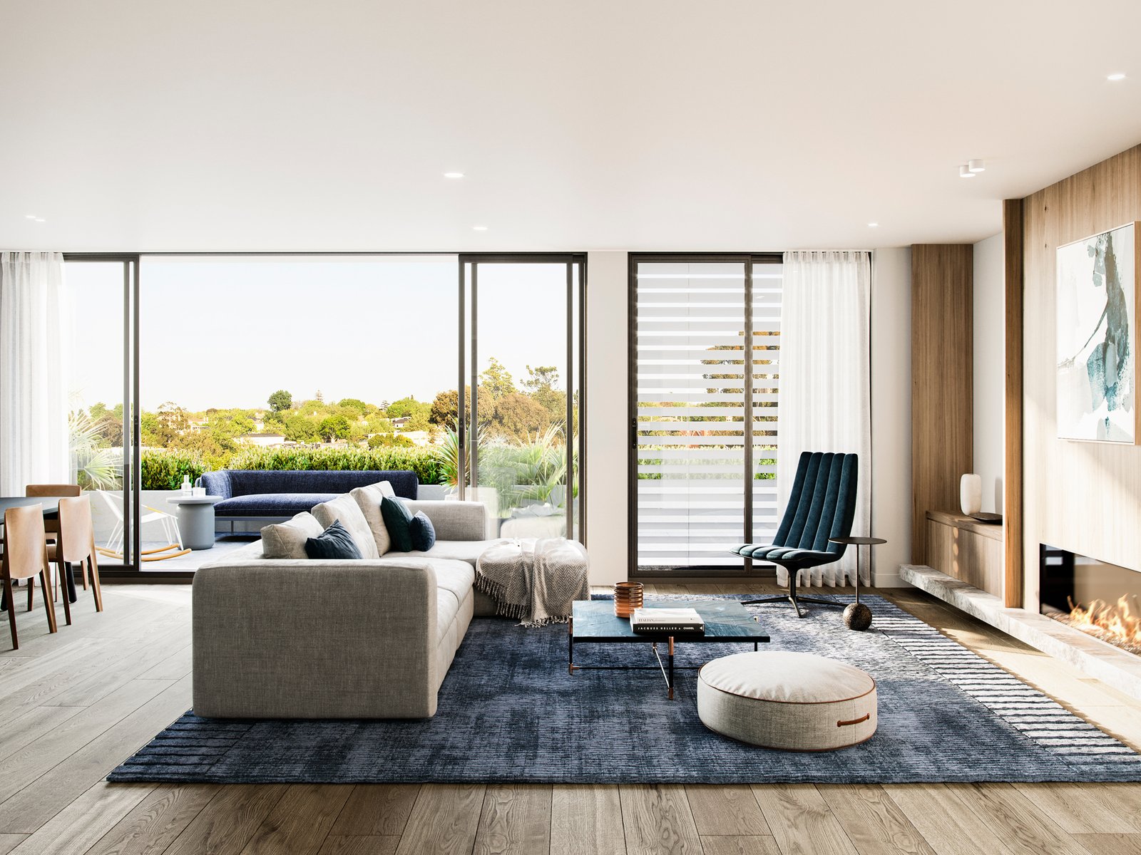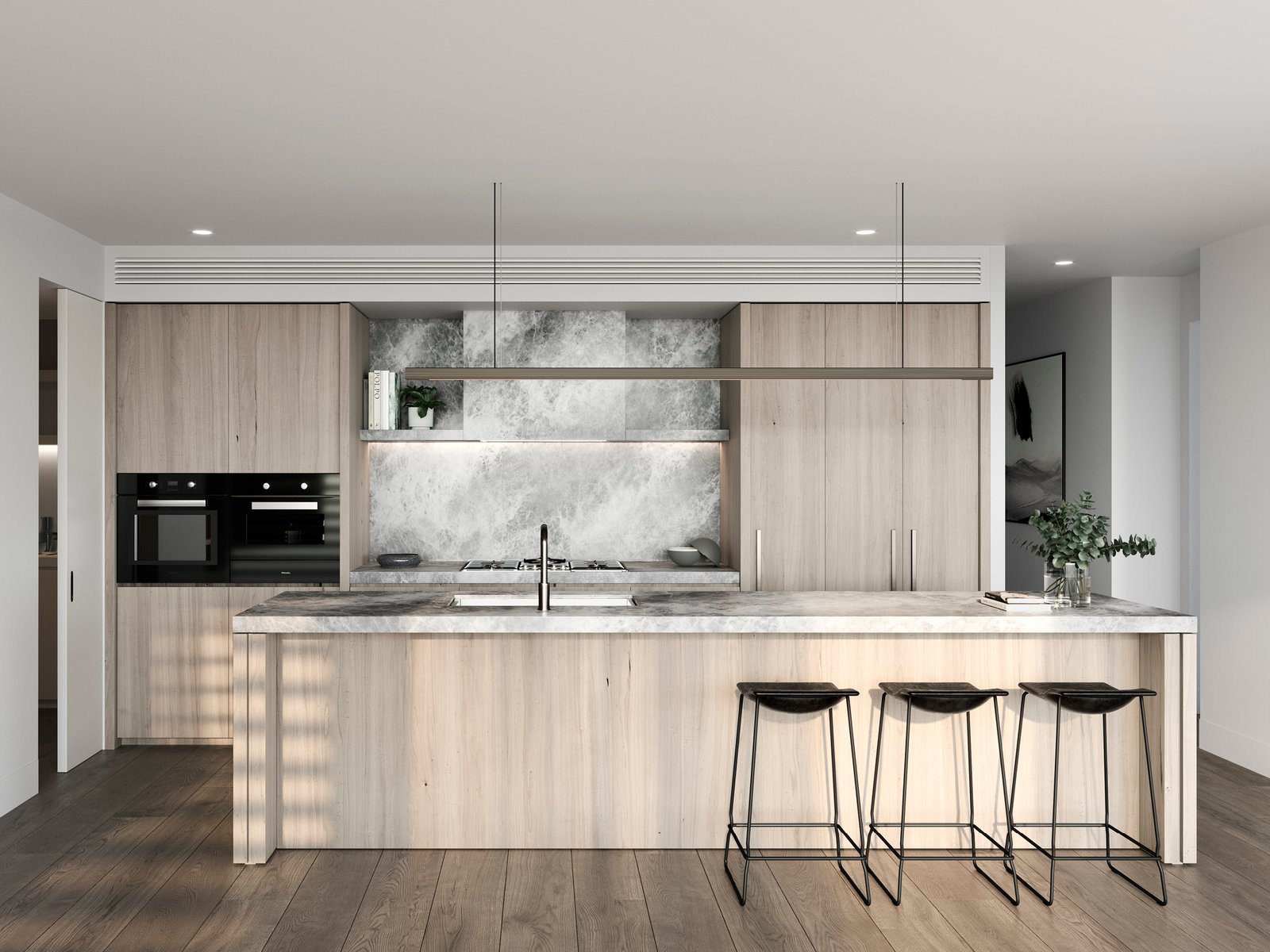 Telha Clarke’s exterior design creates an impressive complement to the streetscape in both scale and form. A stunning textural combination of profiled cladding and render to the façade responds to the surrounding residential environment. Dark materiality to the recessed second storey and carefully considered rear façade elevations, achieve visual balance, while lush landscaped surrounds and greenery to gardens and terraces reference the leafy locality. Minimalist beauty in warm interiors Understated elegance is on show in expansive interiors, styled by the acclaimed Studio Tate. A minimalist natural palette with warm-toned flooring, white walls and timber joinery accented by natural stone showcase premium craftmanship. Living areas bask in natural light streaming through full-height doors that lead to generous terraces for outdoor connection. Surrounded by the abundant planting and stunning landscape design by John Patrick Landscapes, the courtyard is your private haven for serene living. Intimate lighting, timber finishes and stone benchtops create an ambient communal cellar for entertaining, where residents can store their personal wine collection in the custom-designed space. Eighteen lockable cabinets have been created, perfect for the wine connoisseur.