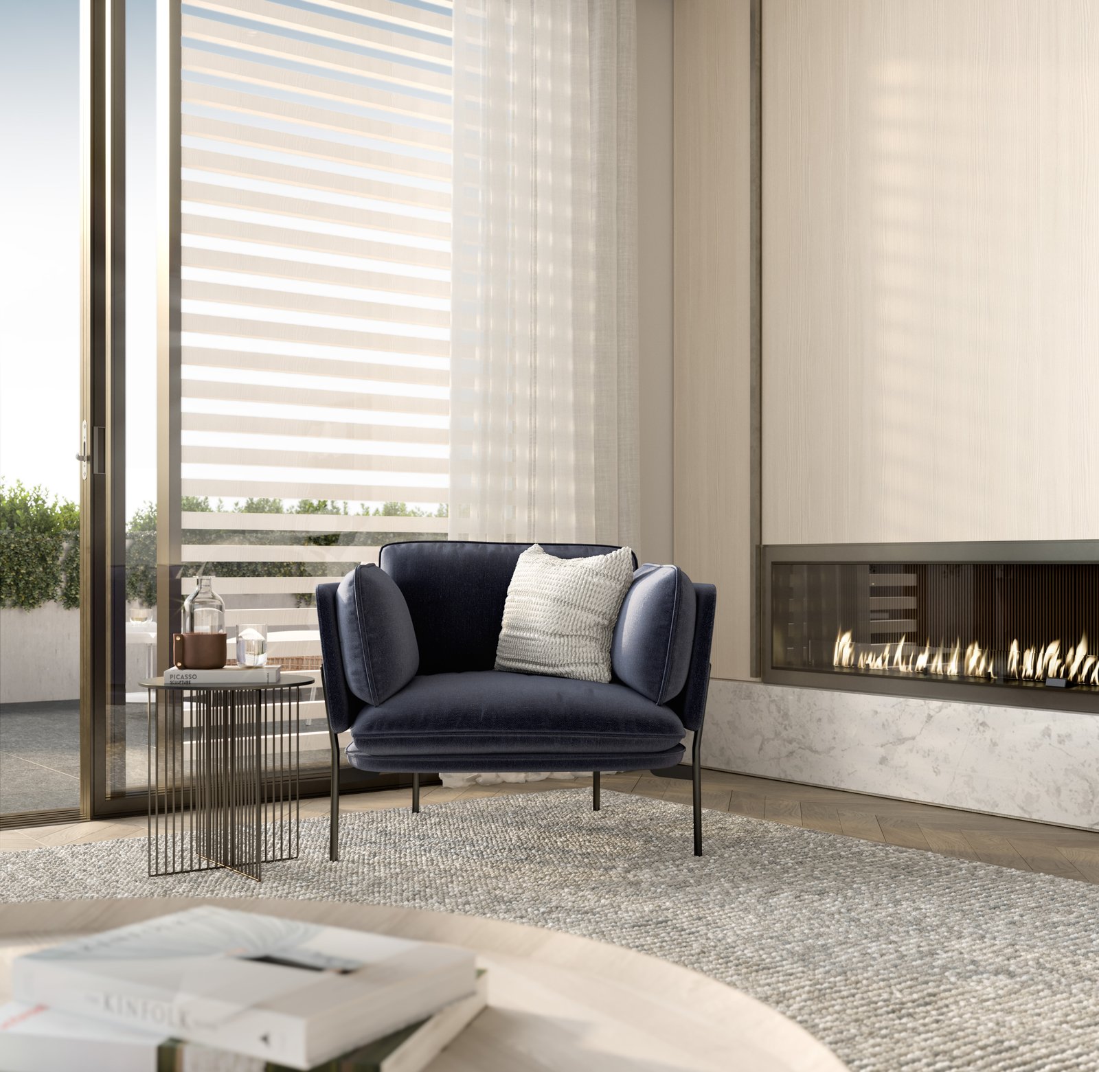 The classic façade features a rich textural blend of dark charcoal bricks and concrete contrasted with soft timber batten cladding. Nestled in leafy surrounds, this luxury residence celebrates light and space in the home of enduring design sophistication.