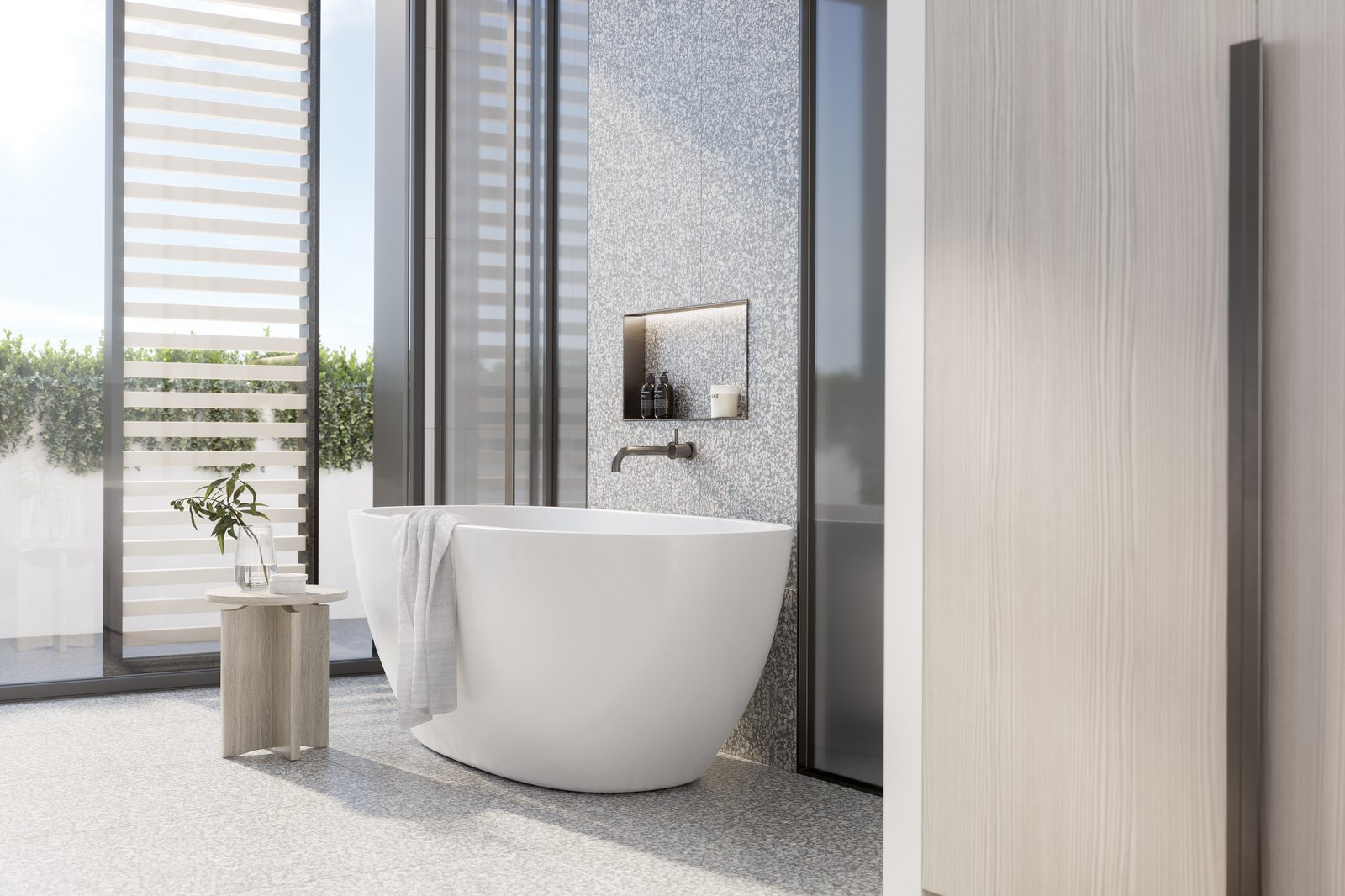 - Bathrooms feature terrazzo floor tiles and iron bronze tapware