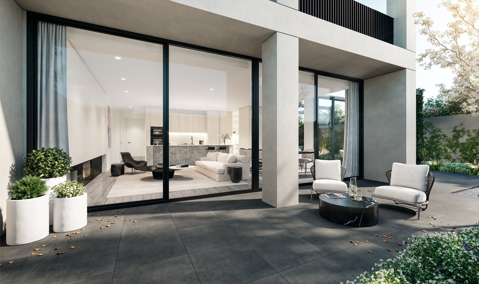 From wherever one stands in these open-plan areas, the sky is always visible through opposing windows. This sense of natural grandeur streams throughout each residence, with bedrooms also benefitting from excellent access to light and airflow. Stepping outside onto the wide terraces or into the private courtyards, the vistas are framed by greenery which softens the clean lines of the building’s façade. Outside, this is a statement address of dignified beauty. Inside, each home is a place of warmth and welcome.