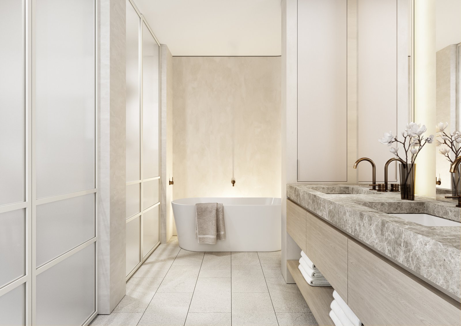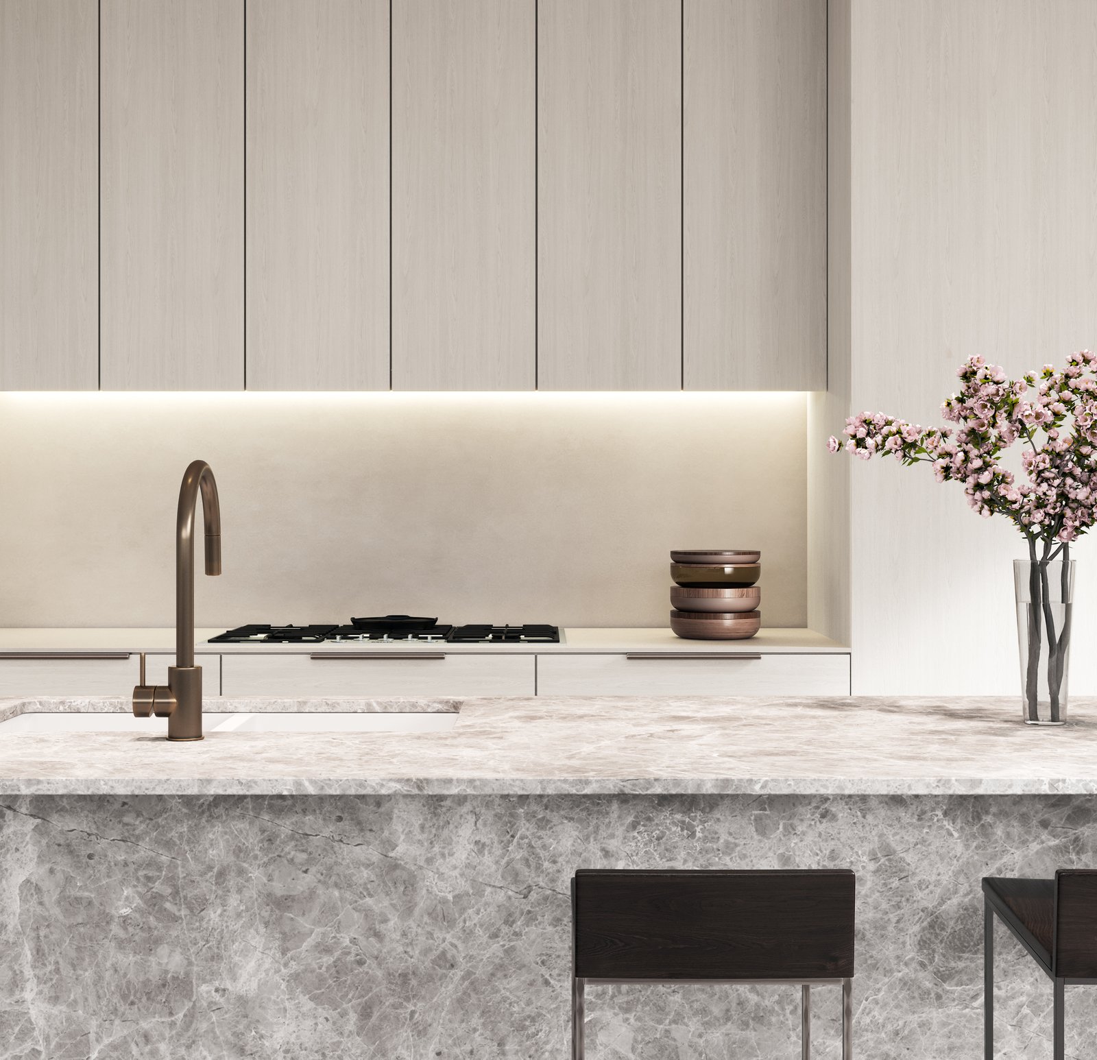 The best evidence of luxury lies in the attention to detail. In the kitchens, subtle strip lighting illuminates the exquisite surfaces of the benchtops, with bronze chosen to accent the surrounding natural textures in the choice of tapware.