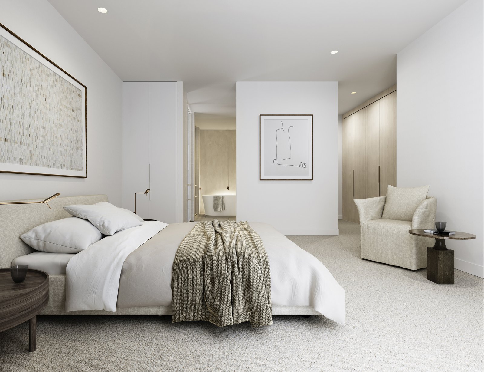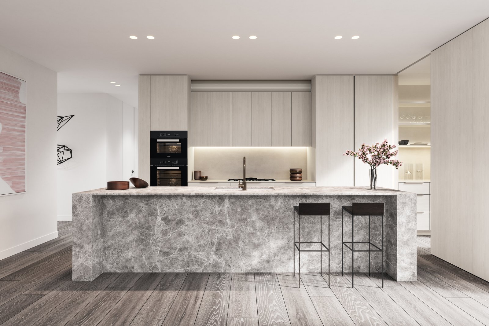 Emblematic of the natural grandeur of each home is the kitchen’s marble island bench with its sculptural quality. This signature piece is complemented by the pale oak finishes on the cupboards and draws. Drawing these materials together are the wide, French oak floorboards which exude an ageless quality. A large walk-in pantry and a suite of premium integrated appliances by Miele all create the ideal culinary workspace, alongside substantial storage. While the kitchens are comprehensive in their offering, the pared back design delivers a clean aesthetic to reduce clutter.