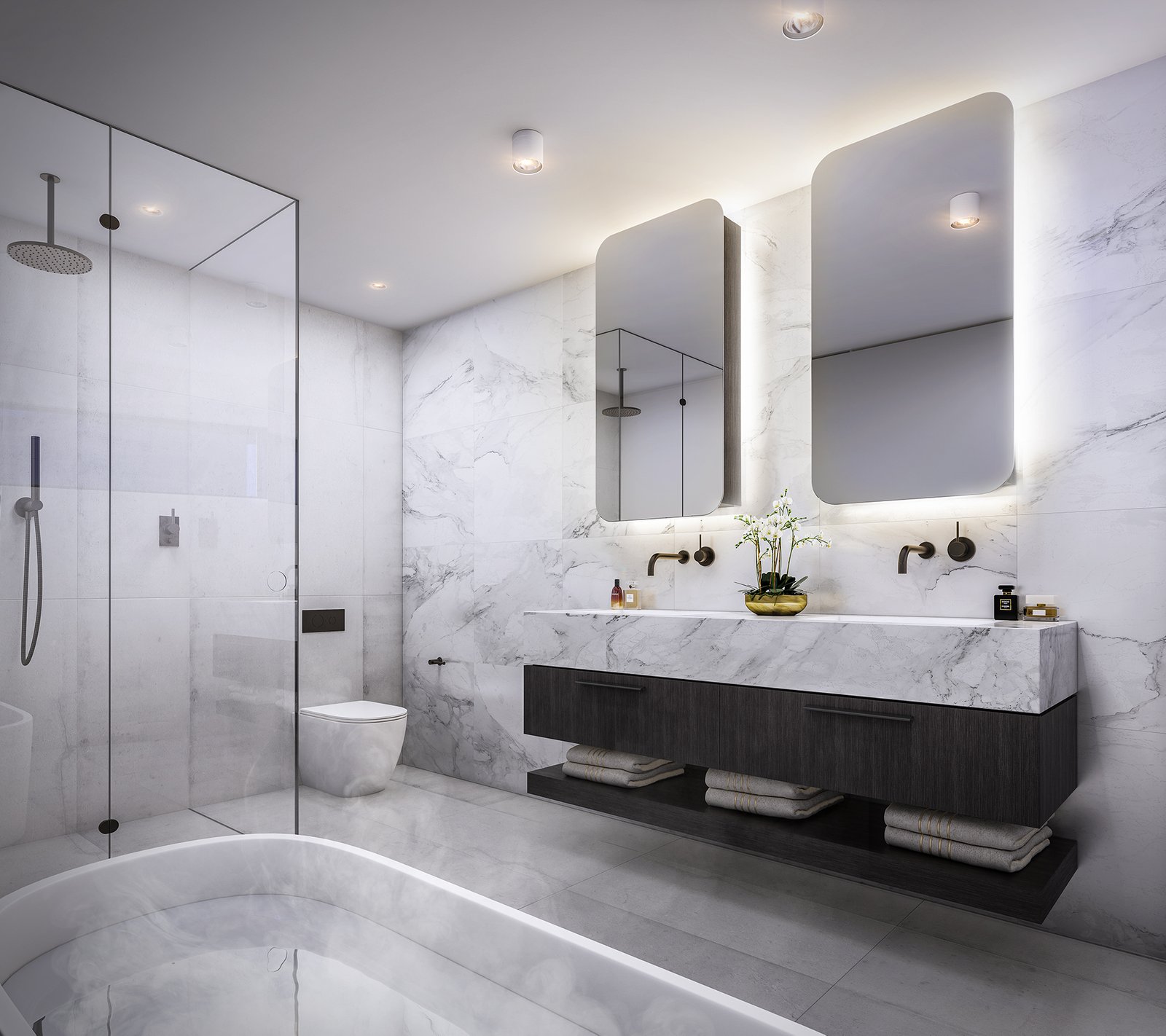 Jackson Clements Burrows strong contemporary aesthetic and clean-line finish is on show in the kitchen area. Marble benchtops and splashbacks with feature tapware create a sense of opulence. Fine craftsmanship is showcased with contemporary detailing to finger pulls and pantry handles. Expansive pantry space and integrated Miele appliances are sure to satisfy the most accomplished chefs. The large island bench is the perfect family and social hub in this impressive culinary offering. Appreciate the comfort of a free-standing bath accentuated with brushed gold tapware. Large format wall tiles juxtapose the stunning penny button feature wall and bespoke vanity benchtop.