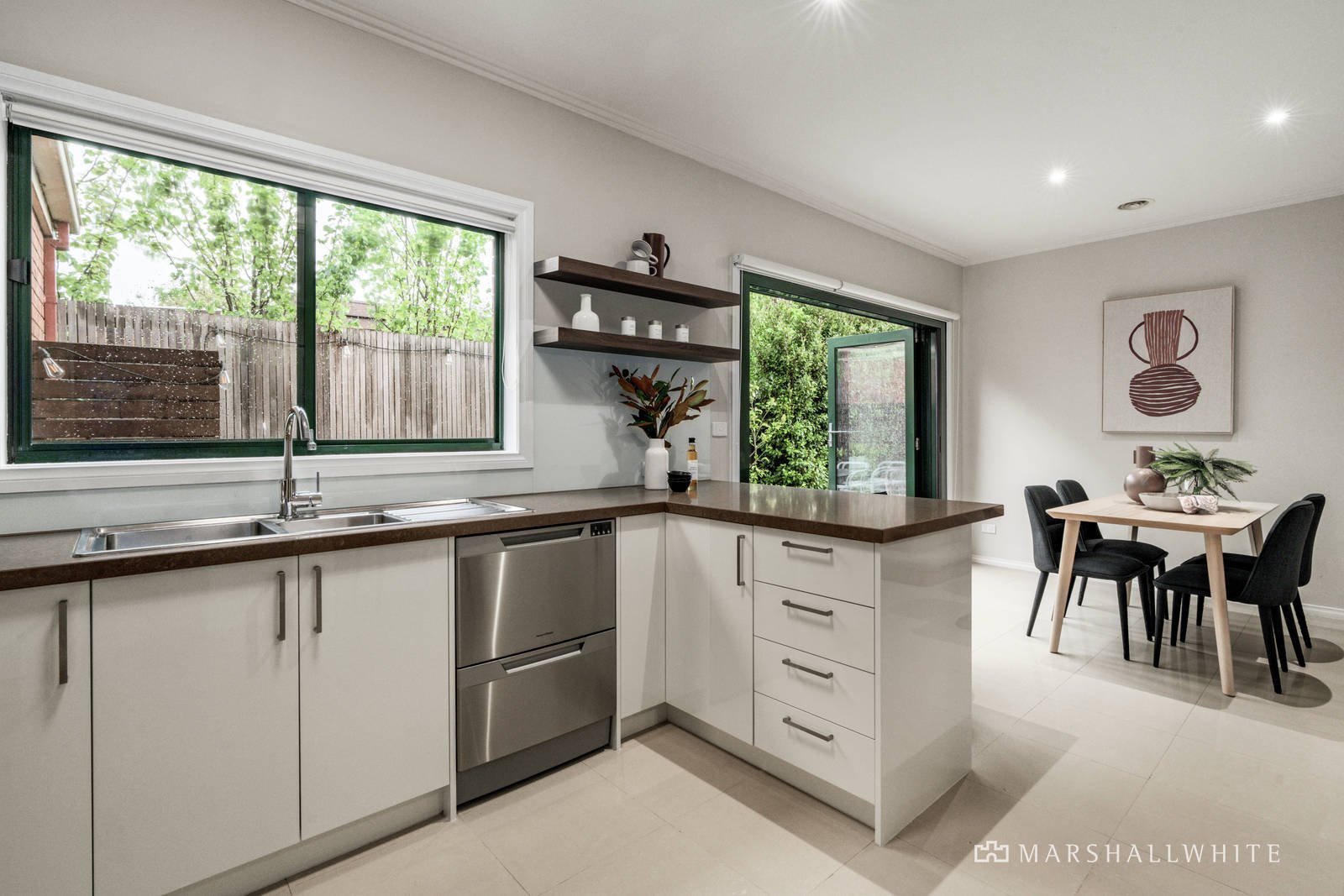 With cool clean lines and a streamlined sense of style, the home flows through its lounge to a stone-topped kitchen / dining that has been finished with a Bosch oven and concertina doors that open to a paved outdoor courtyard where the northern and western sun is a constant joy. Upstairs, the bedrooms share proximity to a fully-tiled bathroom with a frameless-screened shower that is independent to the bath, as well as a separate wc, whilst added highlights include a laundry and powder room downstairs, as well as central and zoned heating, air conditioning, two split systems, built-in robes, under stair storage and driveway parking in front of the garage.