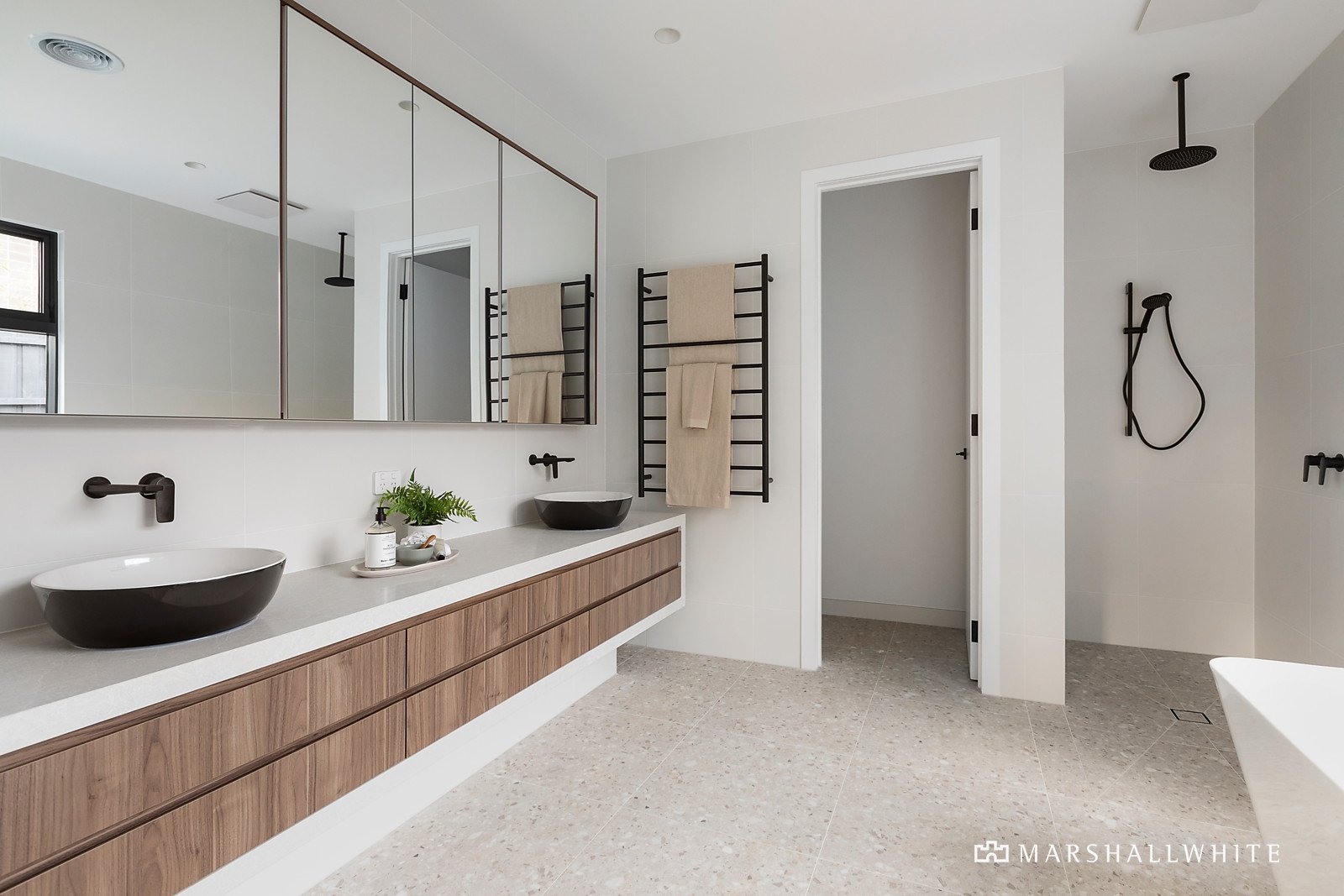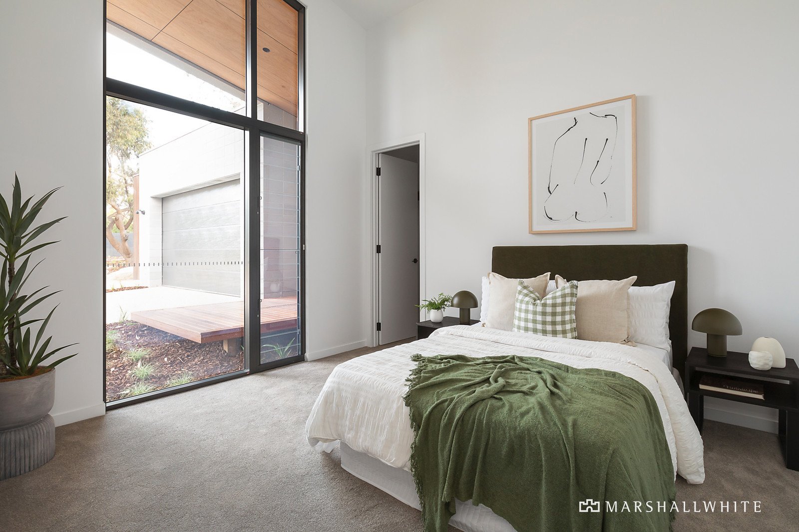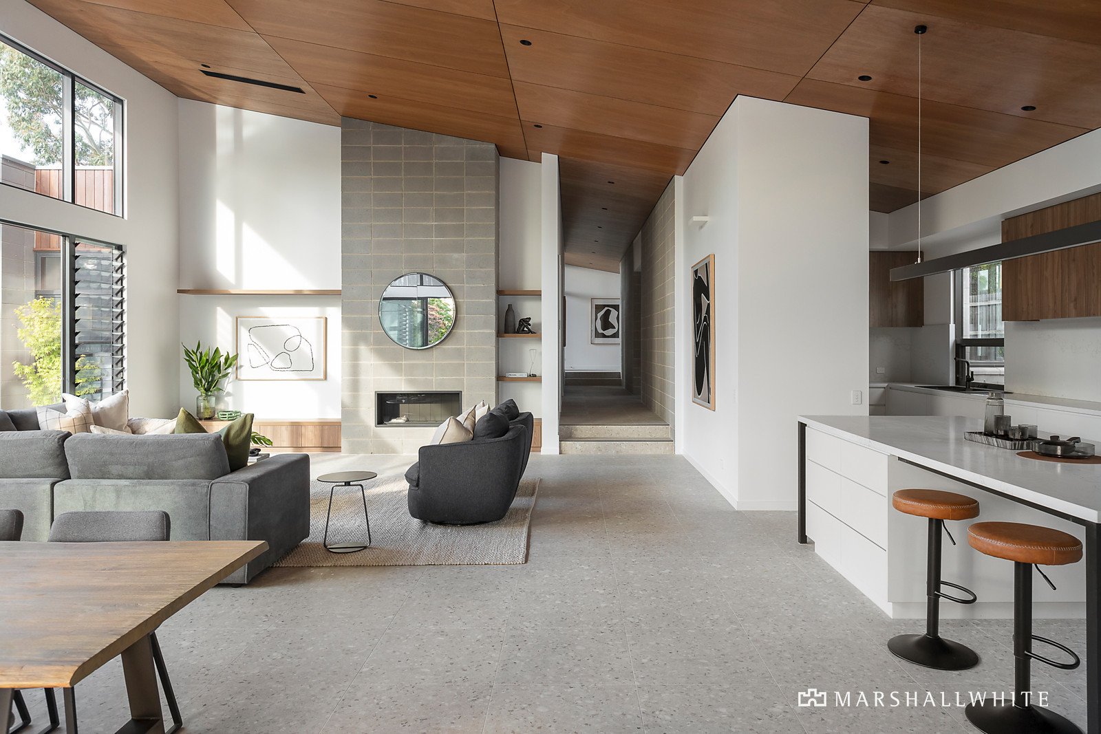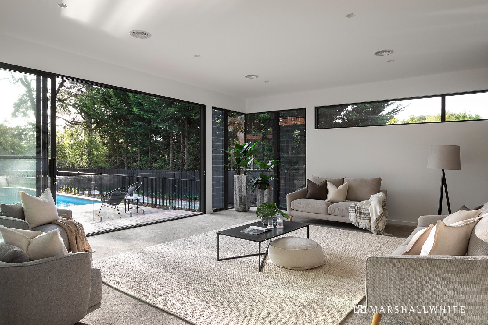 Set behind native/coastal-inspired landscaped gardens with a fire-pit area, an oversized front door opens to reveal the light-filled and generously proportioned dimensions complemented by soaring raked ceilings, floor-to-ceiling double-glazing and clerestory and louvre windows. Cohesively curated fittings, in calming neutral hues include matt terrazzo floor tiles, stone benchtops and vanities, and sumptuous Urban Boutique carpets. Skillfully crafted, the extensive built-in joinery with soft-close doors and drawers is both beautiful and practical enhancing the liveability and functionality of each room and space.