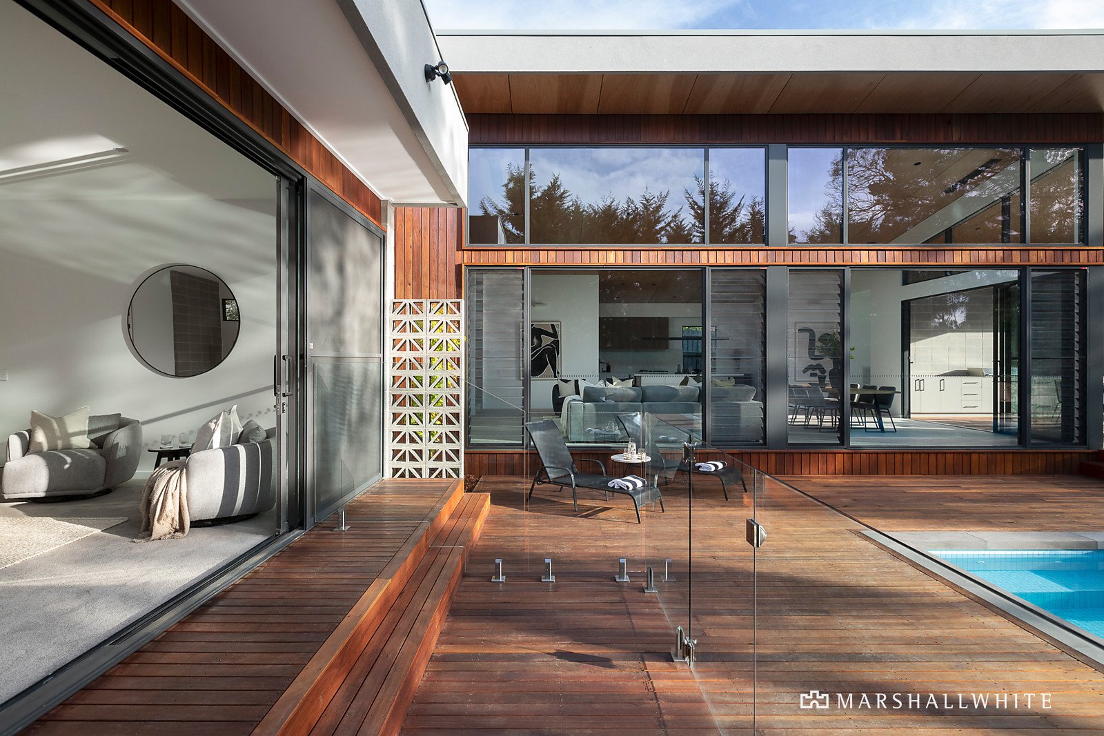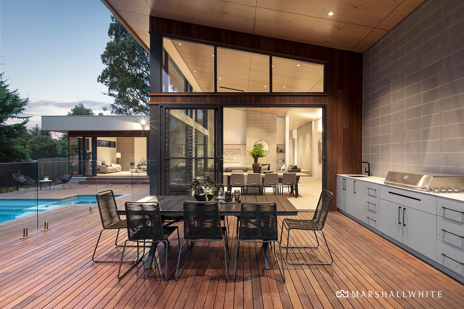Crafted by HIA award-winning Beachstone Homes - highly regarded for their dedication to excellence and quality-driven level of detailing and harmoniously designed to fuse the internal and external environments, this single-level home, defined by a distinctive Spotted Gum shiplap timber and breeze block exterior, is privately set at the end of a long driveway in a master-planned development of just three bespoke residences.