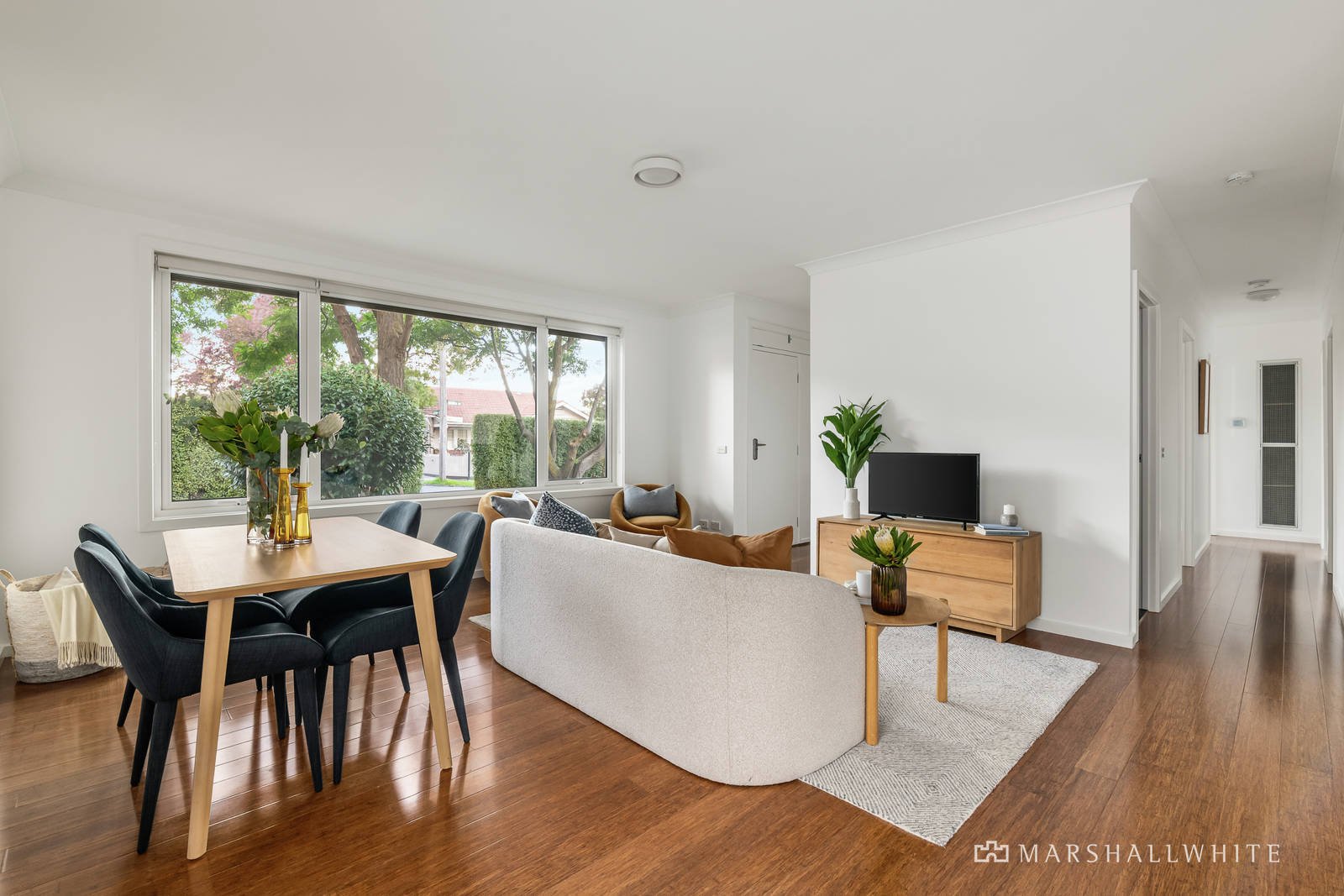 Framed by two magnificent mature trees and hedge-lined gardens, this home is highlighted by large picture windows flooding natural light into the interior. Featuring crisp white walls, bamboo flooring throughout the generous living areas, flowing to three good-sized newly carpeted bedrooms with built-in robes, a study and two fully tiled bathrooms, one with a modern laundry.