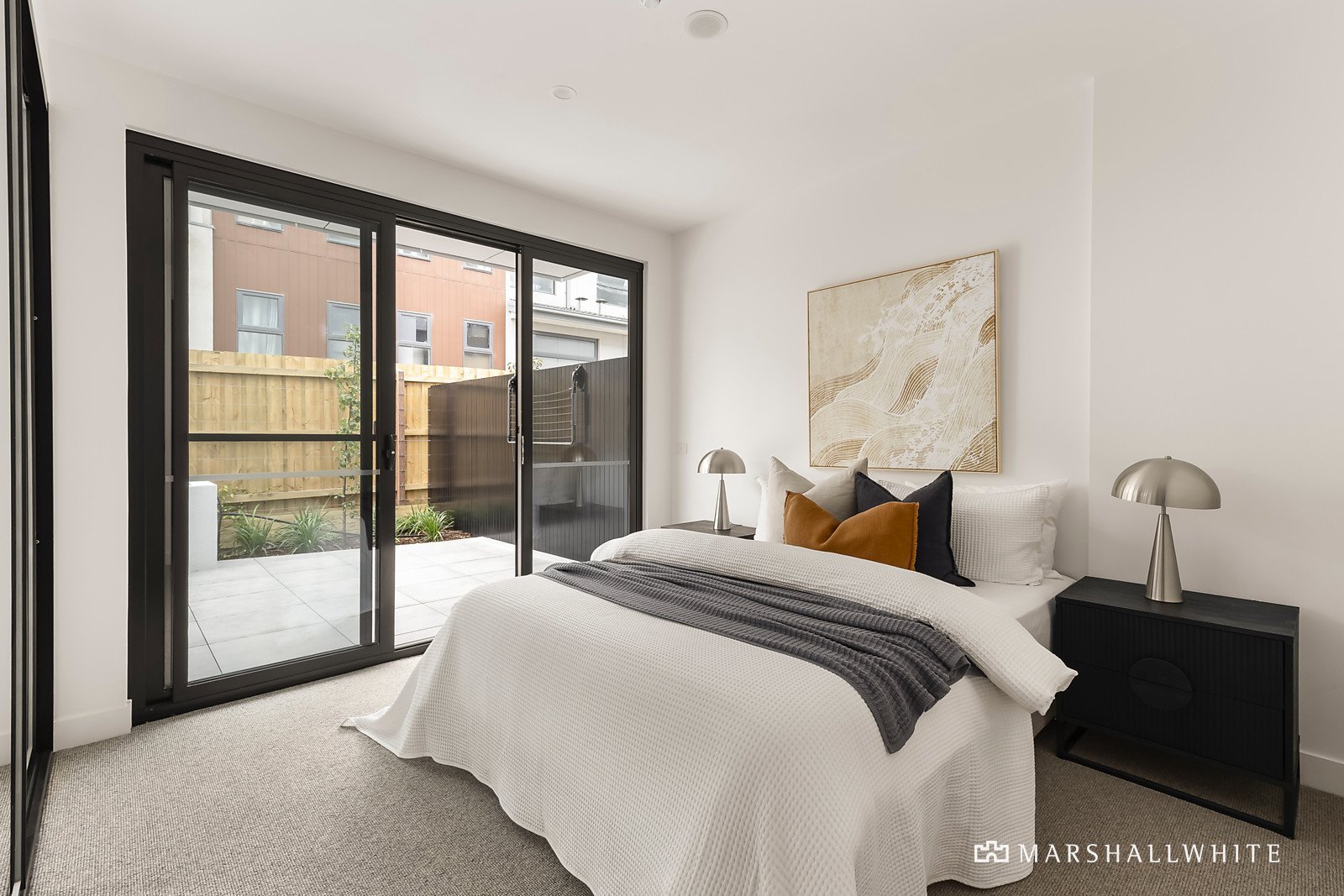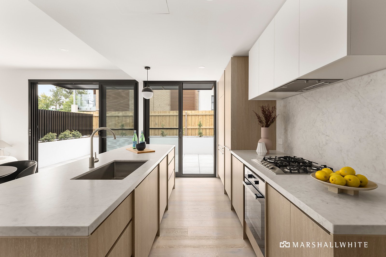 Privately screened by a high walled garden, the sun-drenched interior spaces are defined by high ceilings, limed oak floors and floor to ceiling glass. The expansive open plan living and dining room is warmed by a gas pebble fire and served by a premium gourmet kitchen appointed with Carrara marble benches, Miele appliances and an integrated fridge freezer. Glass stacking sliders extend the living area out to a large north-facing paved courtyard surrounded by garden beds. Also opening to the courtyard, a double bedroom with built in robes and a stylish bathroom is conveniently situated downstairs while both a lift and stairs leads up to the generous main bedroom with designer en suite, built in robes and desk, two additional bedrooms with robes and a lavish bathroom with freestanding bath. On the level above there is a study nook and fabulous louvre covered north-facing roof terrace, the perfect space for outdoor entertaining while enjoying the wonderful views over Kew.
