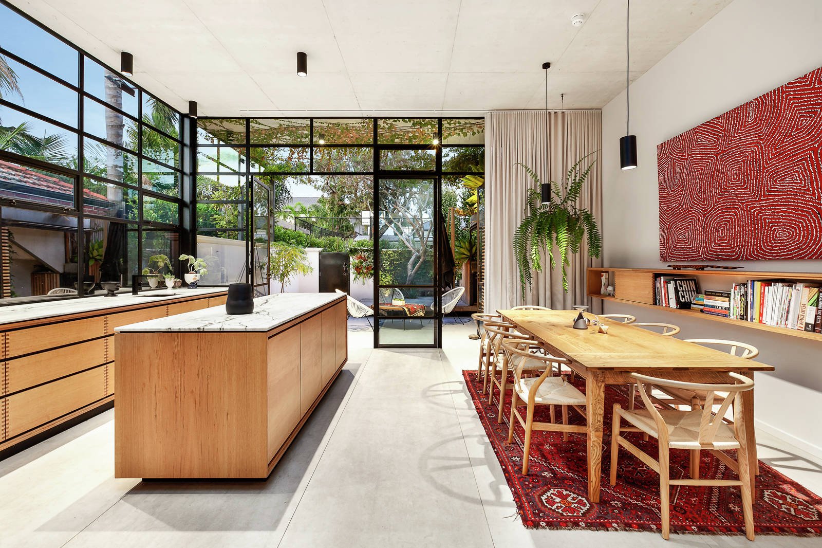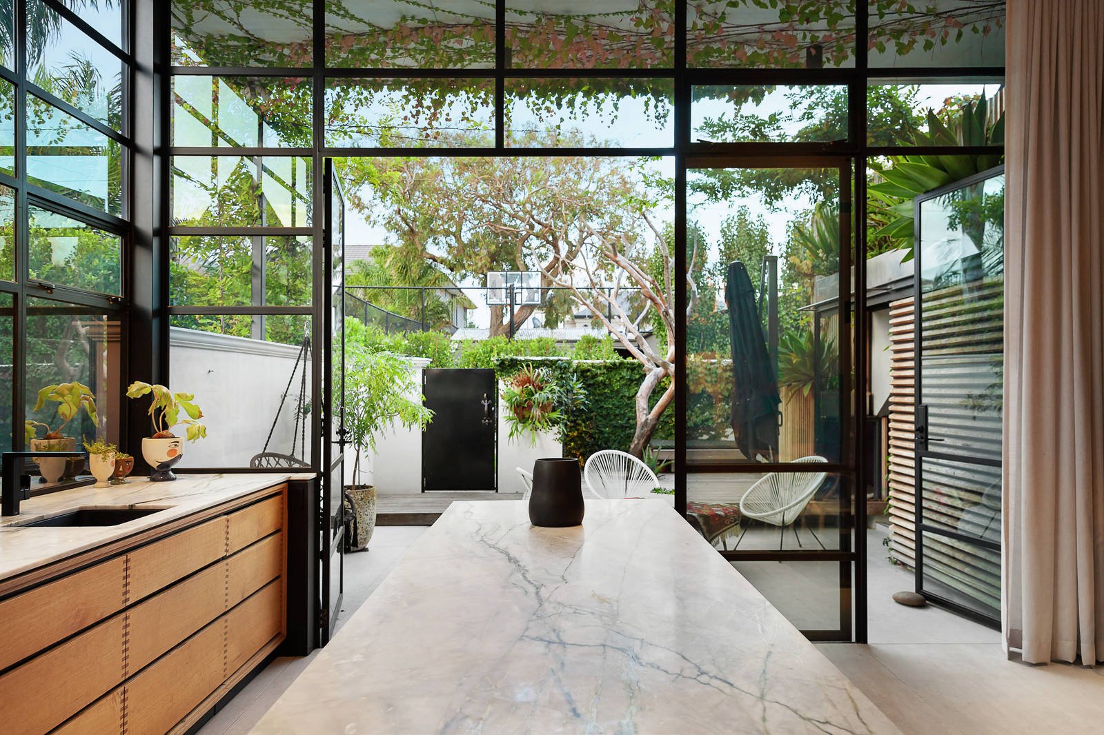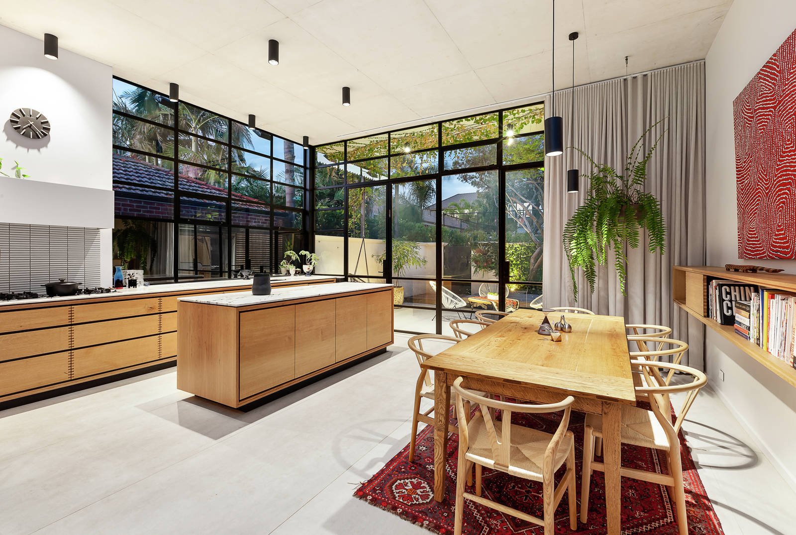 Oversized Italian floor tiles and captivating floor to ceiling steel windows accent the huge family living room, further featuring extensive bespoke joinery and an open fireplace which enjoy the backdrop of a beautifully landscaped private garden. The solid oak chef's kitchen is handmade, based on an original kitchen designed by Danish chef Rene Redzepi, and is complemented by a comprehensive walk-in pantry and suite of Miele appliances. A formal living room features a French style marble fireplace and gorgeous window seat, creating a relaxed sensory haven.