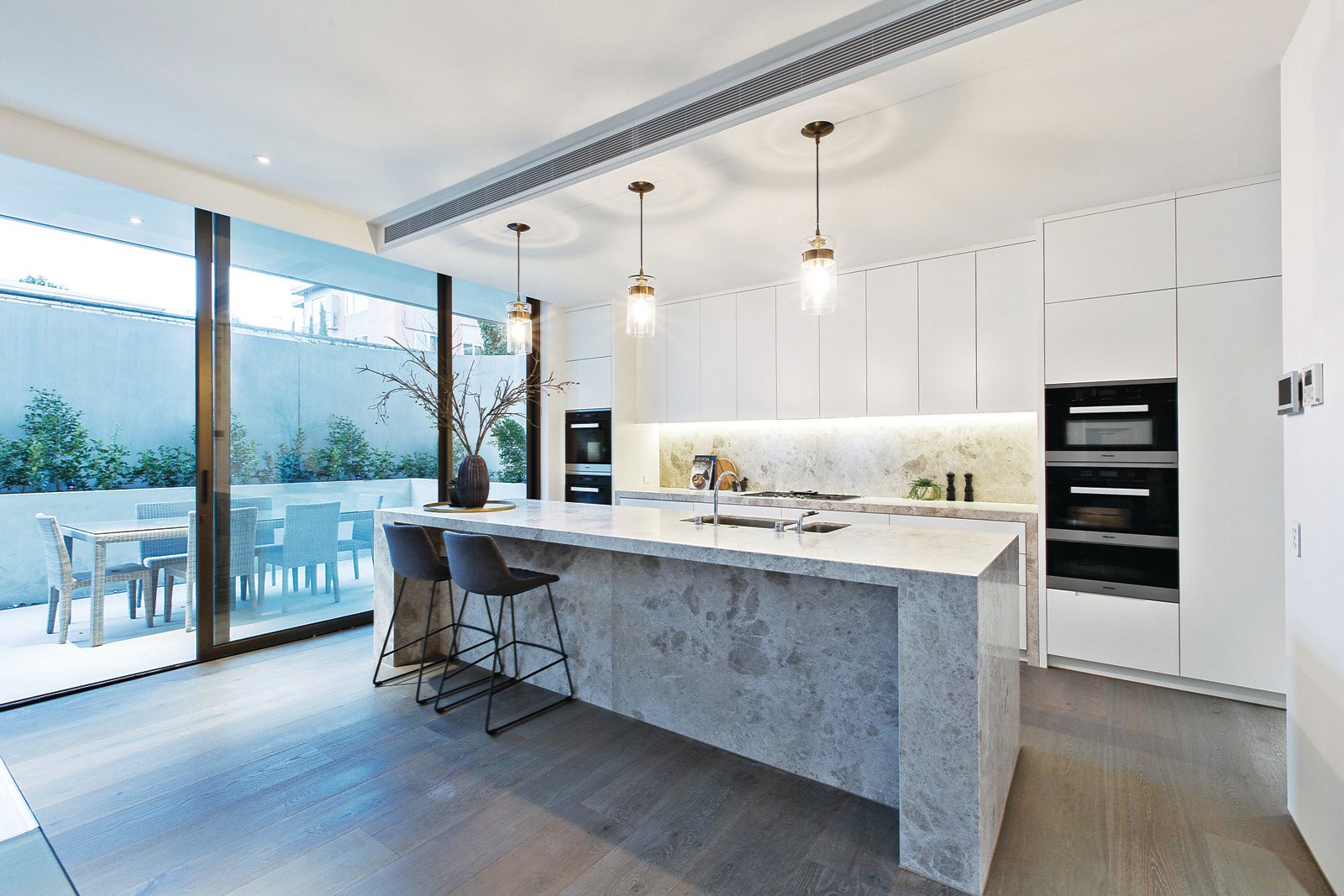 High ceilings and full height doors and windows accentuate the sense of space and light throughout. Wide oak floors flow through an entrance gallery to an expansive living and dining room. The sublime kitchen is appointed with premium Miele appliances including a steam oven, warming draw, Liebherr fridge/freezer, wine fridge and marble benches. The living space opens to a landscaped garden oasis, with stunning water feature, ideal for al fresco dining and entertaining with built-in gas barbeque. The sumptuous north facing main bedroom with opulent marble en-suite and walk in robe sets a benchmark for luxury that is met by two additional double bedrooms with built in robes and marble en-suites. All the bedrooms open to surrounding terraces.