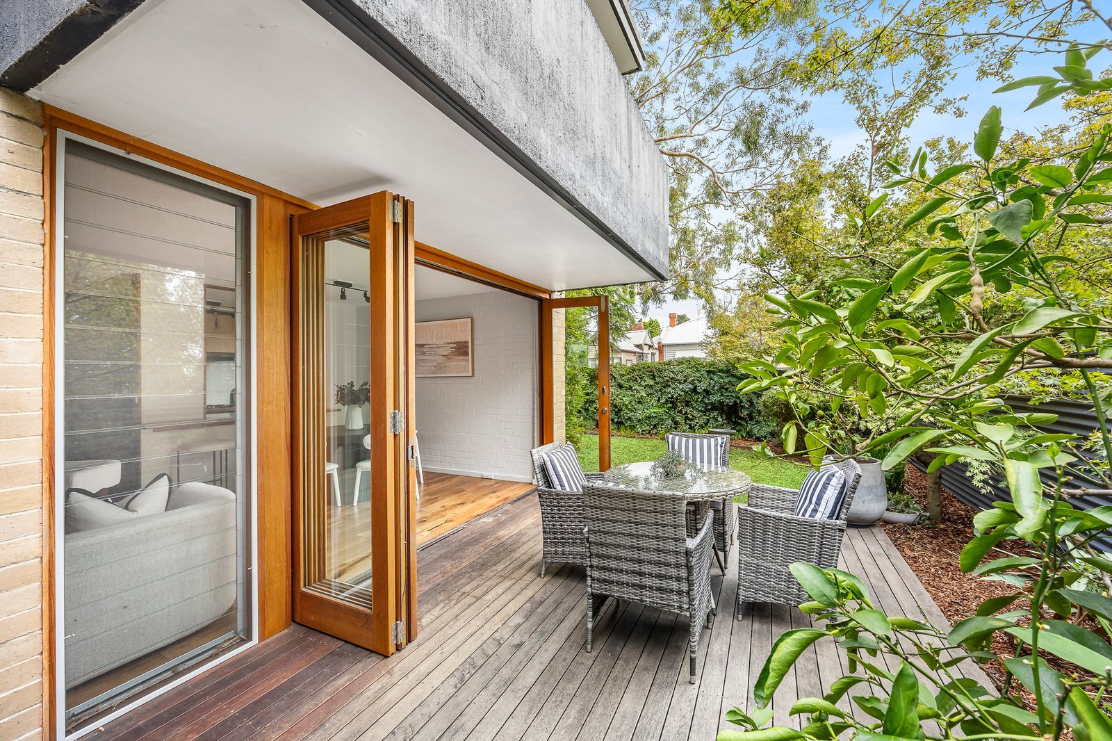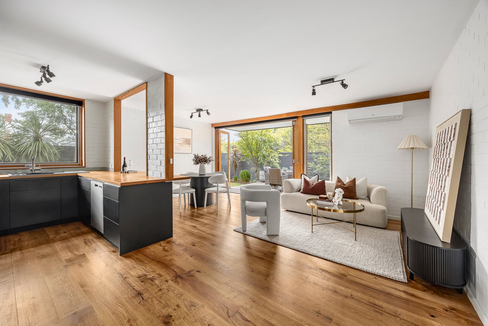 Warmed by the tones of earthy surfaces and rich timber flooring, the home’s open-plan living flows seamlessly through concertina doors to a private and sundrenched deck that is perfect for entertaining and underpinned by an Asko-equipped kitchen with attractive reclaimed timber benches and a stylish black Franke sink. Climb an eye-catching timber staircase to discover a pair of generously robed bedrooms – the primary bedroom, also with its own north-facing terrace and semi-ensuite access to a vogue family bathroom with a walk-in shower - while added highlights include a downstairs powder room, a study, concealed laundry, rear carport parking and split system heating / air conditioning.
