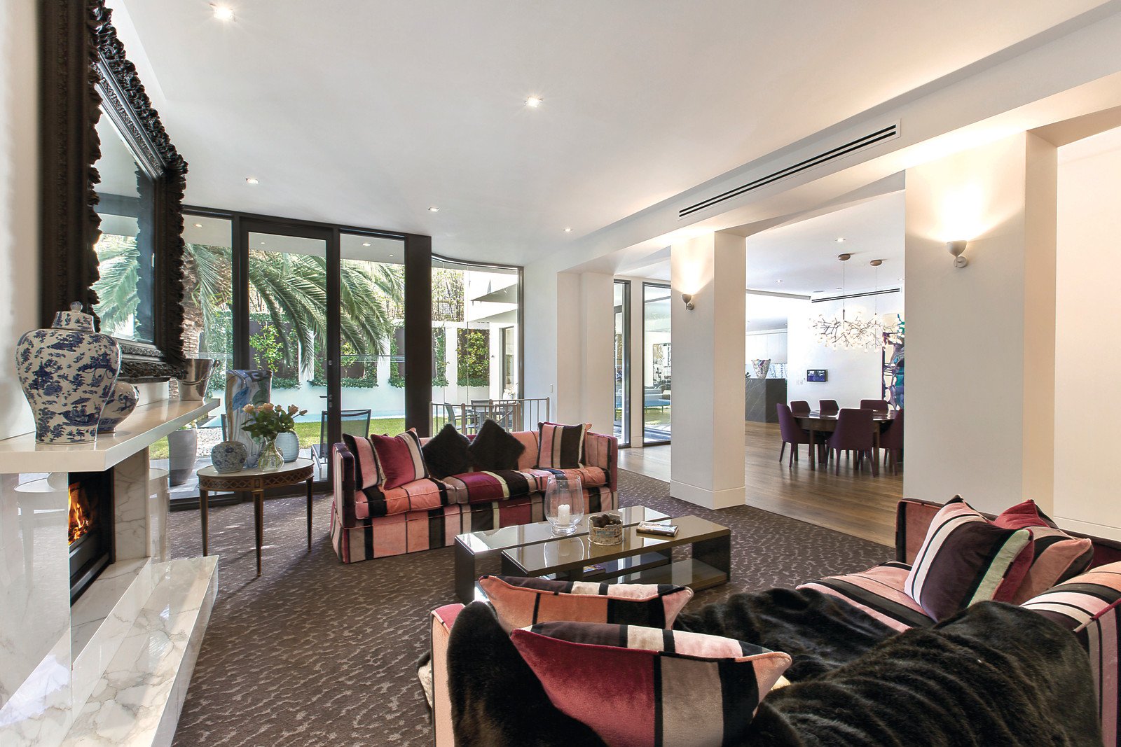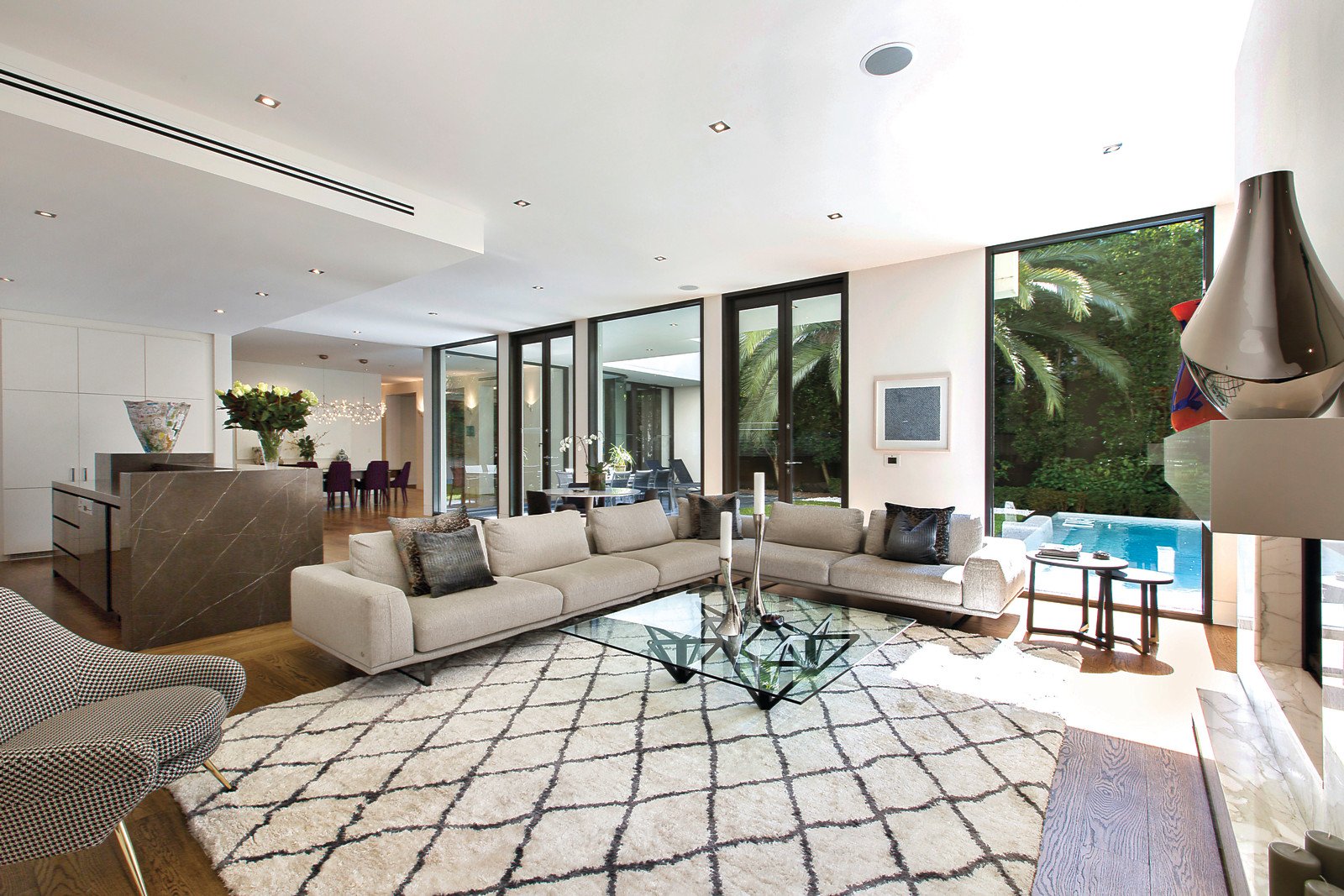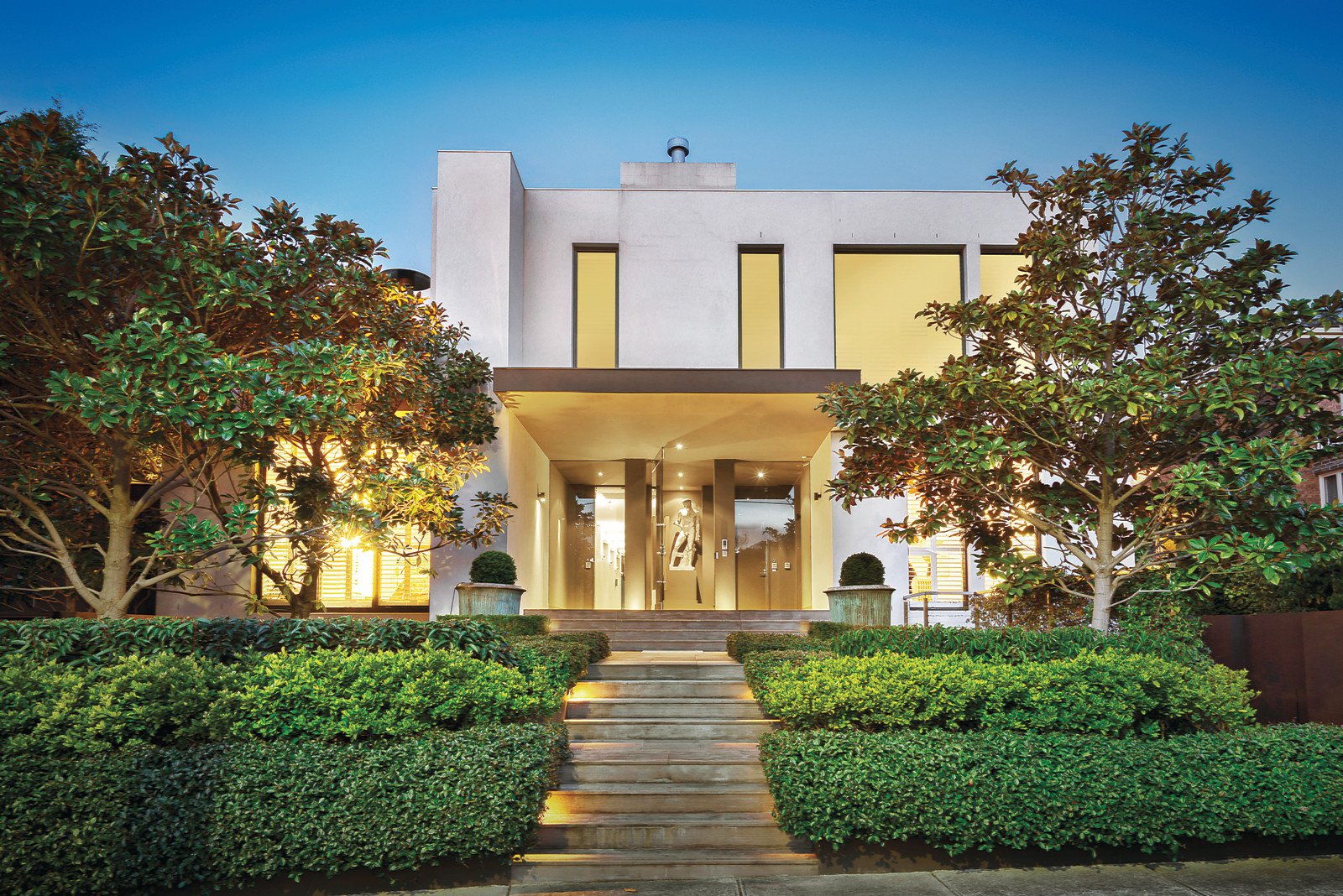 Superbly located within walking distance to Toorak Village, is this stylish and luxurious residence, with landscaped gardens in a boutique block of only two. Architecturally designed by Melbourne renowned architect, Ilario Cortese, it is of the highest standard featuring quality fixtures and fittings throughout, high ceilings and the most appealing layout. An imposing entry foyer opens to a stunning interior dominated by a modern neutral colour palette and walls free of any cornices-heightening that desired contemporary feel. Wide hallways, American oak floorboards and floor-to-ceiling windows that offer unrivalled views of the amazing al fresco area, flanked by trimmed hedges, completes the picture-perfect setting. The main hub of the home offers an open-floor plan and enjoys amazing views of the sparkling pool and outdoor entertaining area. A formal lounge and casual living area share similar views and both feature marble open gas fireplaces. The spacious new kitchen is comprehensively appointed with stainless-steel Gaggenau appliances, marble benchtops and a large walk-in pantry with integrated fridge, freezer and wine fridge. The main bedroom is at the entrance and features a luxurious and sophisticated marble en suite, with double vanity, bath and frameless glass shower. It connects to a dressing room and beautifully fitted walk-in wardrobe. A carpeted hallway leads to the further three large bedrooms, each with marble en suites. One bedroom is conveniently located near the entrance and can be easily set up as a home office, as it offers a separate access from the grand foyer. A spiral staircase leads downstairs to an equipped home theatre.