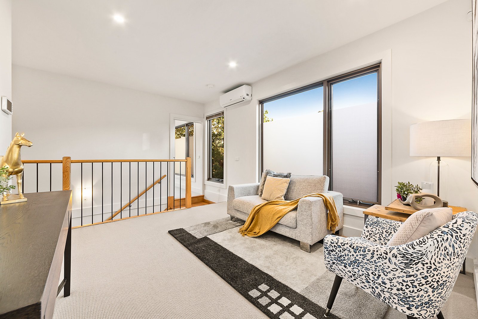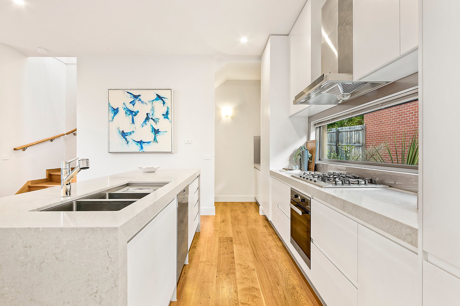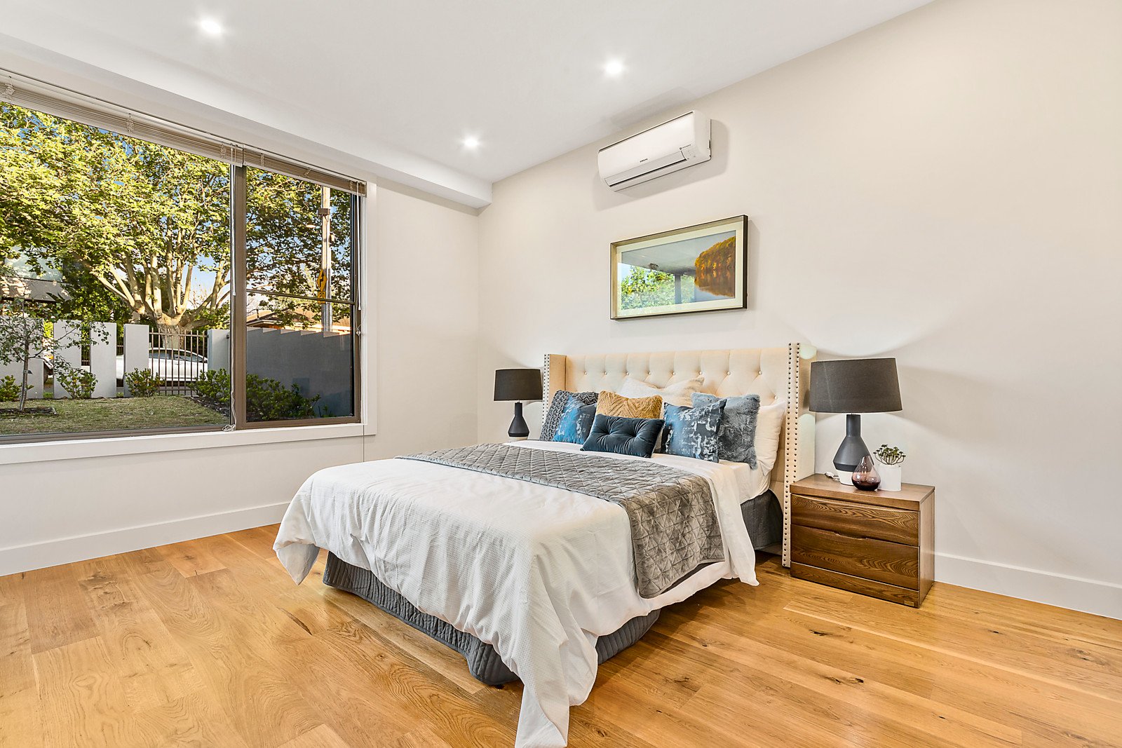 Wide oak floors flow through the welcoming entrance hall to an expansive open plan living and dining room bathed in natural light and opening to a private north-facing courtyard. The sleek gourmet kitchen is appointed with Miele appliances and stone benches. A downstairs main bedroom with stylish en suite and walk in robe is matched upstairs by an alternate main bedroom with chic en suite, walk in robe and balcony. There are also two additional bedrooms with built in robes, a home office or 5th bedroom, family bathroom and a retreat.