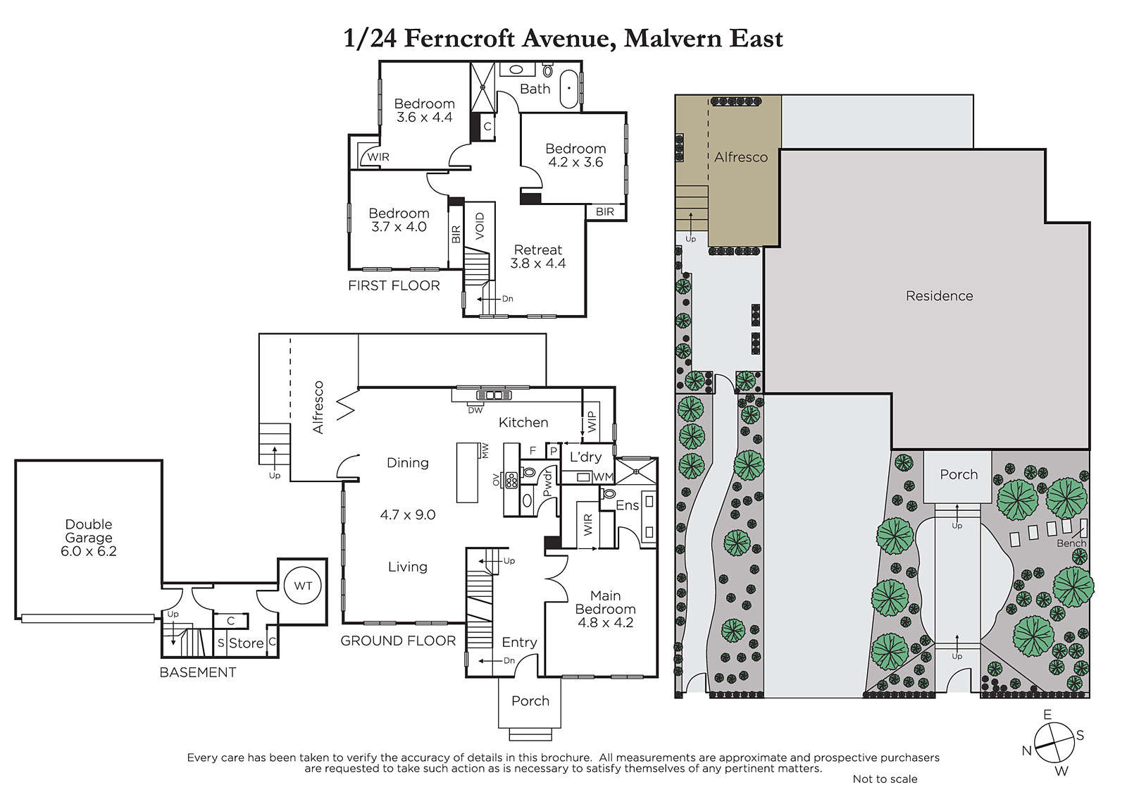On the ground floor, a grand main bedroom features walk in robes and a sumptuous ensuite complemented by three large double bedrooms with robes. A luxurious bathroom with marble vanity, freestanding bath and separate shower is paired with a separate powder room. A laundry, downstairs storage area, security system, video intercom entry and secure double garage complete the home.