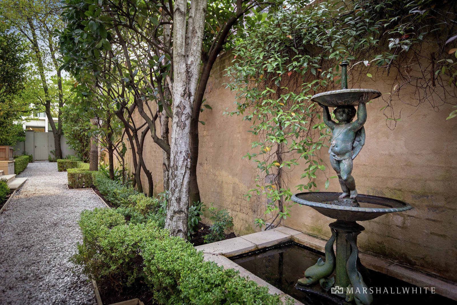 The elevated ceilings and oak parquetry floors enhance the sense of space and contemporary refinement through the wide entrance hall as it flows through to a fitted executive study/third bedroom and elegant sitting room with a fireplace and two sets of French doors opening to a terrace and garden. Oriented to capture year-round northern light, the expansive living and dining room with a gas fireplace encompasses a gourmet kitchen appointed with Gaggenau/Miele appliances and stone benches. French doors open the living area to a north-facing entertaining terrace and the surrounding gardens with water feature. The two beautiful king-sized bedrooms with designer ensuites and robes both open to the leafy gardens.