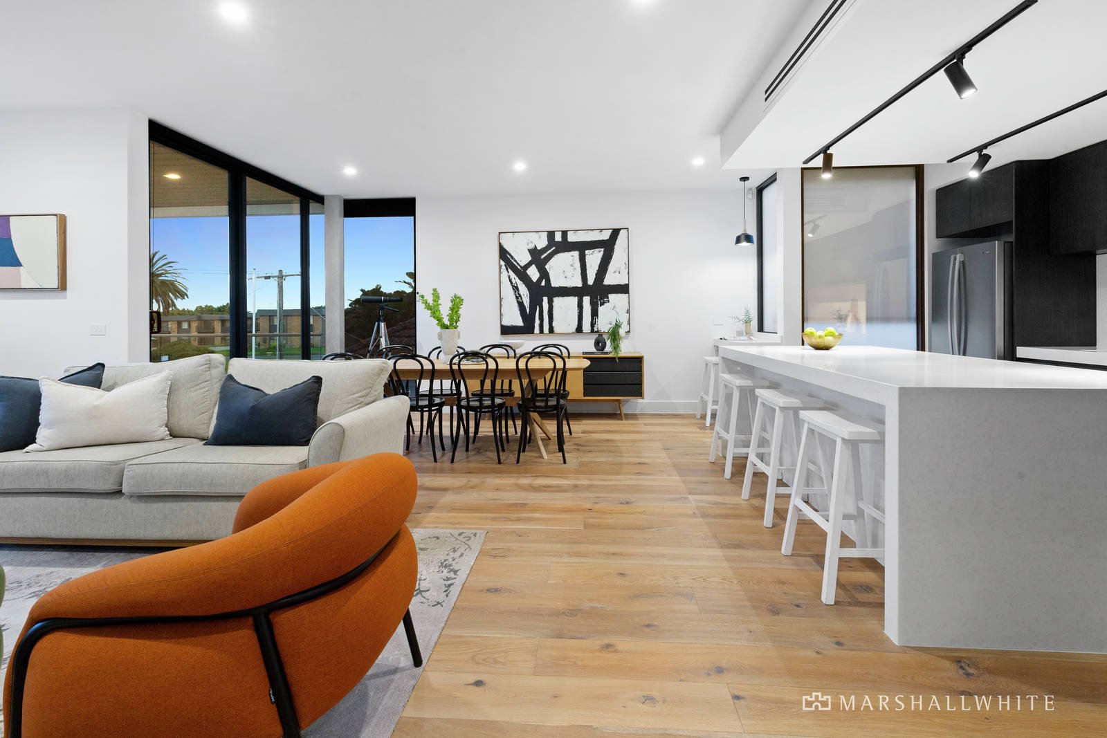 Enjoy striking bay views of the You Yangs and Bellarine Peninsula from the open-plan living and dining areas, seamlessly flowing onto a spacious entertainer's balcony, creating a seamless transition between indoor and outdoor spaces. The gourmet kitchen adds to the appeal, with its elegant stone benchtops, high-quality Bosch appliances, and a hidden walk-in pantry concealed behind sleek cabinetry.
