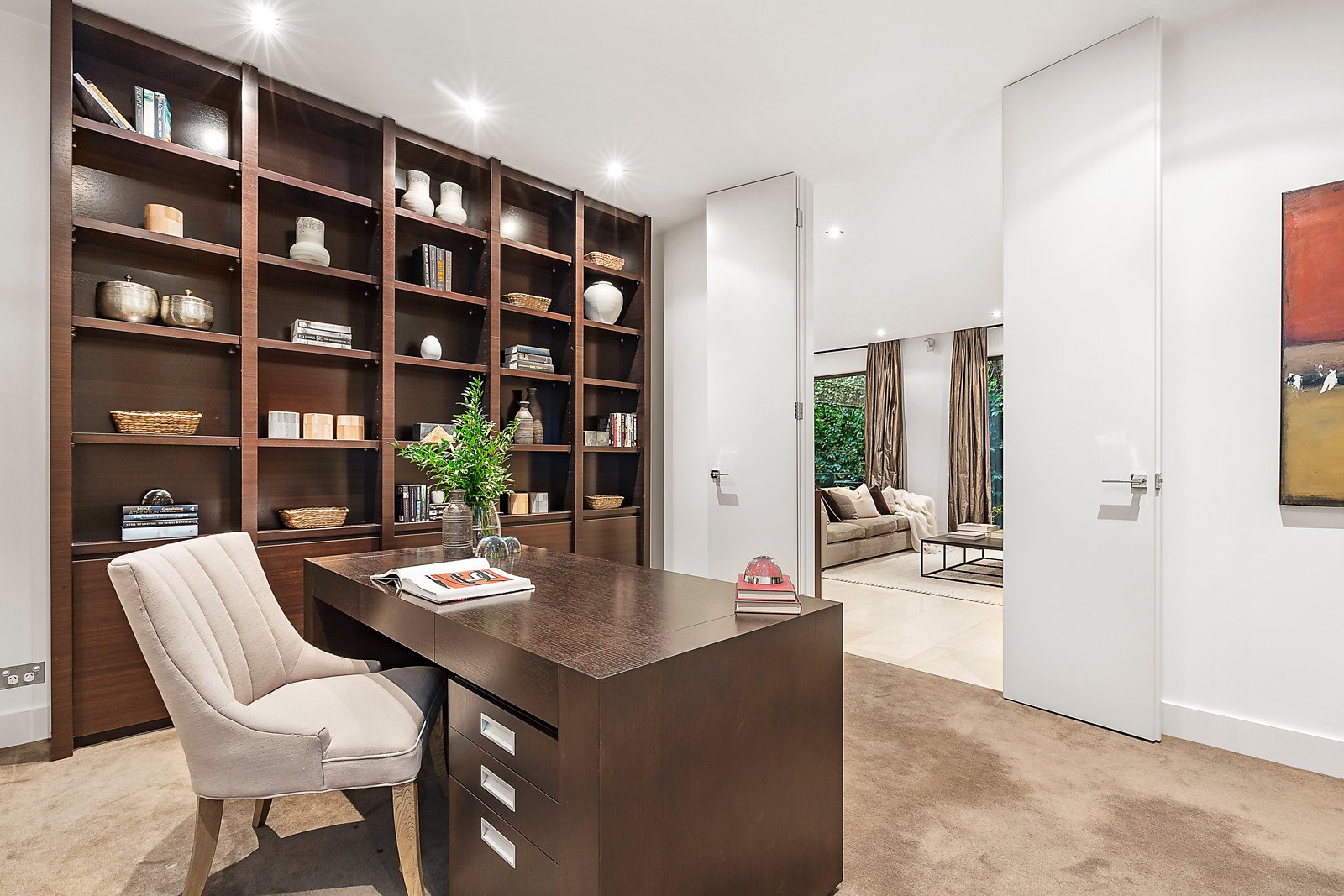 A formal living area adjoins a versatile study or dining area with inbuilt shelves, flowing into the generous open plan living area enhanced by sleek tiled floors and unfolding to a sizeable private courtyard complemented by established greenery and a retractable awning, creating a secluded space for alfresco entertaining all year round. The gourmet kitchen is appointed with stone benchtops and quality European appliances including gas cooktop, oven, integrated microwave and dishwasher.