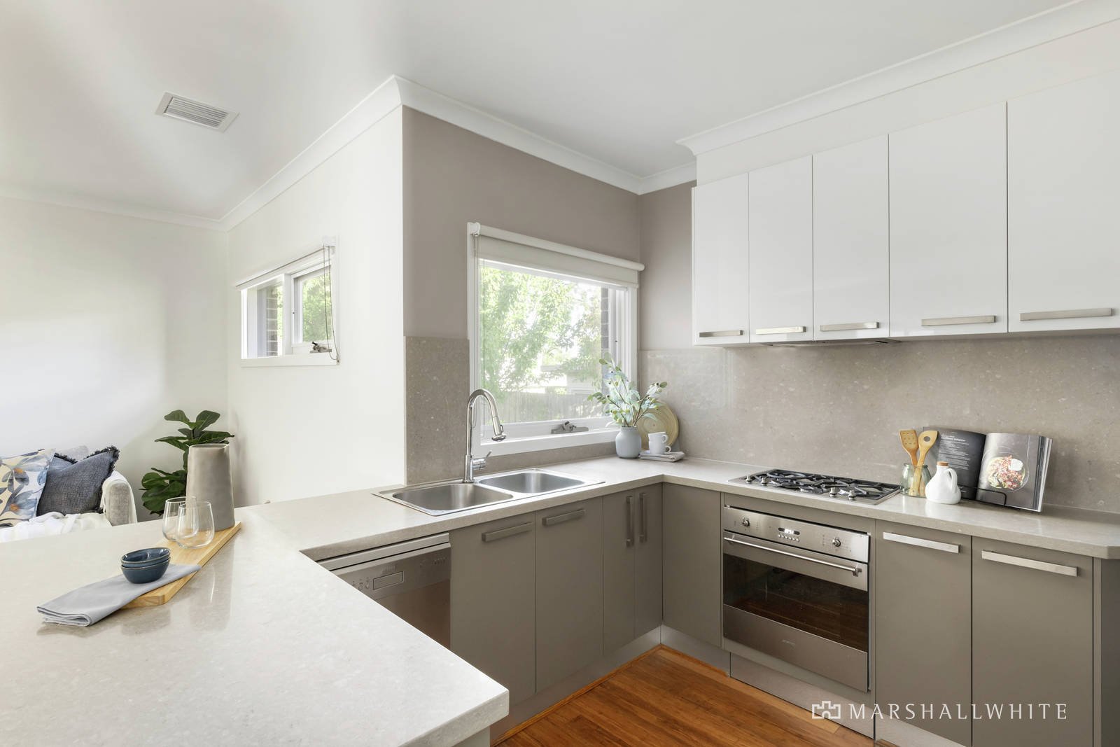 Enjoying its own street frontage, the free-flowing floorplan is equally suited to relaxed family living, working from home and entertaining. Timber floors flow through the central hall, inviting sitting room, a spacious home office and the exceptionally generous living and dining room with a gourmet kitchen appointed with stone benches, Smeg appliances and walk in pantry. The living spaces open to an undercover north-facing decked courtyard with tranquil water feature. Timber floors continue upstairs through the main bedroom with walk in robe and chic en suite, two additional bedrooms with robes and a stylish bathroom.