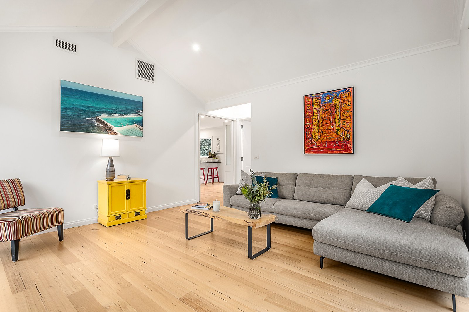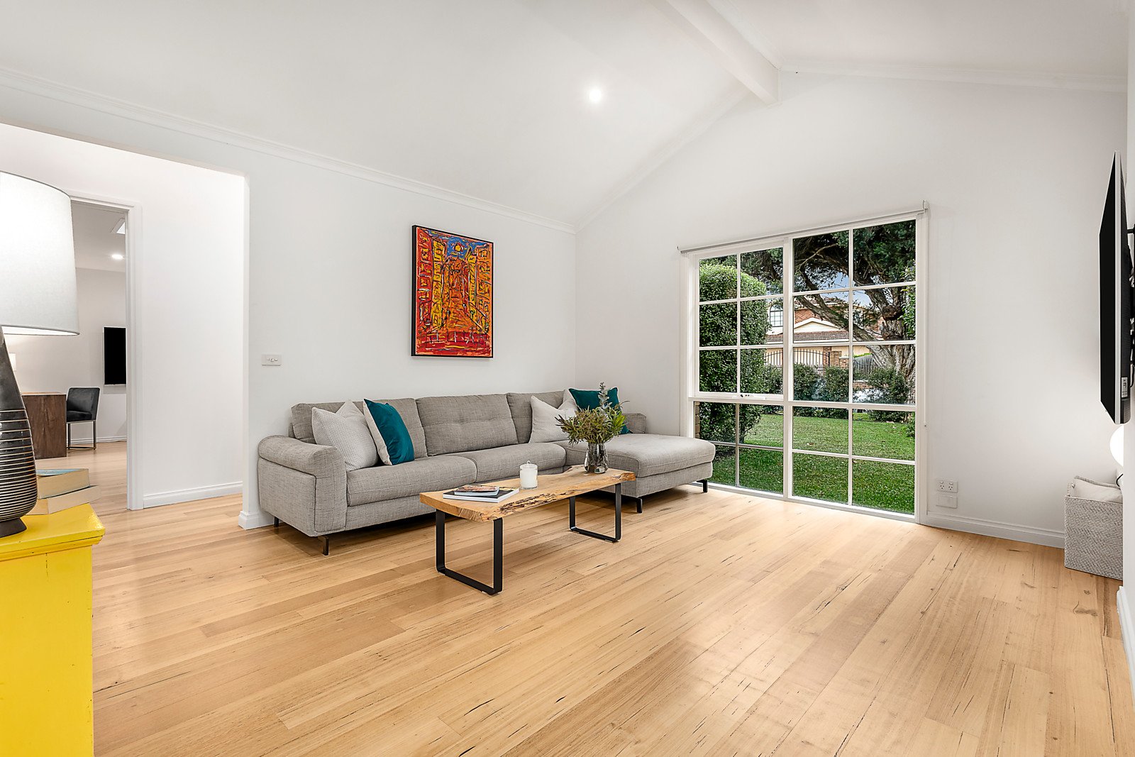 Pale Tasmanian Oak floors flow through the sky lit central hall to an expansive retreat and a generous lounge room opening to an east facing courtyard. The light-filled dining area and casual living room served by a gourmet European kitchen appointed with stone benches open to a private west-facing paved courtyard, surrounded by greenery. The oak floors continue through the spacious main bedroom with a designer en suite and built in robe, two additional bedrooms and a chic bathroom.