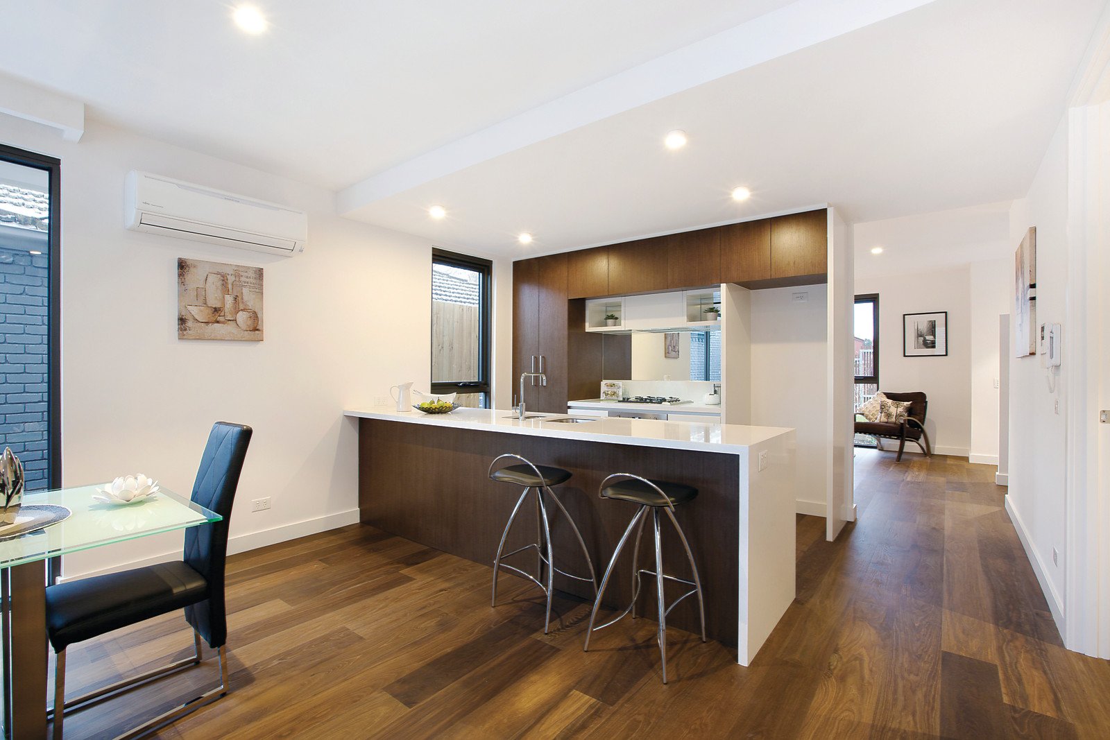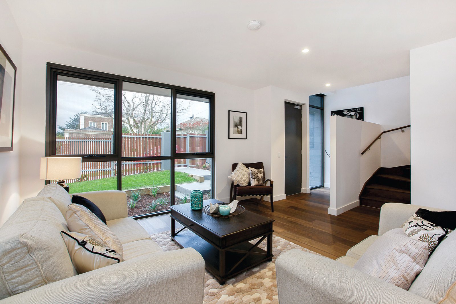 Strong architectural lines and quality finishes complement family-sized proportions within this contemporary four bedroom townhouse of 307sqm (approx.) in a superb location in close proximity to Balwyn High, Balwyn Village and the 109 tram. Versatile spaces include formal sitting and adjacent open-plan family living featuring a sleek kitchen with stone benchtops and Smeg appliances, opening through floor-to-ceiling glass to a landscaped private garden. Additional basement level features media lounge, study/fourth bedroom and laundry, plus gym/storeroom and access to a huge double garage. A light-filled first floor completes the offering with three generous bedrooms all with BIRs (main with dressing area) sharing a sizeable retreat with views to the surrounding area. Further functional features include powder room, intercom and security system.