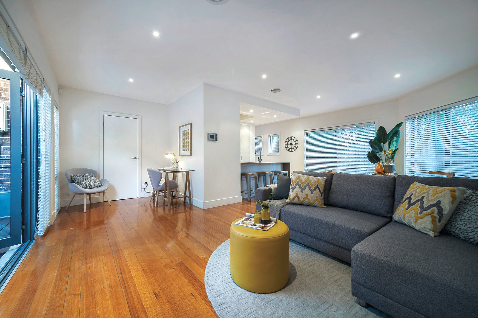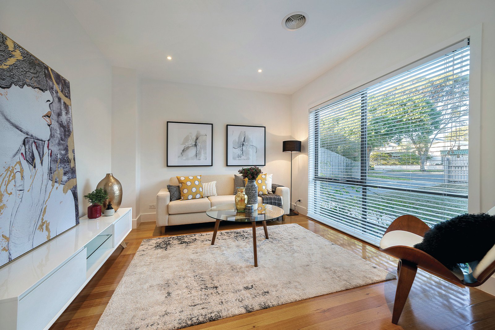 2 generously sized bedrooms with built in robes and a central family bathroom with bath and separate powder room are complemented by a sophisticated main bedroom equipped with walk in robe and ensuite. The ground floor is complete with a versatile second living space providing flexible options as an office, play room or fourth bedroom. Practical solutions include a well equipped laundry, ground floor powder room, high ceilings, polished timber floors, double garage, and ducted heating/cooling.