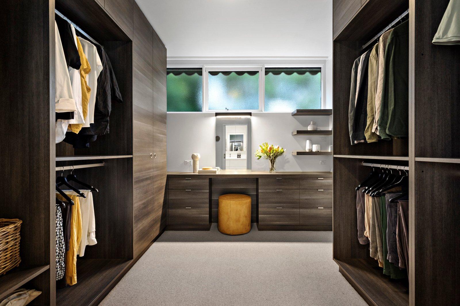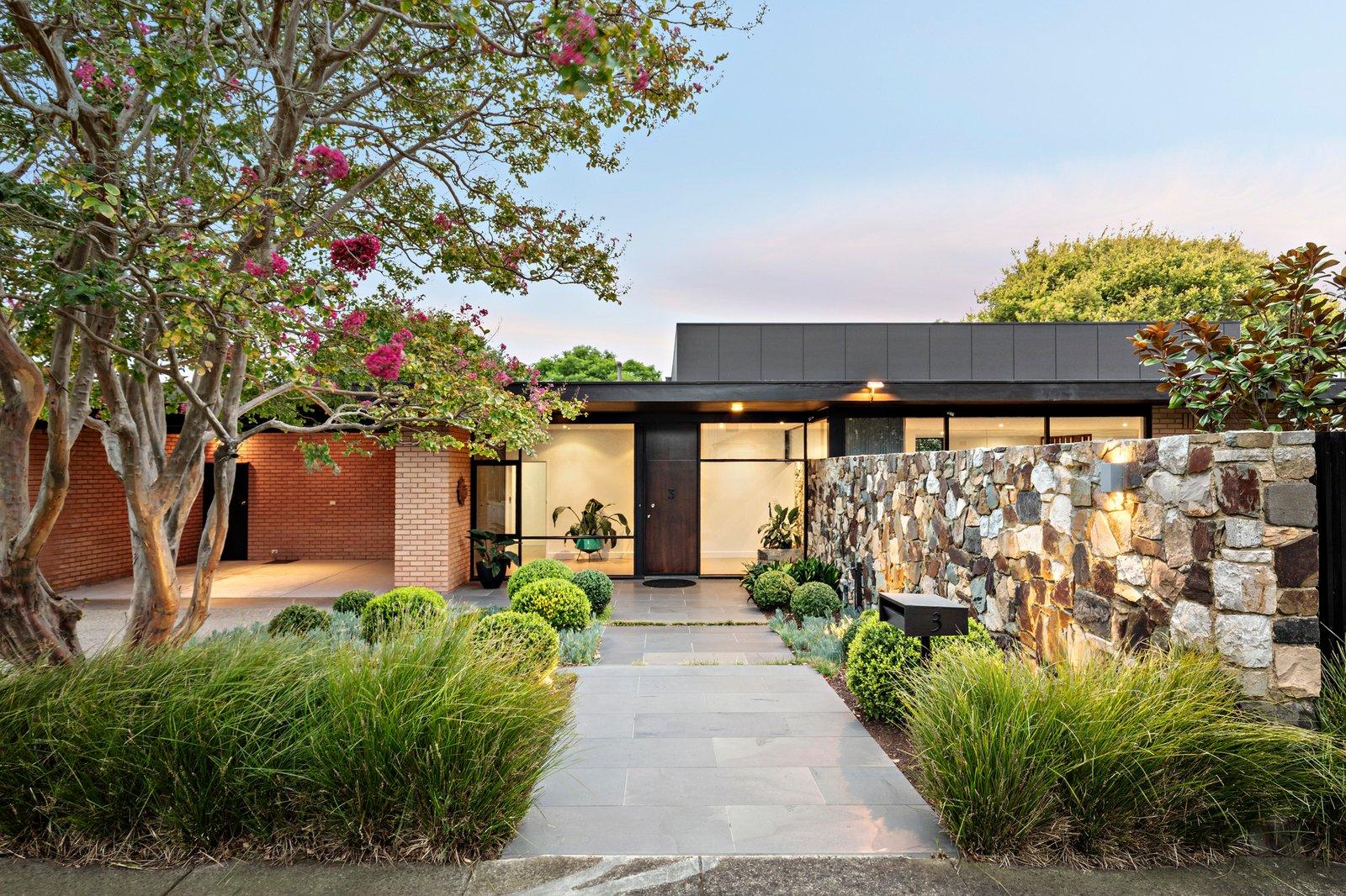 The breathtaking result dazzles with floor-to-ceiling glass and expansive 4.5-metre-high spaces for living and entertaining, gliding walls of glass offering seamless connectivity to a private outdoor area incorporating a mod-wood deck and blue-stone surrounded quartz surfaced swimming pool. Perfectly positioned for effortless entertaining, the central gourmet kitchen with stone and stainless-steel benchtops is equipped with all-Miele appliances, while a George Nelson Bubble pendant light defines the dining area. Hand-stacked sandstone rock walls and planters adorn both the interior and exterior spaces, including the hearth around the open fireplace in the formal lounge, while bluestone crazy paving that edges the fully enclosed lushly lawned front garden further endorses the home’s mid-century origins. Resplendent with its original built-in leather-topped curved desk and shelving, the home office/study is a true modernist’s delight. The main bedroom opens onto the pool deck, and a reconfigured walk-in robe/dressing room and luxe ensuite.