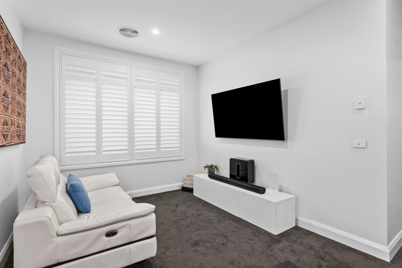 Glass sliding doors open to the undercover travertine-paved alfresco zone, with lighting, a ceiling fan, built-in outdoor kitchen space and gas plumbing for the barbecue, which flows to a mod-grass lawn and an additional outdoor decked area, perfect for afternoon drinks as the sun goes down.