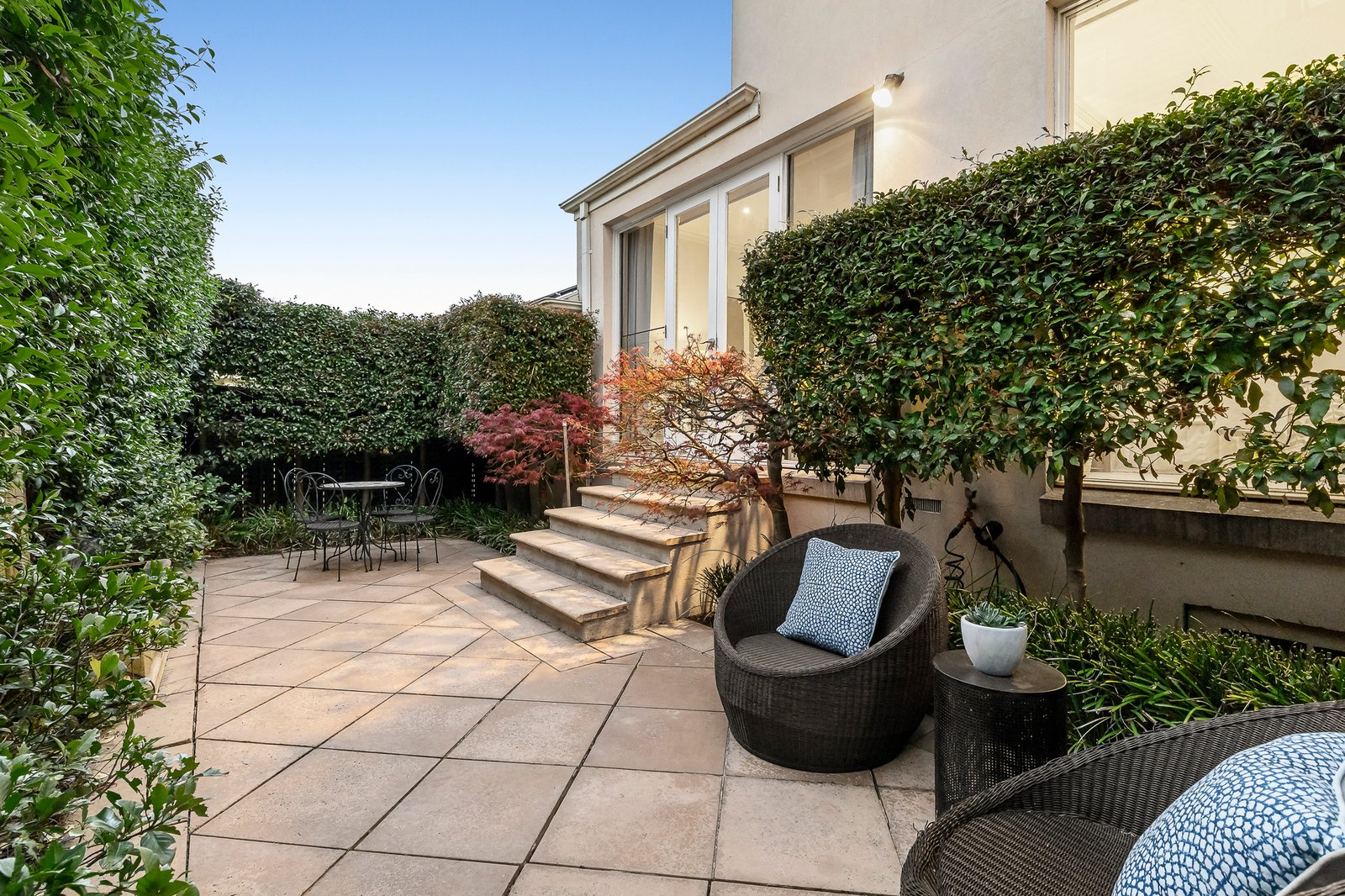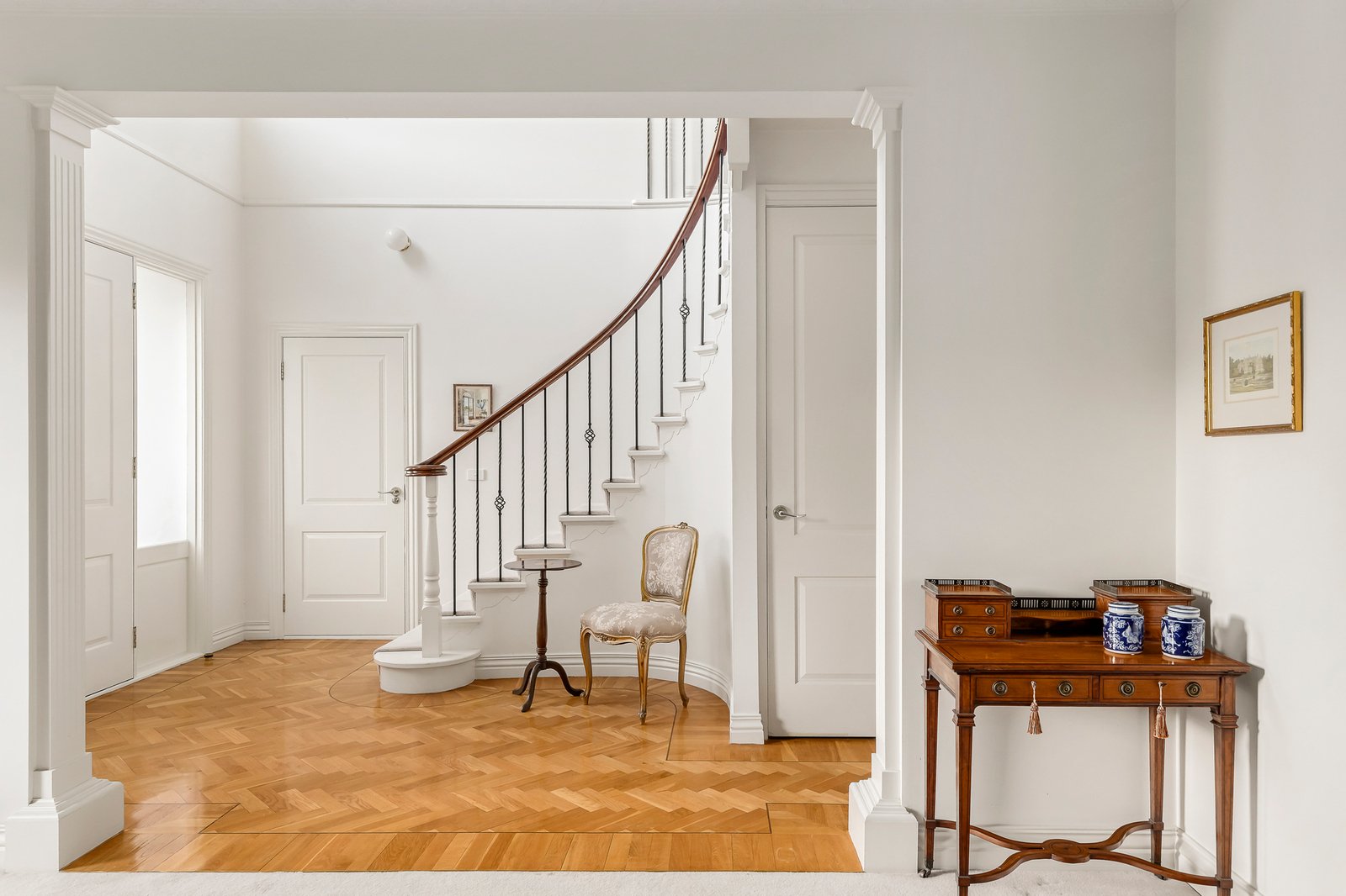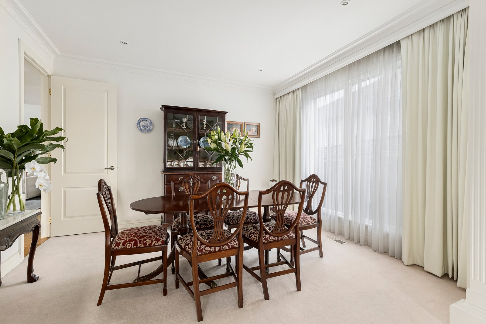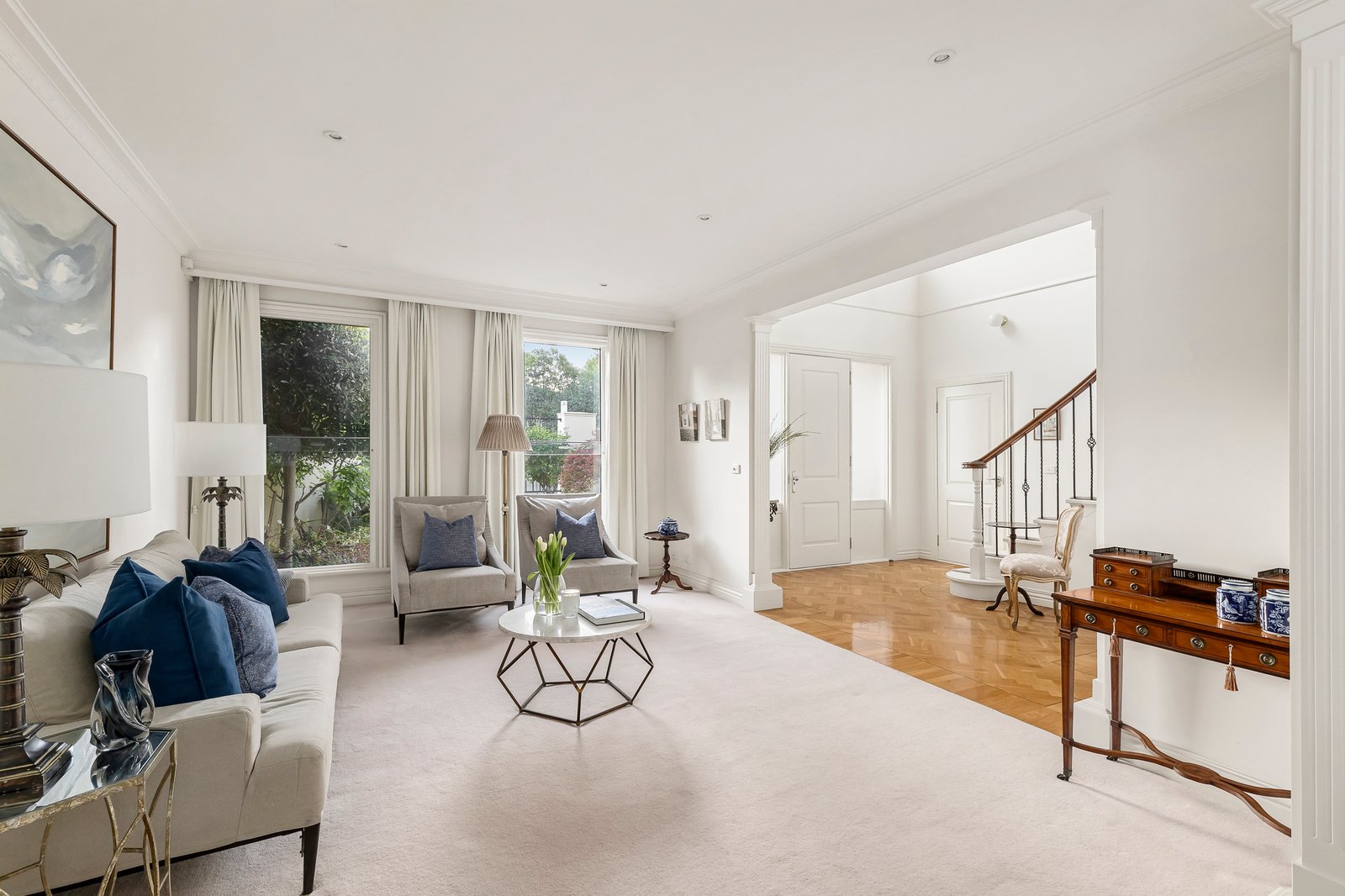 Reflecting classic architectural themes and timeless elegance, this refined 4-bedroom/3-bathroom executive residence’s impressively proportioned dimensions superbly meet all the requirements for modern family living in a location highly sought after for its unbeatable lifestyle amenities. Beneath an imposing double height void, the inviting entrance foyer featuring parquetry floors introduces a gracious sitting room and an elegant formal dining room. Superbly oriented to capture northern light, the generous family room is served by a gourmet kitchen appointed with stone benches and European appliances. Double doors reveal a private paved north-facing courtyard enhanced by a tranquil water feature and surrounding greenery. A double bedroom with built in robe and a dual access marble en suite is conveniently positioned downstairs while a curved staircase leads up to two spacious robed bedrooms, a marble bathroom and the beautiful main bedroom, with walk in robe and marble en suite, enjoying wonderful views to the Dandenongs.