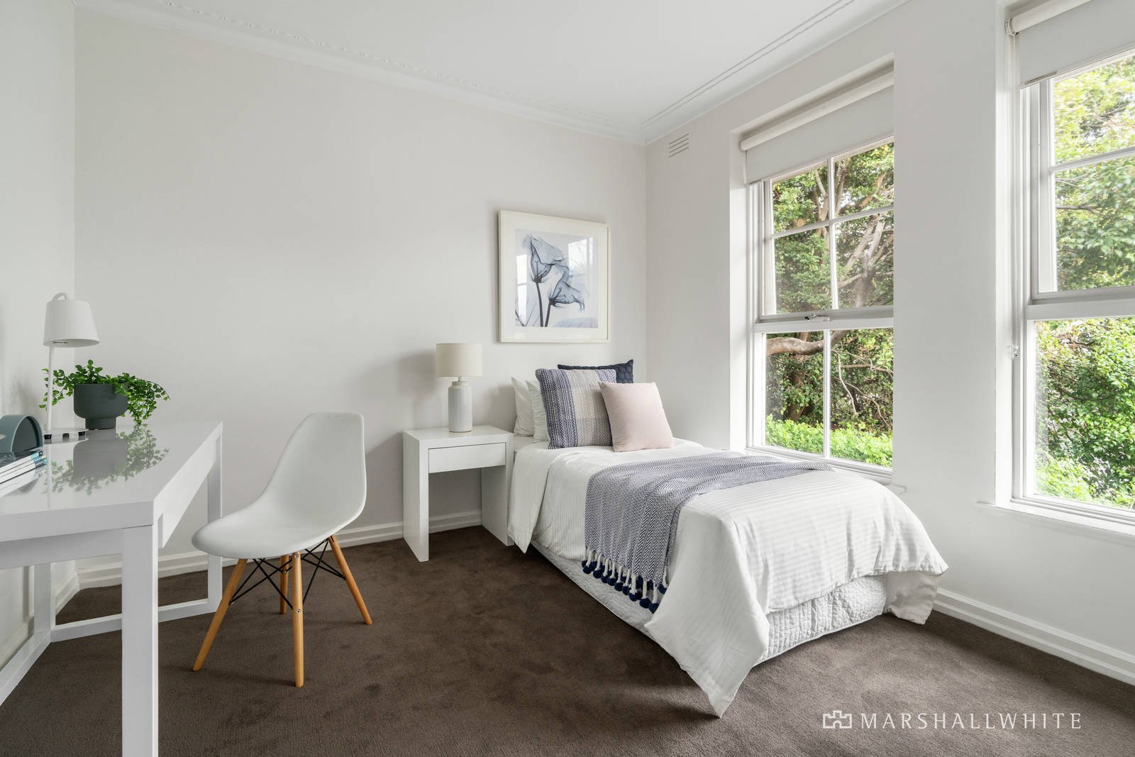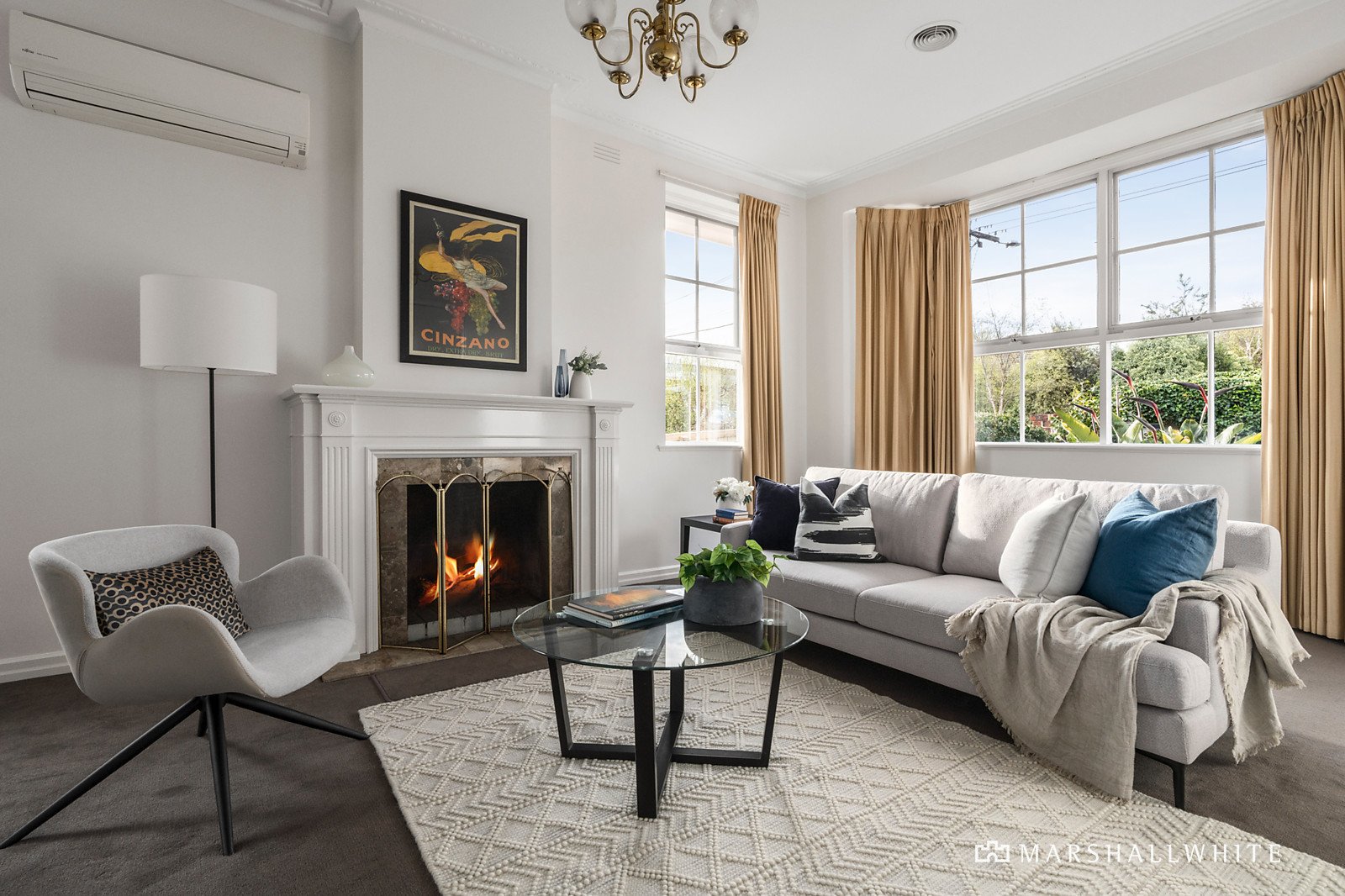 High ceilings accentuate the scale of the wide entrance hall, elegant formal dining room and elegant sitting room with fireplace, overlooking the picturesque north-facing private walled garden. The well-appointed kitchen and bright casual dining area open to a rear garden. The generous main bedroom with en suite and walk-in robe, is accompanied by two additional bedrooms and a bathroom.