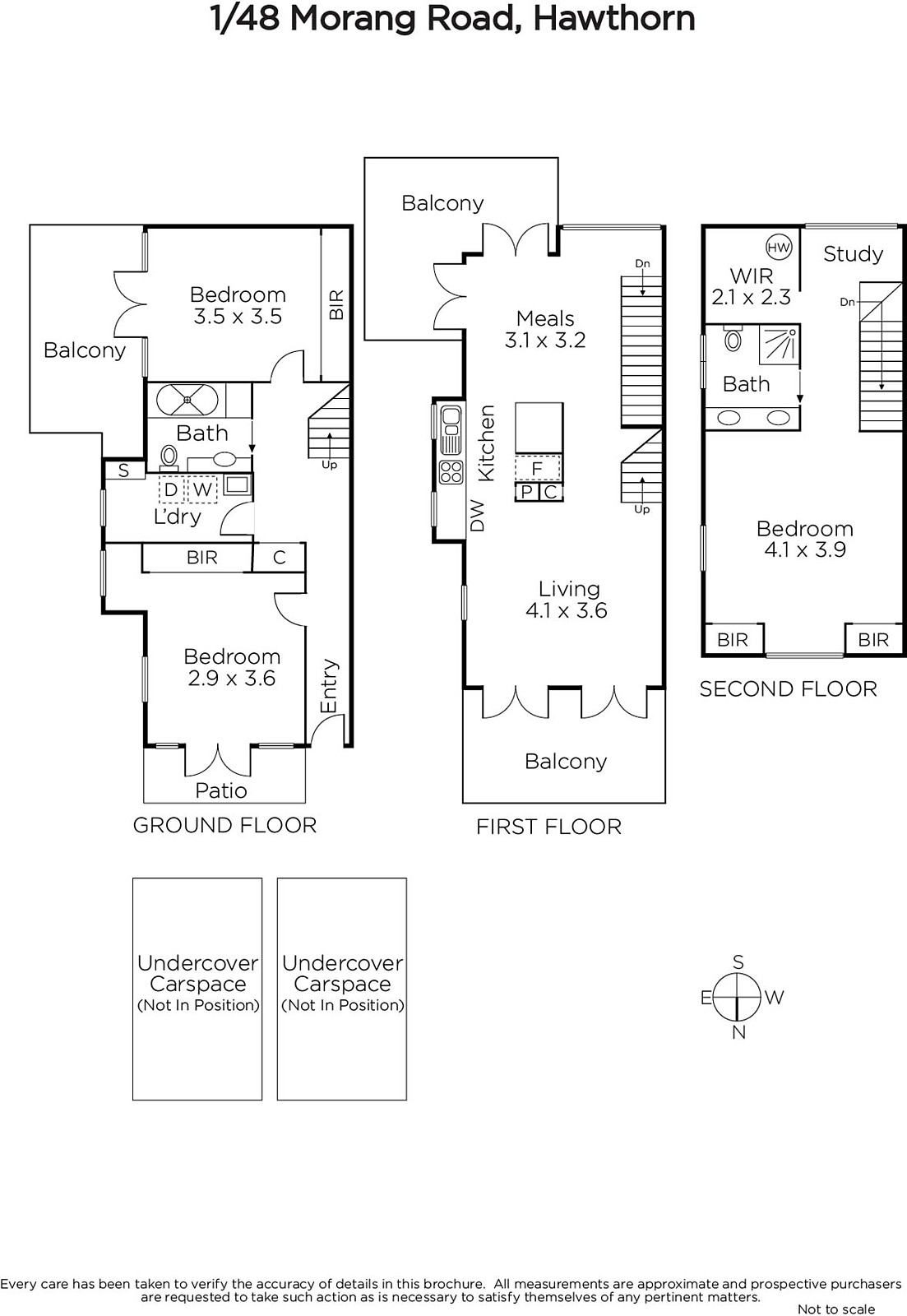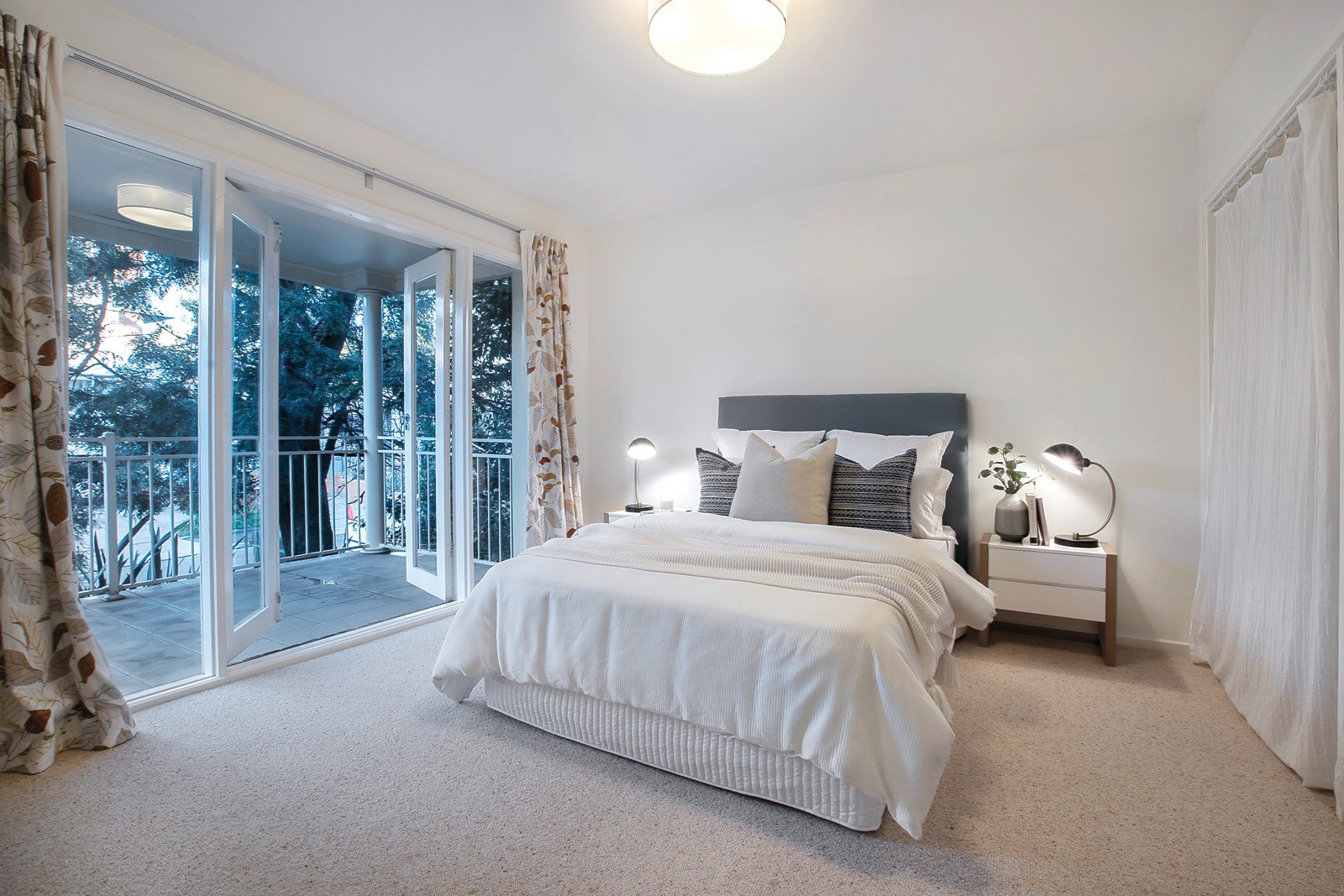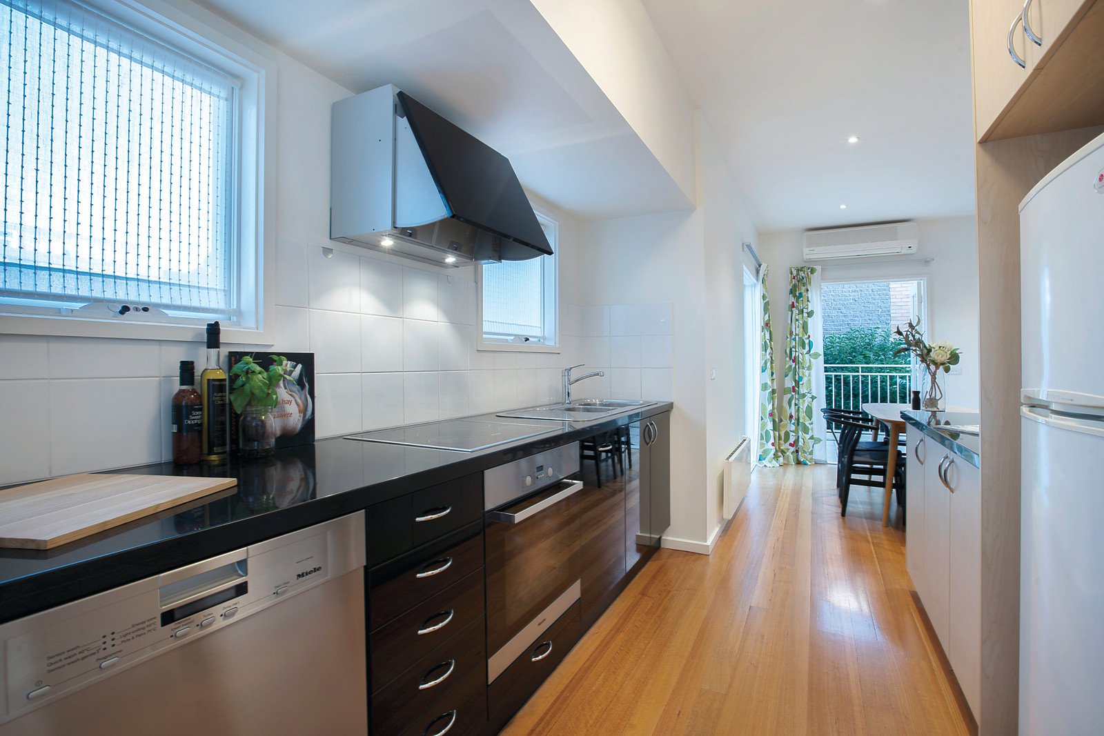 Abundant natural light bathes the exceptionally well-proportioned open plan living and dining areas on the first floor, enhanced by timber floors and two generous balconies perfect for entertaining. At the centre of this living space is a sleek kitchen appointed with stone benches and Miele appliances. The main bedroom enjoys the privacy of its own top floor level, complete with a bright ensuite, walk-in-robe and study space, while the ground floor features two additional double bedrooms (each with BIR and their own balcony or patio), second bathroom and separate laundry.
