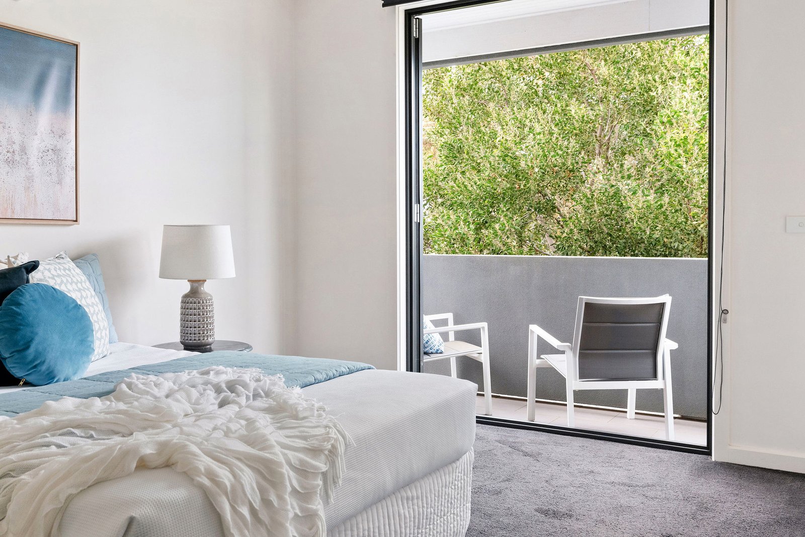 The entry introduces coastal-themed neutral interiors, featuring engineered timber flooring and an open plan living/dining/culinary area incorporating a sleek kitchen space with glossy white cabinetry, subway tiles splashback, stone benches, a Smeg freestanding oven with gas cooktop and a Bosch dishwasher. Glass sliding doors glide open to the private, alfresco courtyard, with a paved and low-maintenance garden area currently featuring a pair of tall sunflowers enjoying the northerly aspect. A timber staircase leads to the upper level, which is plushly carpeted, and comprises three bedrooms, all with individual split system heating/cooling, and the main bathroom. The upper-level main bedroom has a walk-through robe, shower ensuite and private balcony, while the downstairs bedroom suite has built-in robes.