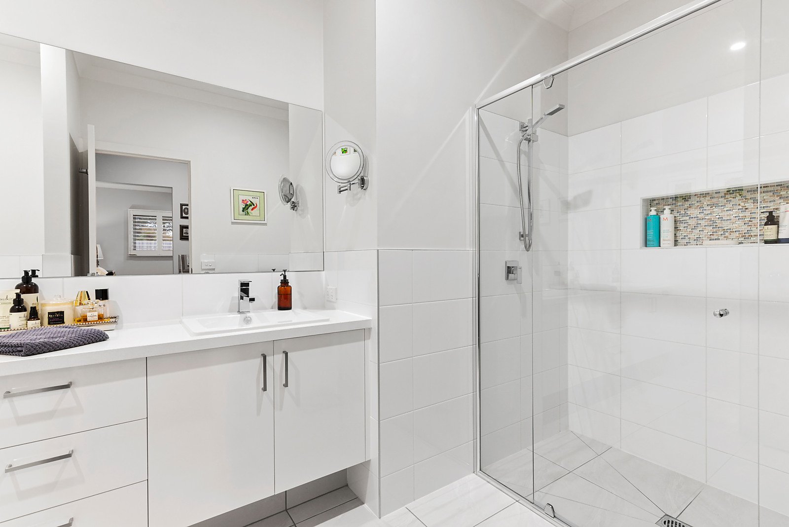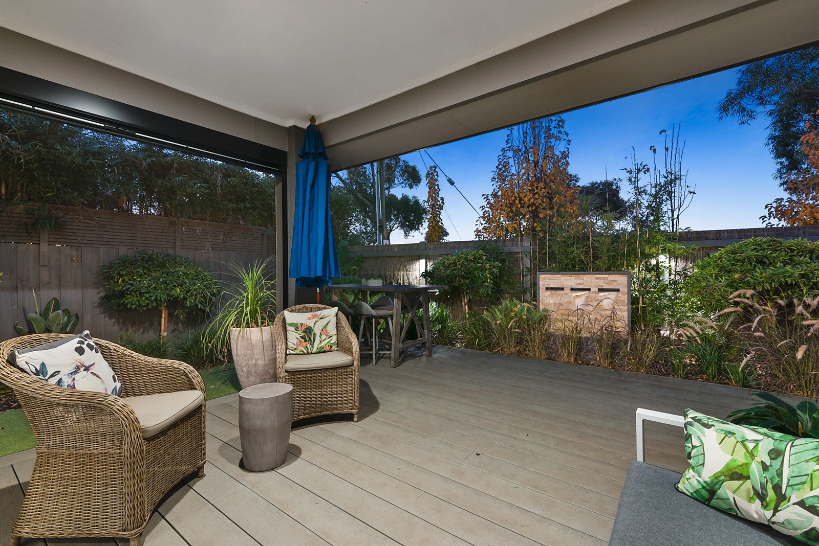 A wall of sliding glass provides a seamless transition to a heavenly frangipani-scented garden sanctuary with maintenance-free deck, mod-grass for chore-free weekends and tranquil water feature, a wonderful oasis for alfresco dining and entertaining.