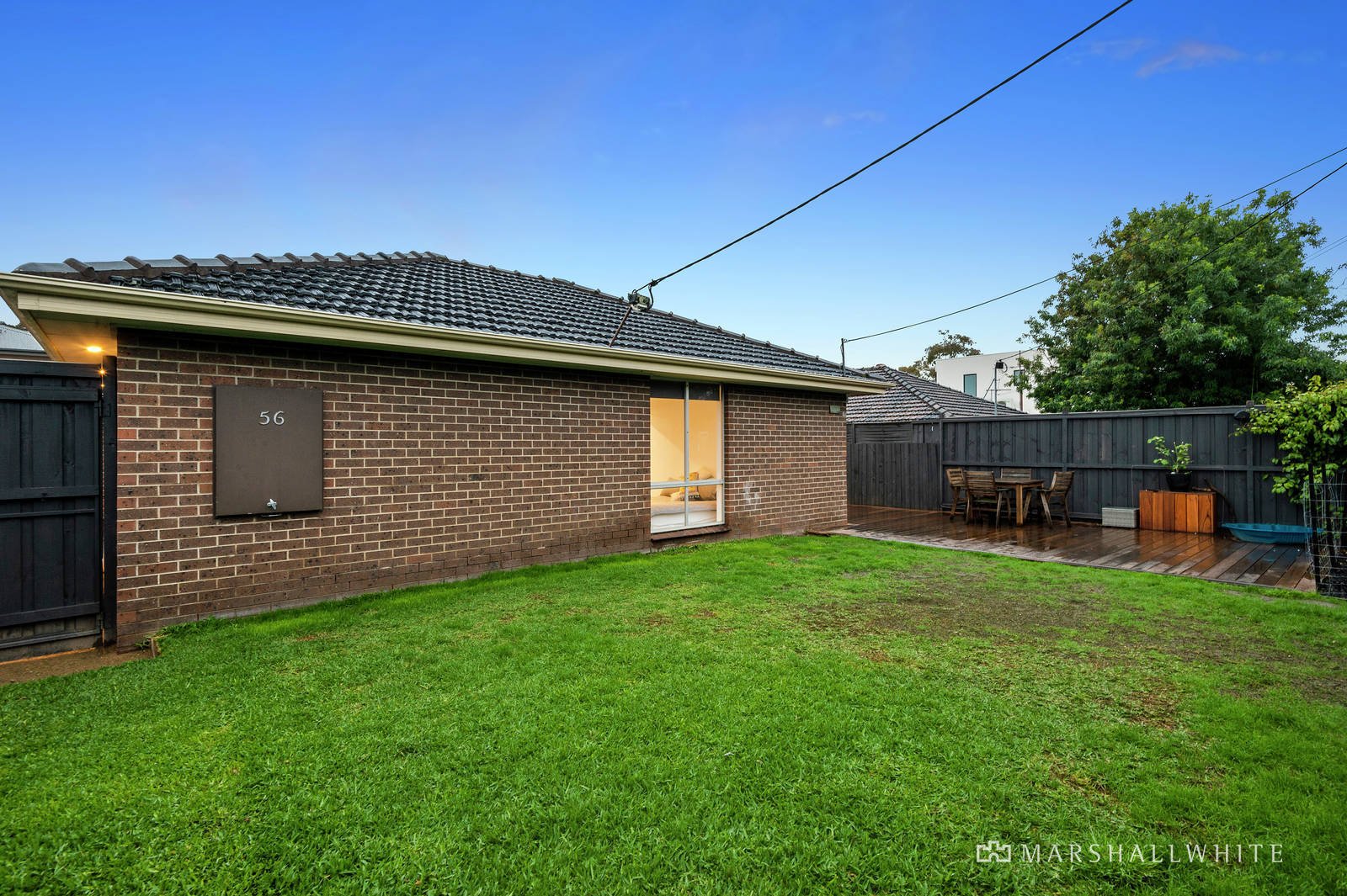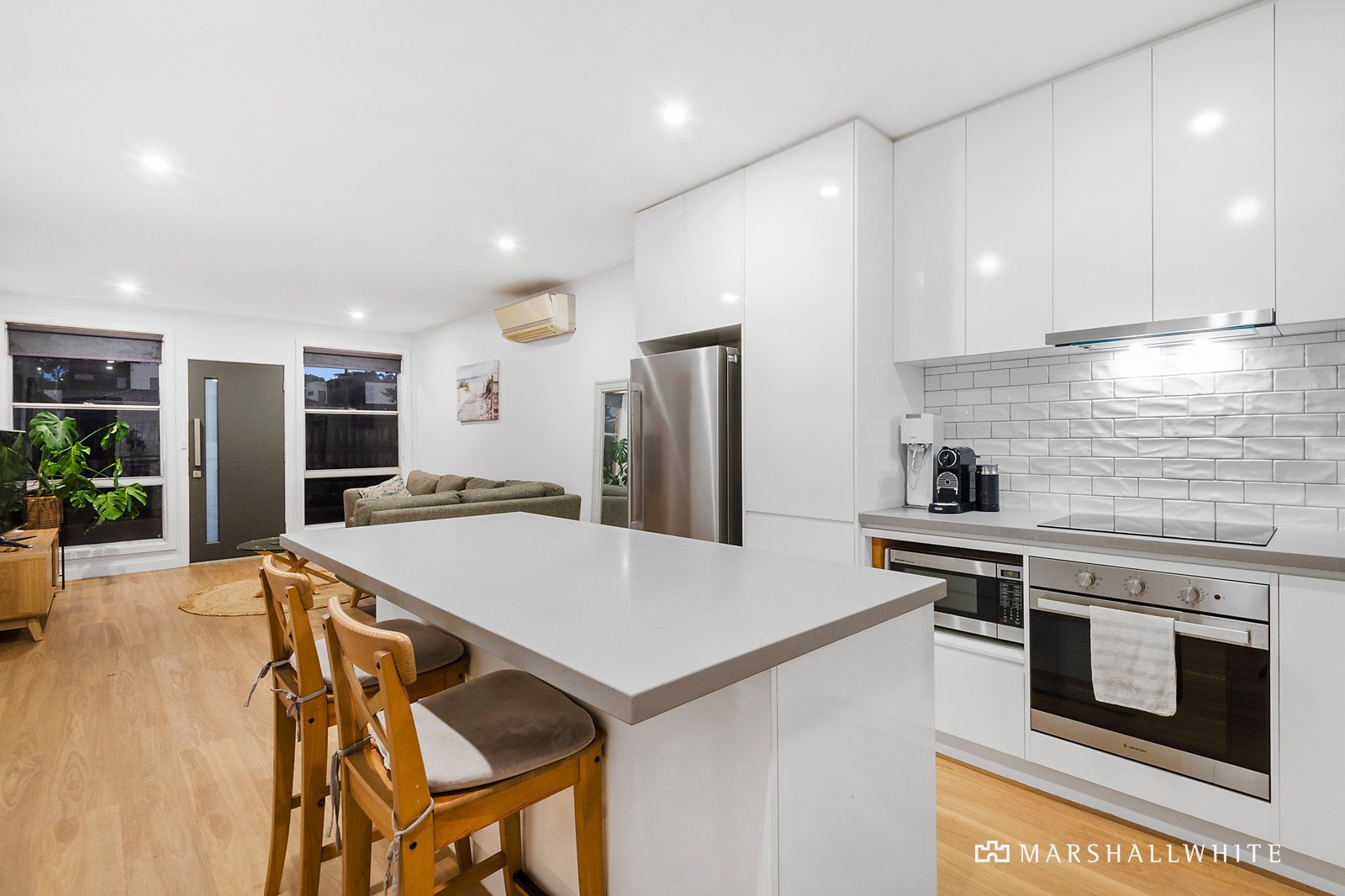 A front unit of three, the home unveils a reinvigorated layout with seamless entertaining found through a united lounge and kitchen inclusive of Caesarstone benchtops, generous island bench with breakfast bar and soft-close cabinetry. The adjoining rear deck and sweeping yard spills from the kitchen through a glass door, welcoming effortless entertaining potential.