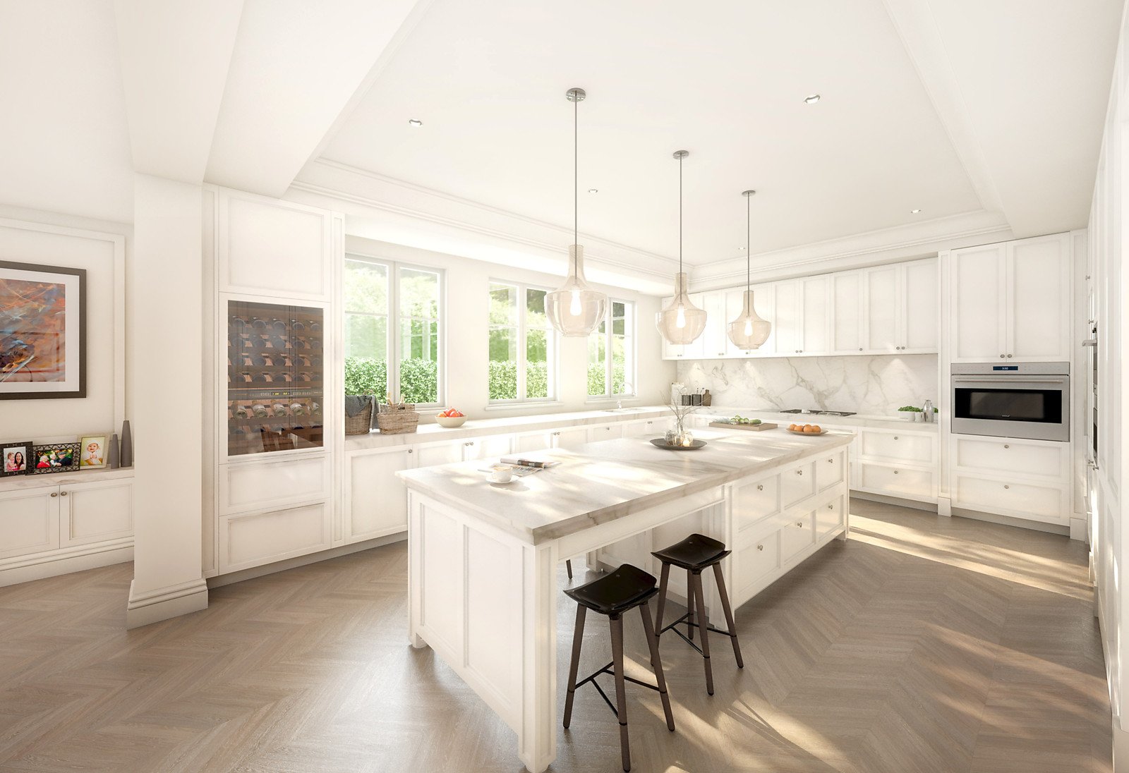 The kitchen's timber-veneer cabinetry and steel-finished appliances are complemented by a Calacatta natural marble slab with detailed stone edging. Luxuriously appointed with Wolf modular gas/induction cooktop and stainless steel oven, Gaggenau dishwasher, Blanco sink, Hansgrohe Talis S Variac sink mixer and Subzero drawer fridge/freezer and separate wine storage unit.