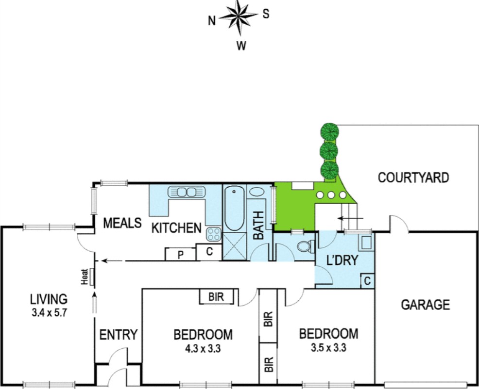 The property offers a spacious living/dining room, complemented by a separate kitchen/meals area. Two double bedrooms, each with a built-in wardrobe, surround a central bathroom with a separate toilet and a full size laundry.
