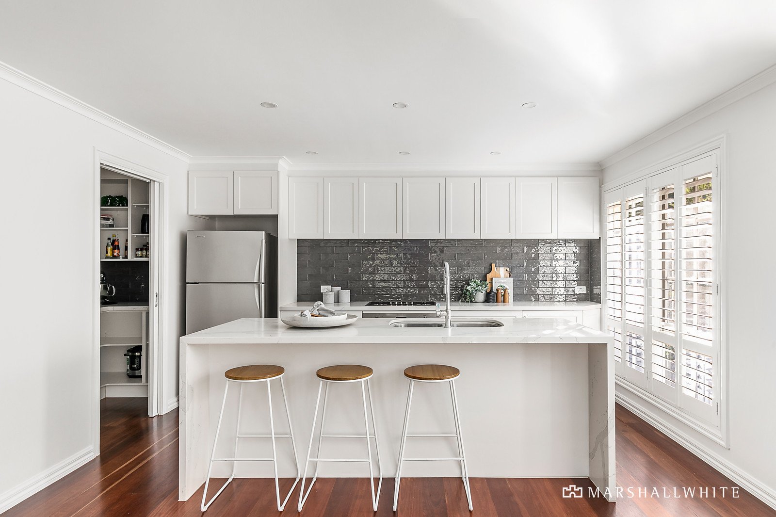 Renovated in 2017 the crisp white interior presents in immaculate condition featuring loads of natural light throughout, polished hardwood flooring, an expansive living room opening to the front hedge-lined garden, an equally generous dining and kitchen superbly equipped Calacatta Azara stone bench-tops, Smeg and Asko appliances plus a WIP. With an adjacent downstairs bathroom, laundry and powder room. Whilst upstairs has contrasting pale grey carpets through a retreat or study area, three large bedrooms all with built-in robes; and a pristine family bathroom. Other attributes include high quality fixtures and fittings, ducted heating and cooling, Plantation shutters and remote garage/storage with turning area.