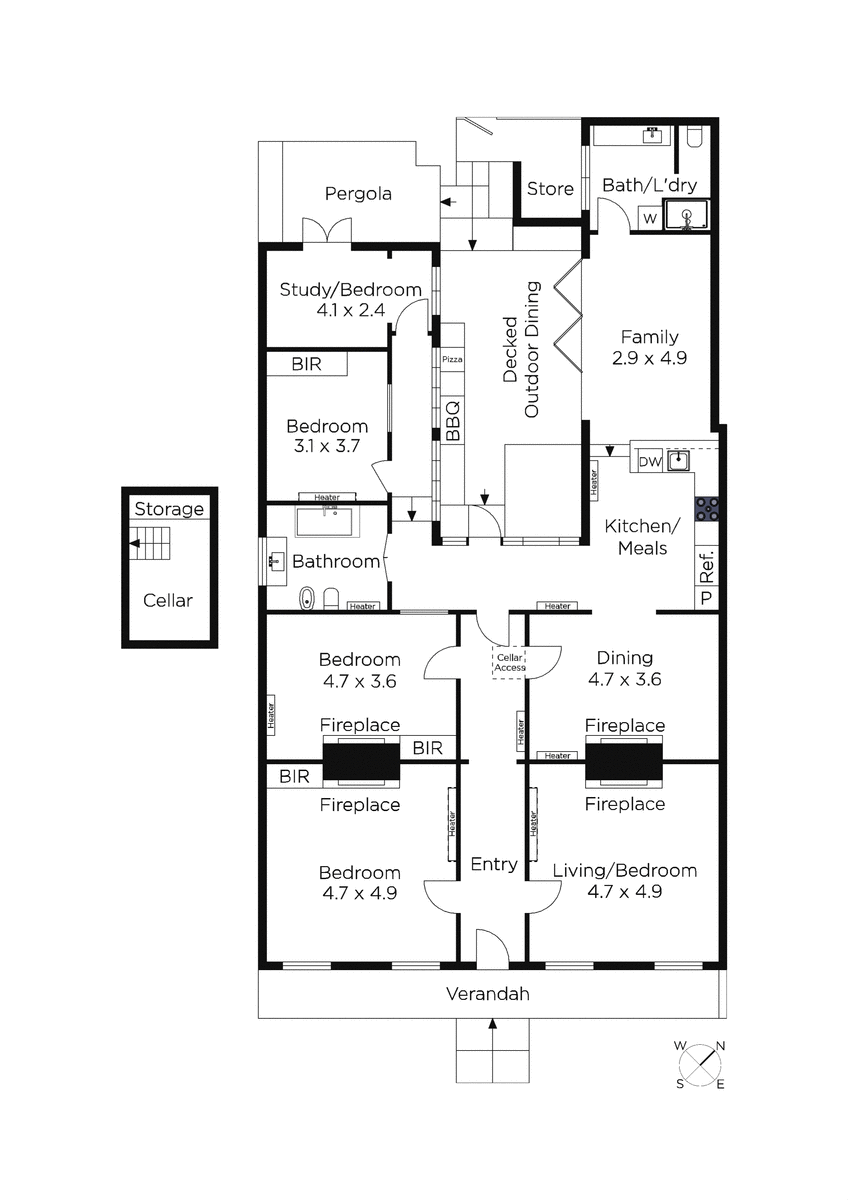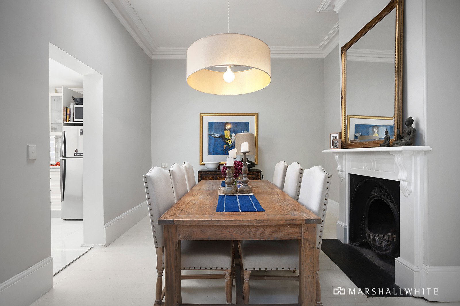 One of only two freestanding homes on the square, the traditional iron-lace verandah forms an inviting entrance to a wide arched hallway featuring soaring ornate ceilings and crisp white hardwood floors. Substantial sitting and dining rooms with open fireplaces encompass the home's hallmark properties before culminating in the sun-drenched family and kitchen domain at the rear, designed for private entertaining around a central courtyard. A recent refurbishment makes a stylish statement in the kitchen with quality appliances and stone-look countertops, whilst bi-fold doors allow for seamless entertaining, opening to the north-facing deck with a built-in BBQ and pizza oven. Three bedrooms are generously sized and peacefully positioned, including two with open fireplaces, whilst an office/fourth bedroom to the rear allows for lifestyle flexibility, allowing separate street access to Victoria Street through a second private courtyard.