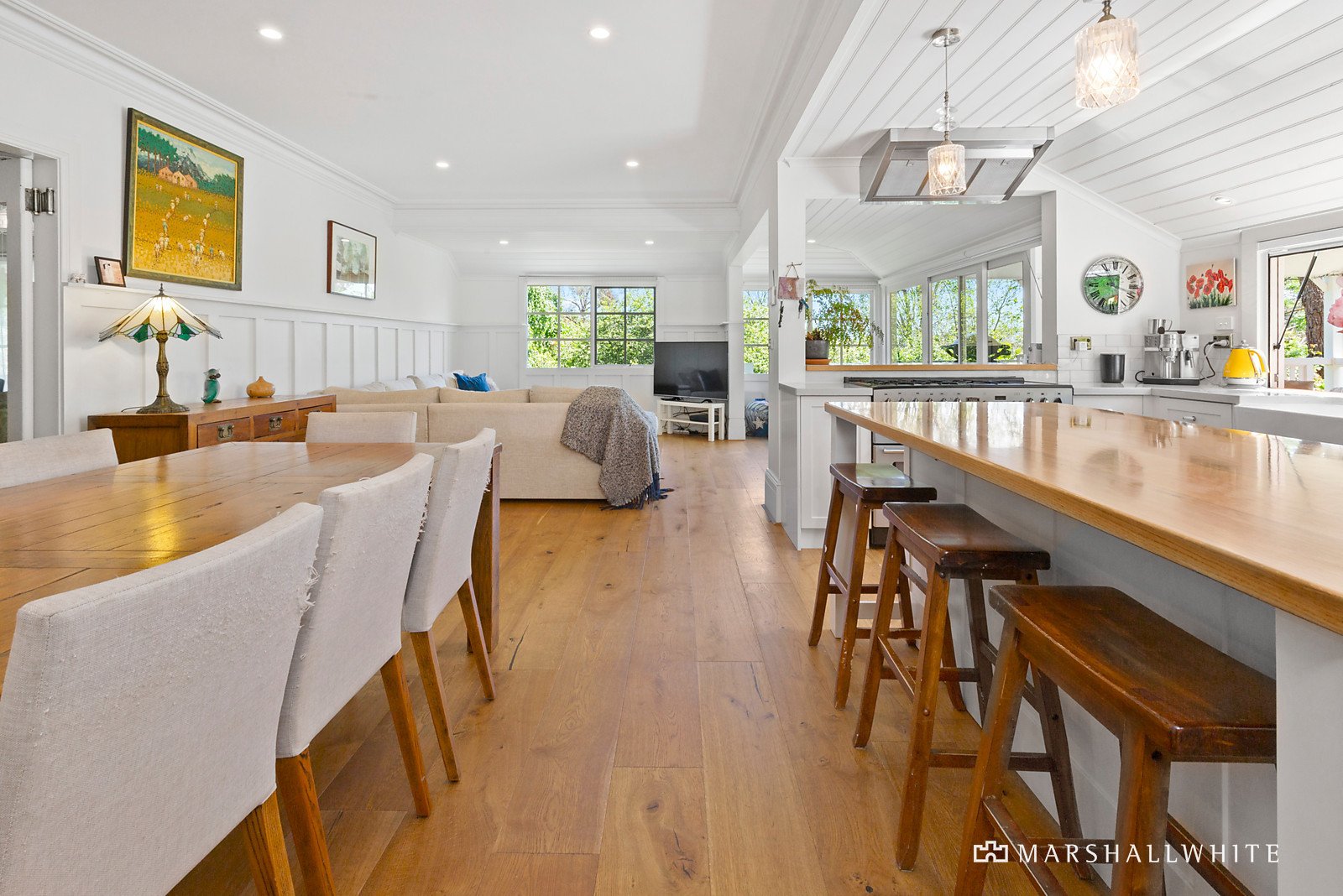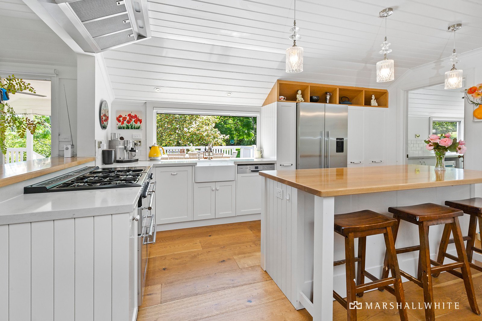 Undulating grasslands accented by idyllic gardens set the estate-like scene before the double storey weatherboard abode unveils an opulent interior. Unadulterated luxury spills beyond the entrance, where engineered timber flooring sits underfoot and invites you to share across the sweeping lounge into the living and dining space, anchored by the mesmerising kitchen, complete with timber island bench, farmhouse-style sink, servery window, and a freestanding Falcon oven. Pass through the Mr Ed style door to the functional laundry with an abundance of bench space and seperate powder room.
