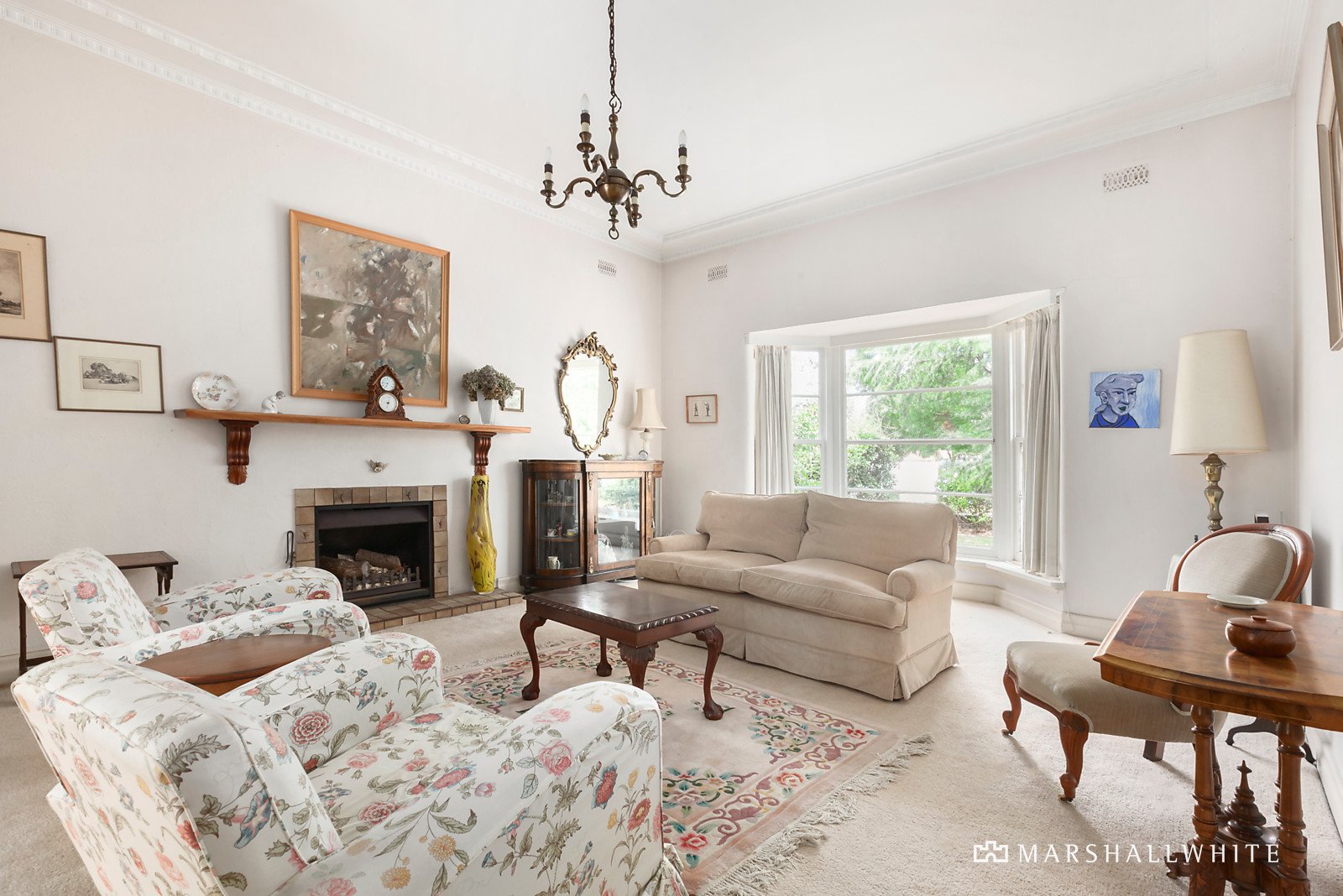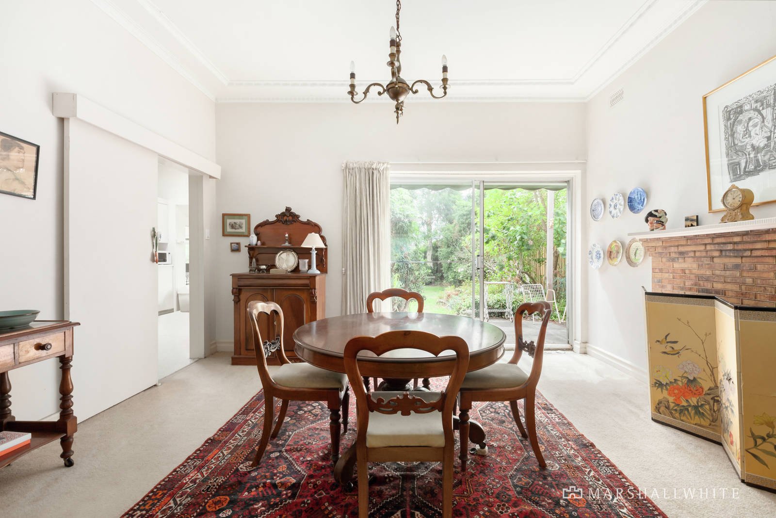 Behind a broad frontage, the central entrance hall flows through to a gracious sitting room with open fire, elegant formal dining room, three sizeable bedrooms with built in robes, a study, original bathroom and powder-room. Timber floors are featured in the expansive family room served by a separate well-equipped kitchen. The family room opens to the north-facing leafy garden with rear access to a right of way.