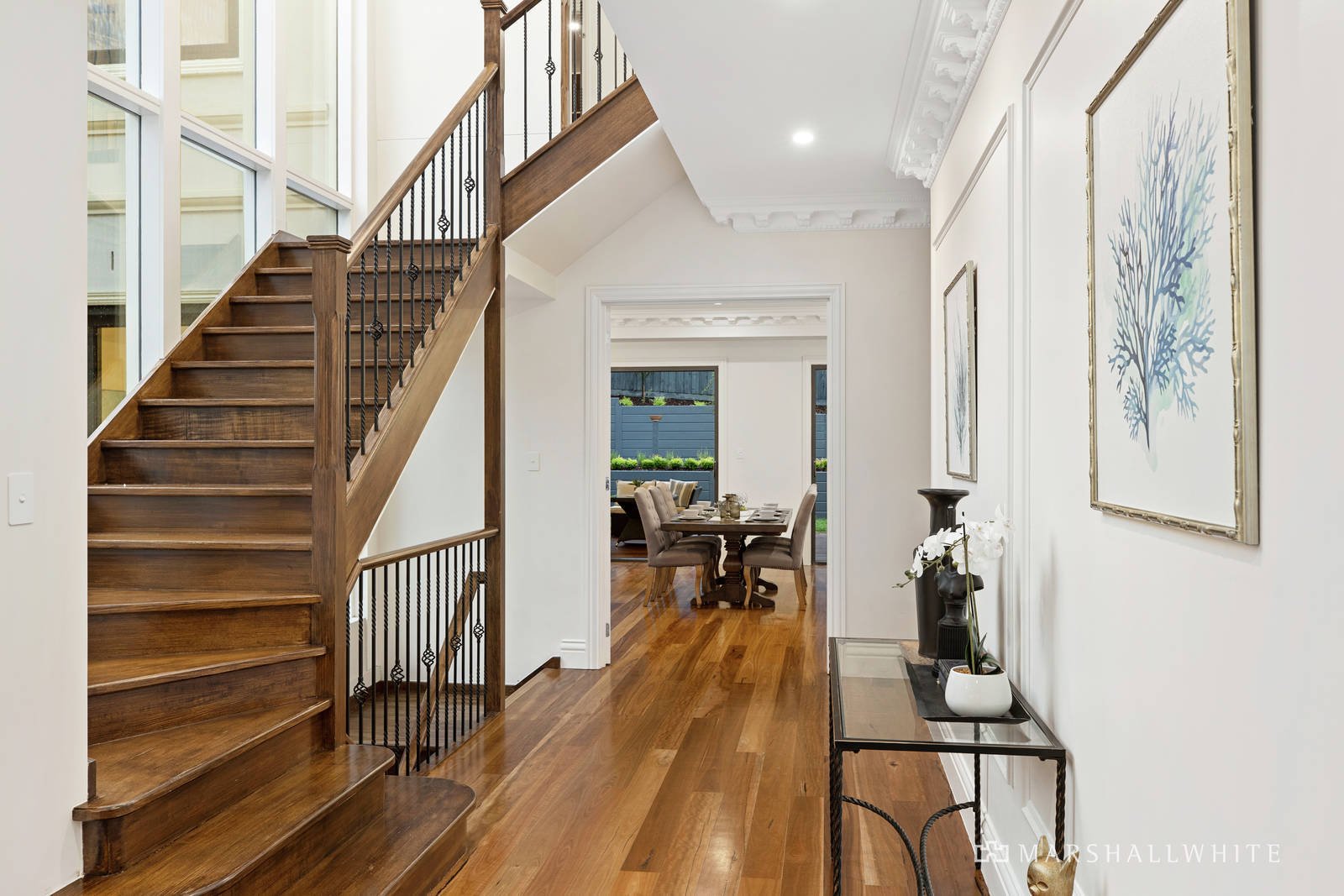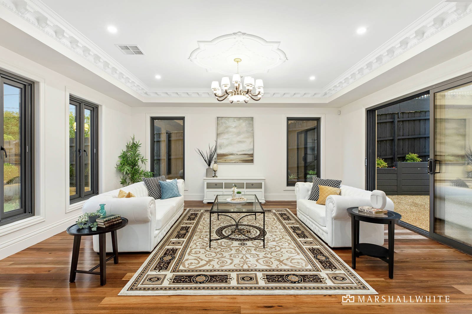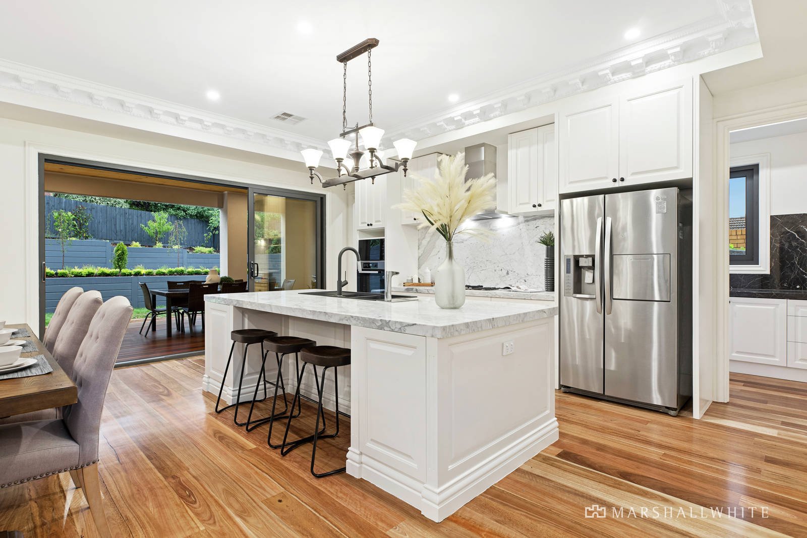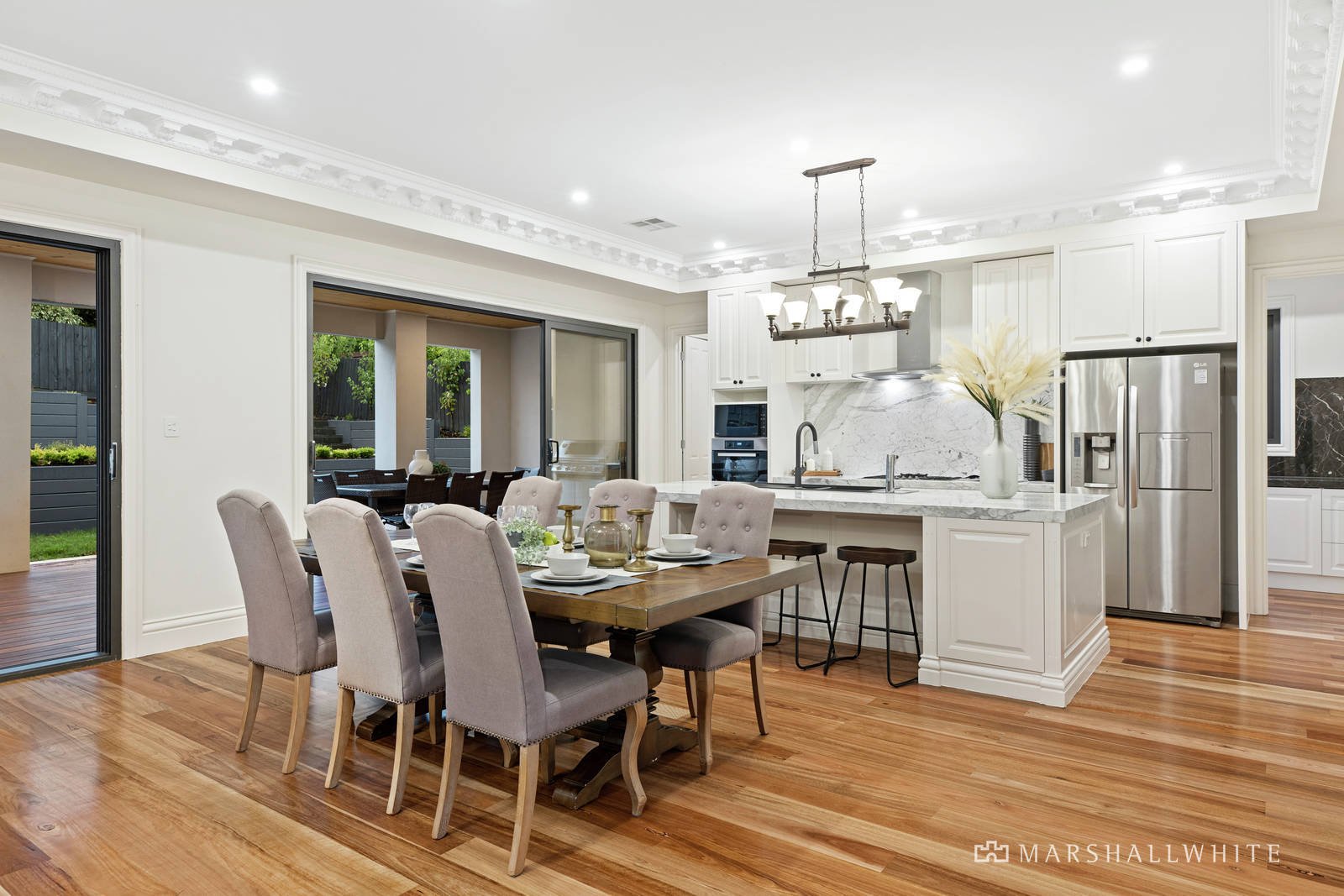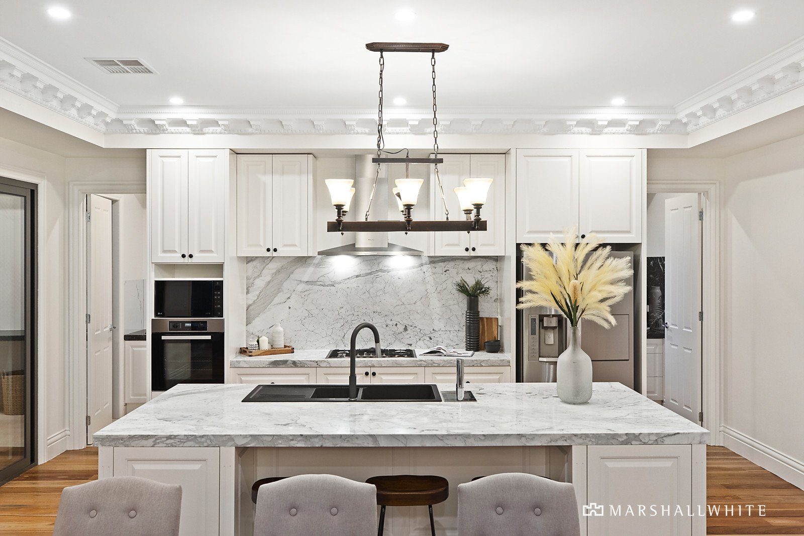 Upon entering this grandly elevated, tri-level home, you quickly discover a vast formal lounge room under towering ceilings of fine detail, all with seamless connection to a sunny internal courtyard and a relaxed flow to an open-plan rear. Arranged around a vast marble island bench, with a selection of Miele appliances and a Butler's Pantry, the kitchen / dining / living area flows through two sets of glass sliding doors to a huge, undercover entertainers' deck that suits intimate family dinners as well as larger scale parties.