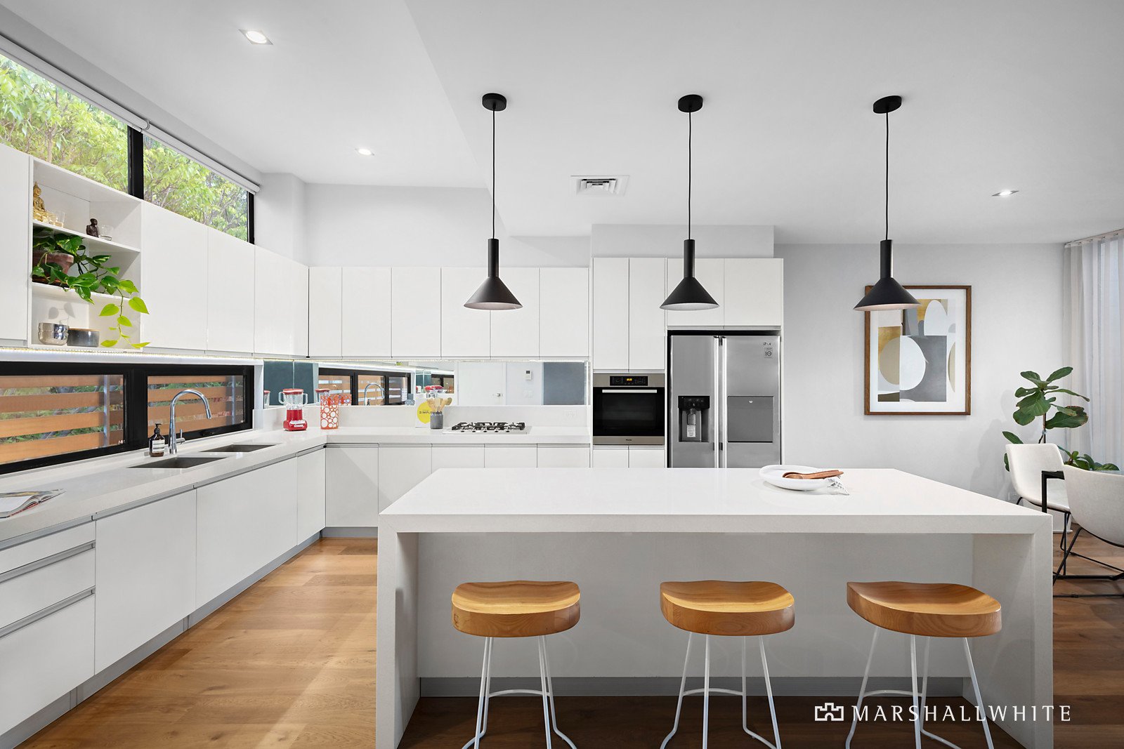 Indulge in the ultimate entertaining layout, with a generous open-plan living, dining and kitchen domain that extends fully to the western terrace via stacked sliding doors. A spiral staircase leads to an extraordinary rooftop terrace, primed for watching the NYE fireworks over a panoramic city skyline. Exuding a rare sense of seclusion with leafy treed outlooks, the kitchen’s superior suite of integrated Miele appliances include a near-new dishwasher and gas cooktop, set beautifully around a large island bench and a walk-in pantry.