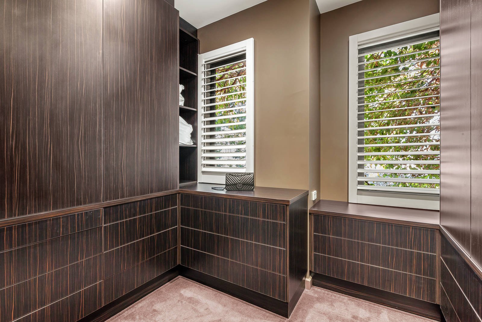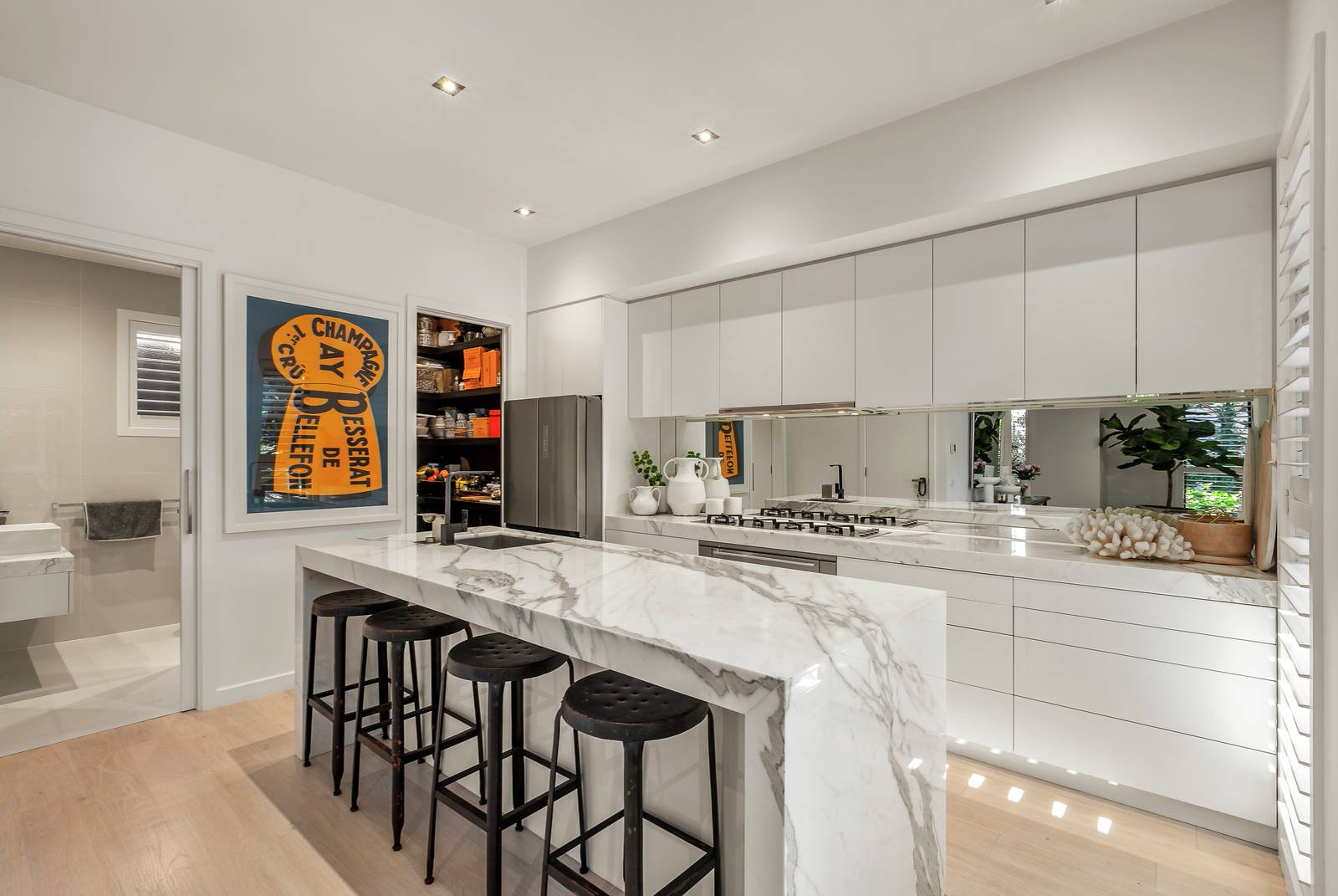 Instantly inviting with a rare sense of light and proportion, the open-plan kitchen / dining / living allows you to discover the richness of lime-washed American Oak under foot and plantation shutters that frame verdant leafy outlooks in all directions. A Barazza cooktop is complemented by a SMEG oven, Miele dishwasher, a customized walk-in pantry and recently polished Calacatta Marble surfaces to allow cooking in gourmet style, while a seamless flow outdoors to a deck and undercover BBQ area reveals an al fresco entertainers' spirit.