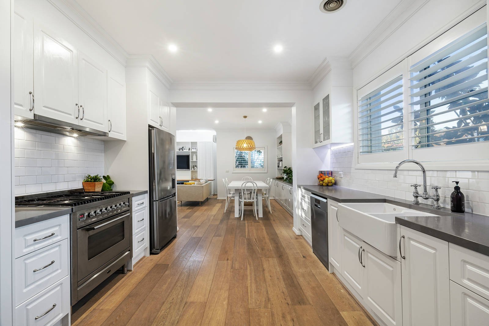 Be impressed by the style and open-plan spaciousness of this four-bedroom and study home, superbly enhanced for contemporary living and entertaining. Recent renovations have added a quality dimension to all main rooms, including the light-filled family room, spacious open-plan kitchen, and lounge. The transformation is inspired, with the kitchen featuring an Ilve six-burner range and dishwasher, double butler sink, subway tiling and Caesarstone benchtops. Relaxing at home is easy in the well-appointed family room, upgraded with stacking sliding doors, bespoke cabinetry and direct access to outdoors. An excellent floorplan has spacious bedrooms on each level, the option of a study or playroom, and welcome features including a renovated laundry, plantation shutters, and ducted cooling and heating. Step outside into the hedged front garden or sun-drenched decked area, where you'll find built-in seating, espaliered limes, an al fresco shower, and access to the rear double garage. Instantly welcoming and ultra-private, this is a smart choice for families wanting Hampton living near Thomas Street Reserve and in the Sandringham Primary School zone. Convenient address is minutes from many lifestyle destinations including the beach, cafes on Hampton Street, and Sandringham Farmers Market.
