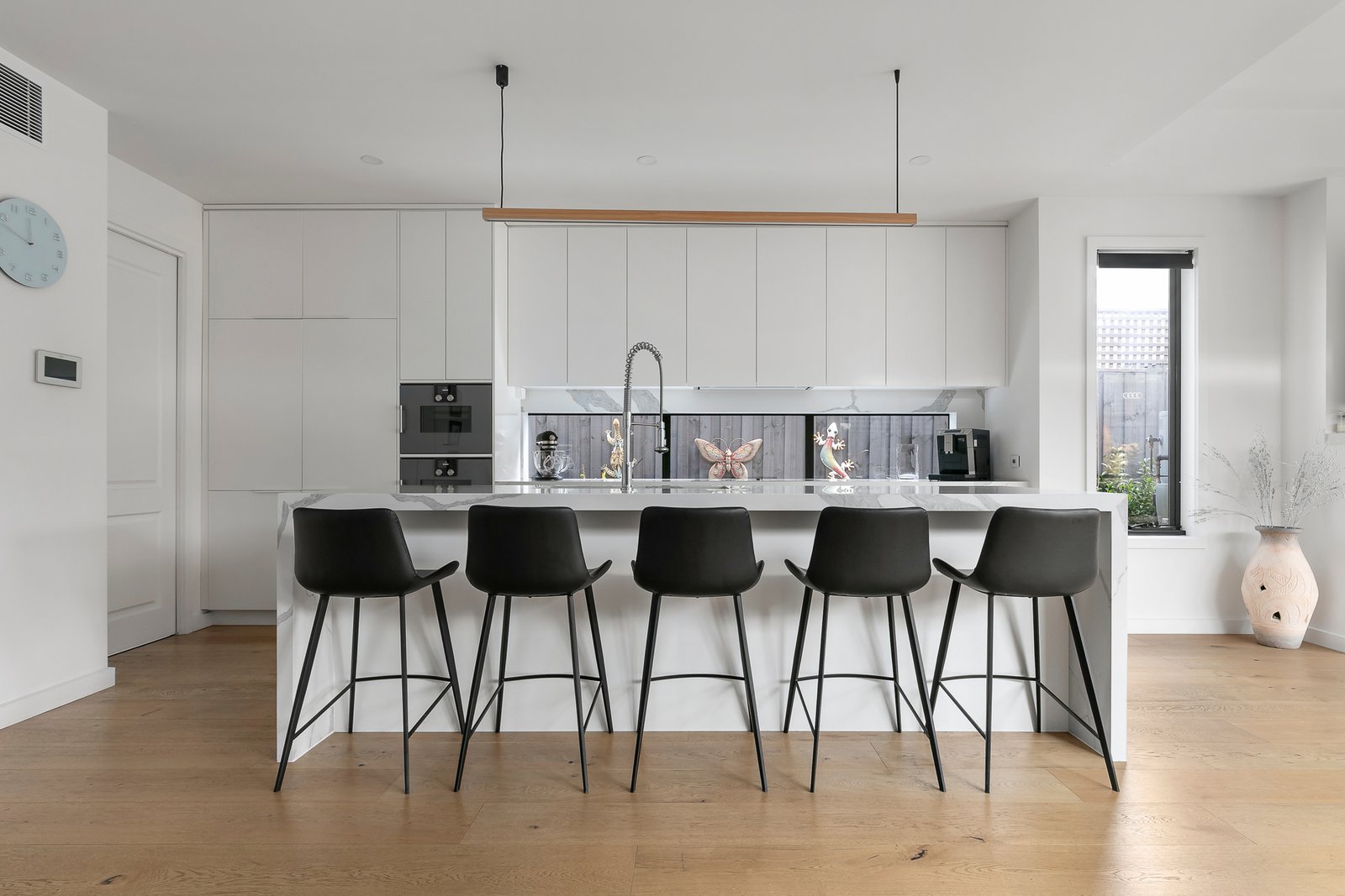 Offering an unsurpassed level of family luxury in a prime leafy locale, this architecturally curated, four bedroom, three bathroom residence is flawlessly presented in almost new condition. Organised over three elevator-connected levels of lavish sophistication, the home is grandly elevated above its exclusive Oak-lined streetscape to reveal sweeping views to the East and offer a level of appointment few can match. Gourmet cooks and proud entertainers will celebrate the proportion and impeccable finish of a vast open-plan dining and living area that is underpinned by a kitchen of waterfall-edged Calacatta Marble and a suite of Gaggenau appliances – including induction cooking – as well as an integrated Liebherr refrigerator and a full Butler’s kitchen. With a simple sense of elegance, glass sliding doors extend the open-plan outdoors to an undercover alfresco dining area where outdoor heaters ensure year-round enjoyment. Set down in the basement adjacent to the home’s four car garage, there is also a home cinema and a generous gymnasium, as well as a huge workshop area, plus there is a formal lounge on the ground level and an upstairs living area that is ideally suited to use as a teen retreat. Each of the bedrooms is an impressively scaled pamper zone with either walk-in or built-in robe storage and two with opulent fully-tiled ensuites, whilst additional highlights of the home include a third bathroom, a powder room, central and zoned reverse cycle heating and air conditioning, as well as American Oak flooring, a security alarm and secure video entry. This is a fiercely coveted family-friendly location just a short walk from parkland, Murrumbeena Primary School and all the cafes, bars and village-like charm of the Murrumbeena Railway Station precinct, plus you have Chadstone Shopping Centre just a couple of minutes away and easy access to the M1 Freeway as well.