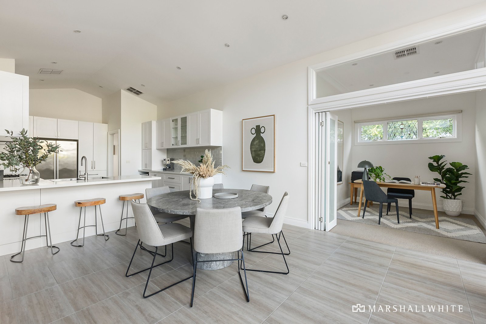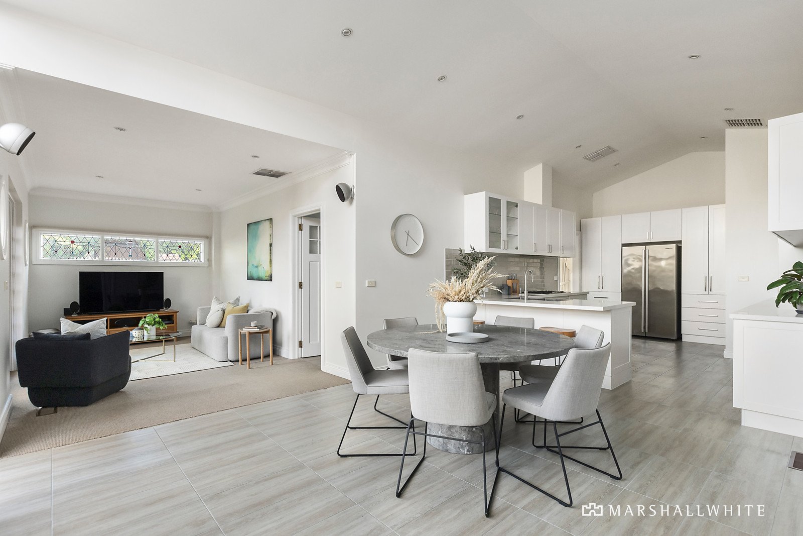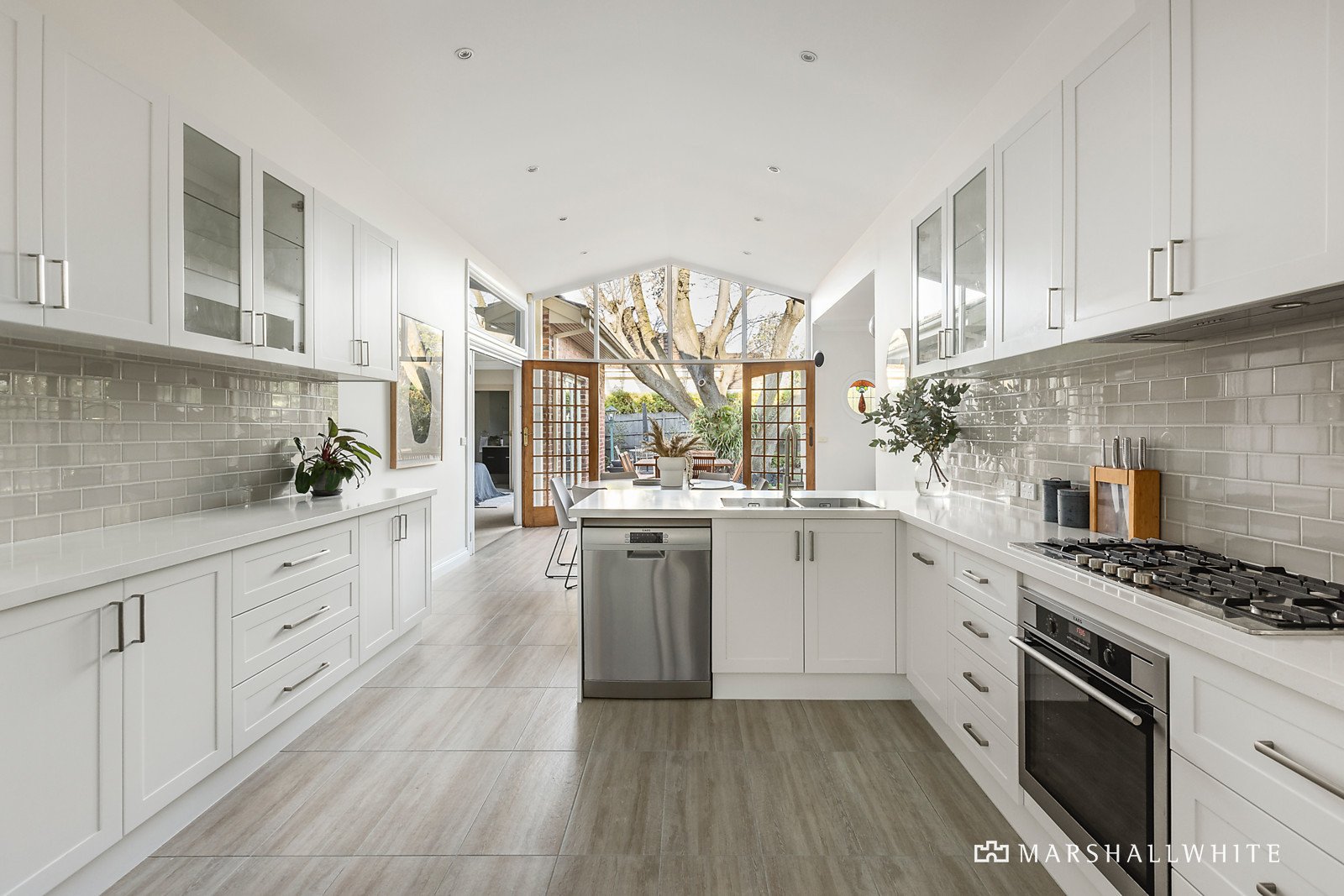 Radiating with natural light throughout, the expansive single level floorplan responds effortlessly to every modern family requirement. Timber floors flow through the entrance hall to a gracious sitting and formal dining room with an open fire. Vaulted ceilings amplify the sense of space in the stunning gourmet kitchen appointed with stone benches and AEG appliances while the light-filled family living and dining areas open out to the deep private northeast garden with large entertaining deck shaded by a magnificent elm tree. The generous main bedroom with designer en suite and built in robes is complemented by three additional bedrooms, a home office, stylish bathroom, and 3rd bathroom/laundry.