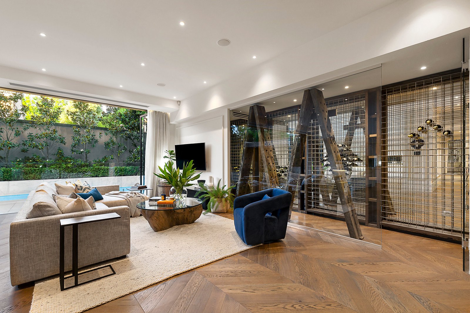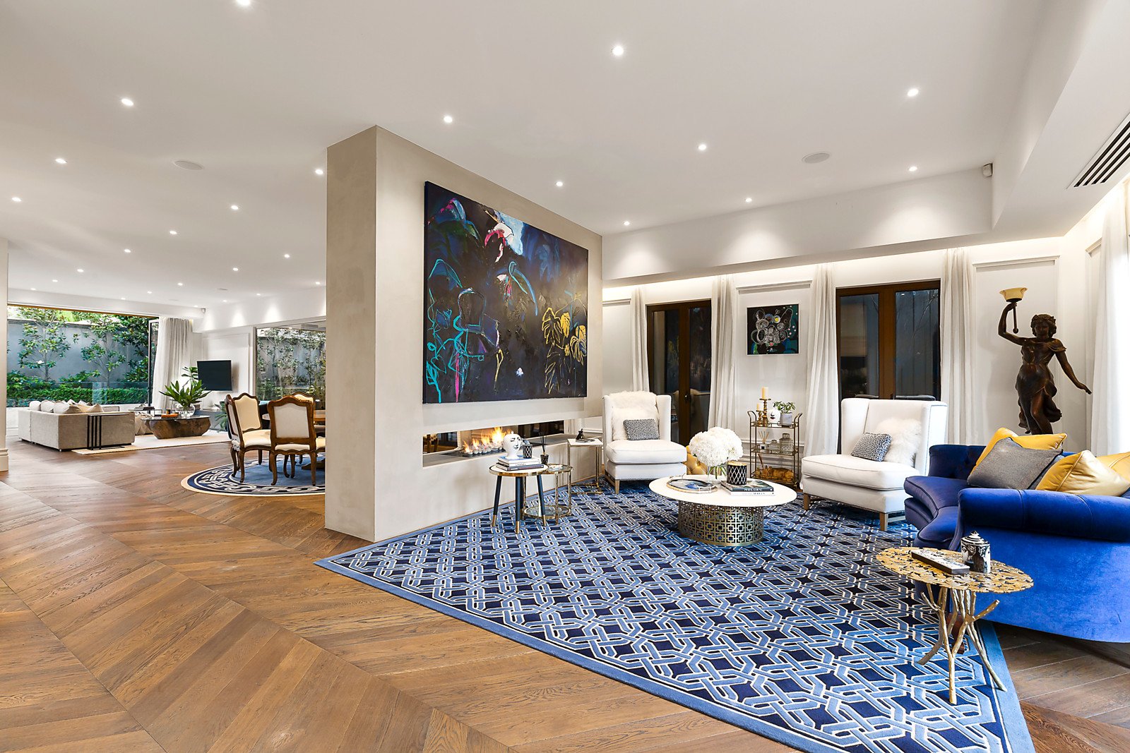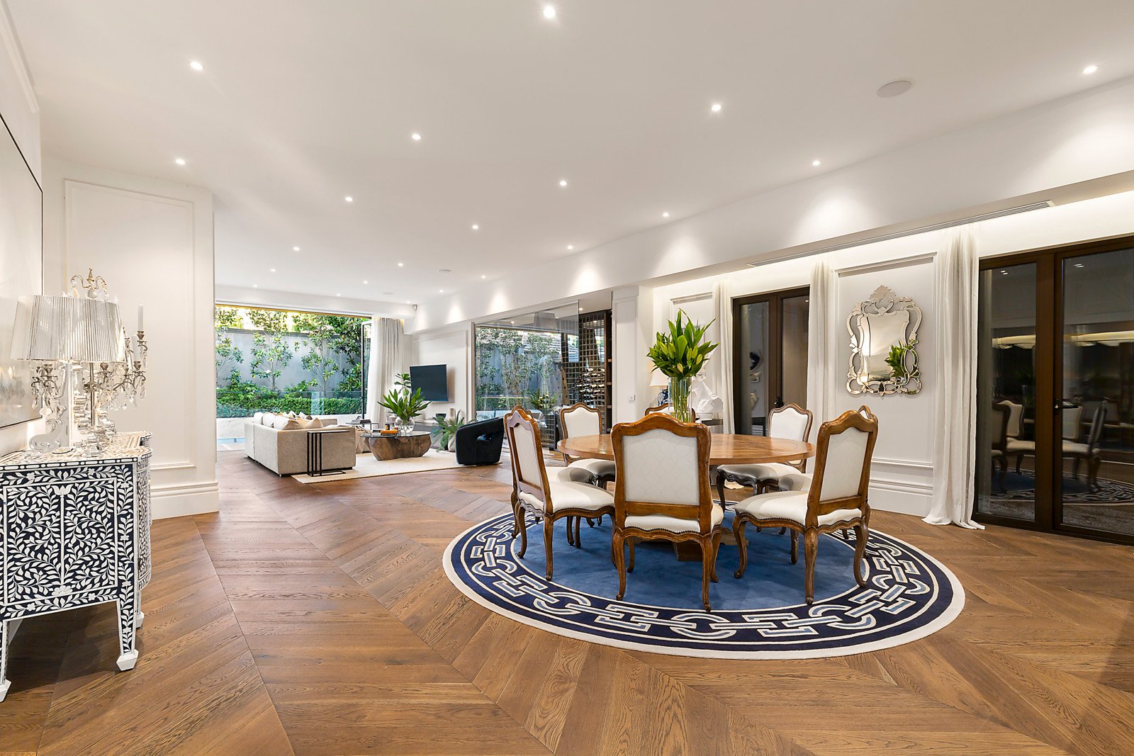 Herringbone parquetry floors, decorative paneled walls and high ceilings are highlighted in the expansive sitting room and beautiful formal dining room with a 2-way pebble fire and fabulous wine display room. The gracious study or library is an ideal home office with a discreetly concealed marble bathroom. Spectacular in scale, the sun-drenched open plan living and dining room features a state of the art marble kitchen boasting Gaggenau appliances including coffee maker and steamer, integrated Liebherr fridge/freezer and a butler's pantry. Bi-fold doors connect the living area completely to a stunning north-facing landscaped paved garden with self cleaning heated pool and a spacious covered al fresco terrace with full BBQ kitchen and TV. The opulent main bedroom with deluxe marble ensuite and walk in robe sets a benchmark in luxury that is matched by a second bedroom with lavish ensuite and robe, two additional bedrooms with robes and shared ensuite. A sensational home theatre, powder-room, laundry and 5-car garage are on the basement level.