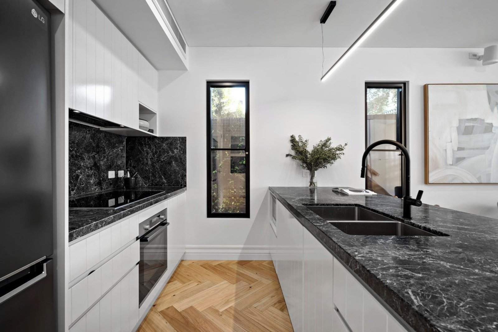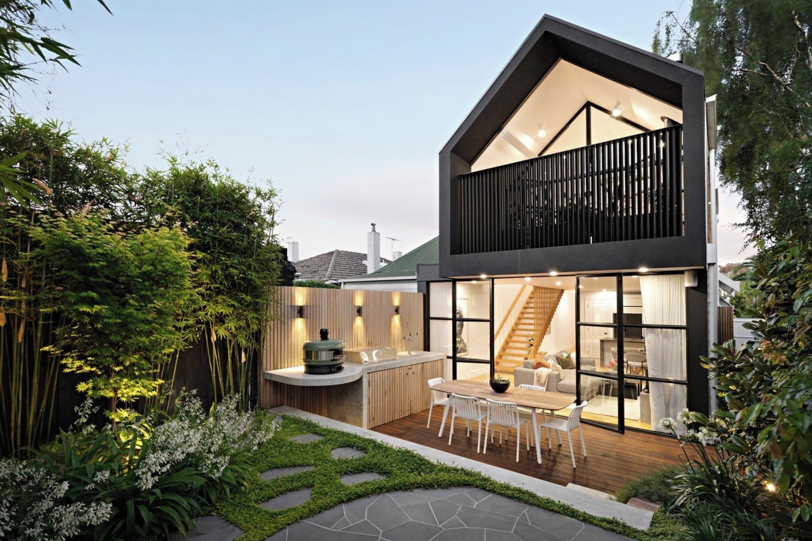 The wide skylit hall flows through to the sensational open plan living and dining room with a wood fire heater and a sleek gourmet kitchen appointed with lavish marble benches and Bosch appliances. Full width black steel framed doors open the living options to the glorious northwest facing landscaped garden oasis. It’s an entertainer’s paradise with large deck, bluestone sun-terrace and a fabulous built-in BBQ and keg fridge with beer on tap. The two generous downstairs bedrooms and a stylish bathroom are matched upstairs by the luxurious main bedroom suite with walk in robe, designer en suite, fitted study nook and a large undercover balcony with outdoor heater and speaker.